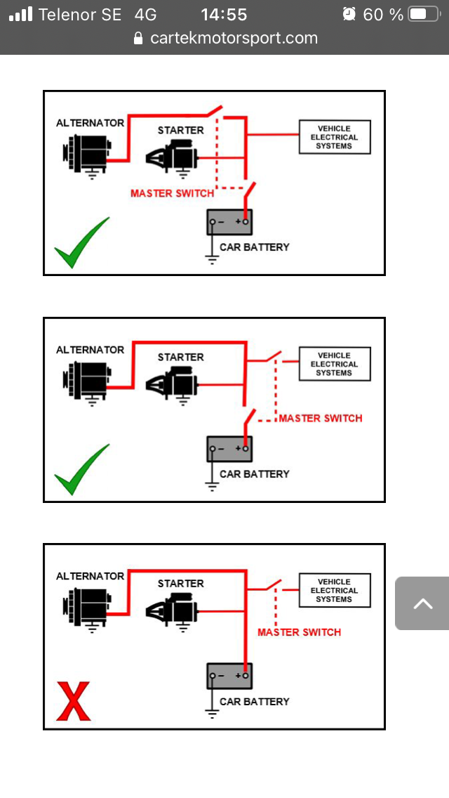 Måste få hjälp att förstå varför bild nr 3 inte är tillåten.. Så här, den tänkta bilen är helt analog, ingen elektronik förutom Tändmodul och bränslerelä som har några kloka kretsar i sig. Så i min värld om bilen kopplas enl bild 3 så dör bilen direkt? För jag klipper tändspole, bränslepumpar.. eller är det för att förhindra en möjlig batteri brand??   [/img]