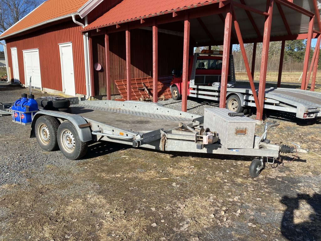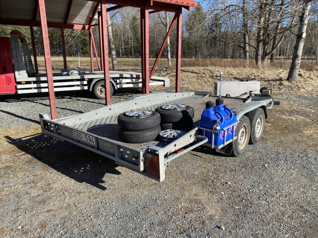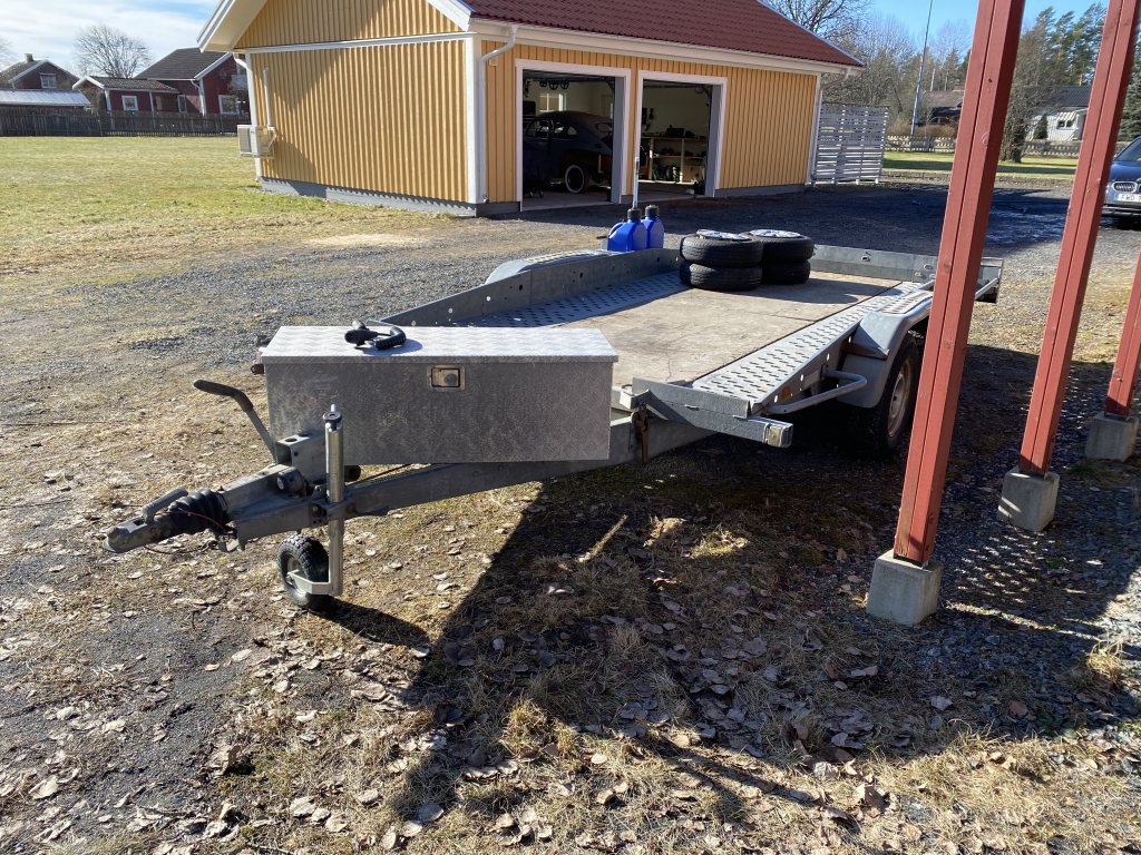 Thule AT200B från 2007 (Tip-släp). Superbra tip-släp som kan lasta låga bilar. Har använts för Roadsport C-Miata. För mått och vikter: Se bild. Rejält, stadigt och pålitligt släp som går stadigt och tryggt på vägen. Pris: 29 000kr. Besiktigad utan anmärkning Nyligen renoverade lager och bromsar Sommardäcken har gått ca 100mil. Som nya. Vinterdäcken också i mycket bra skick. Stor ALU-låda bultad på dragarmen. Låsbar hållare för bränsledunkar. Vinsch som funkar fint. Nytt stödhjul Släpet kan levereras inom vettigt avstånd.