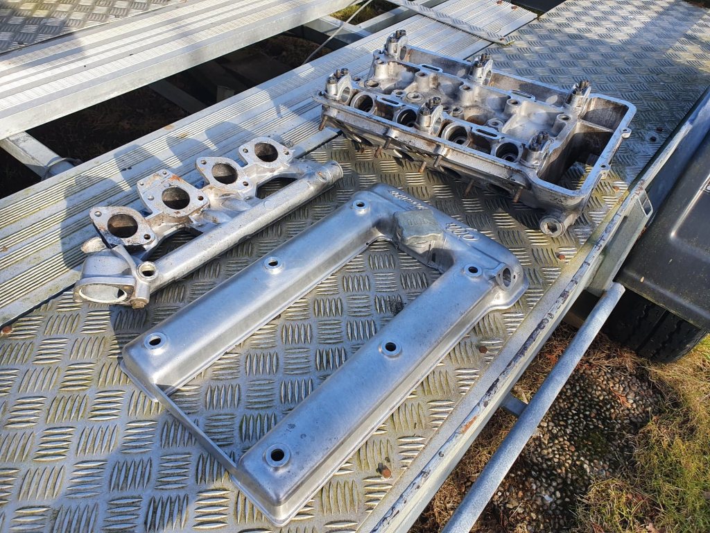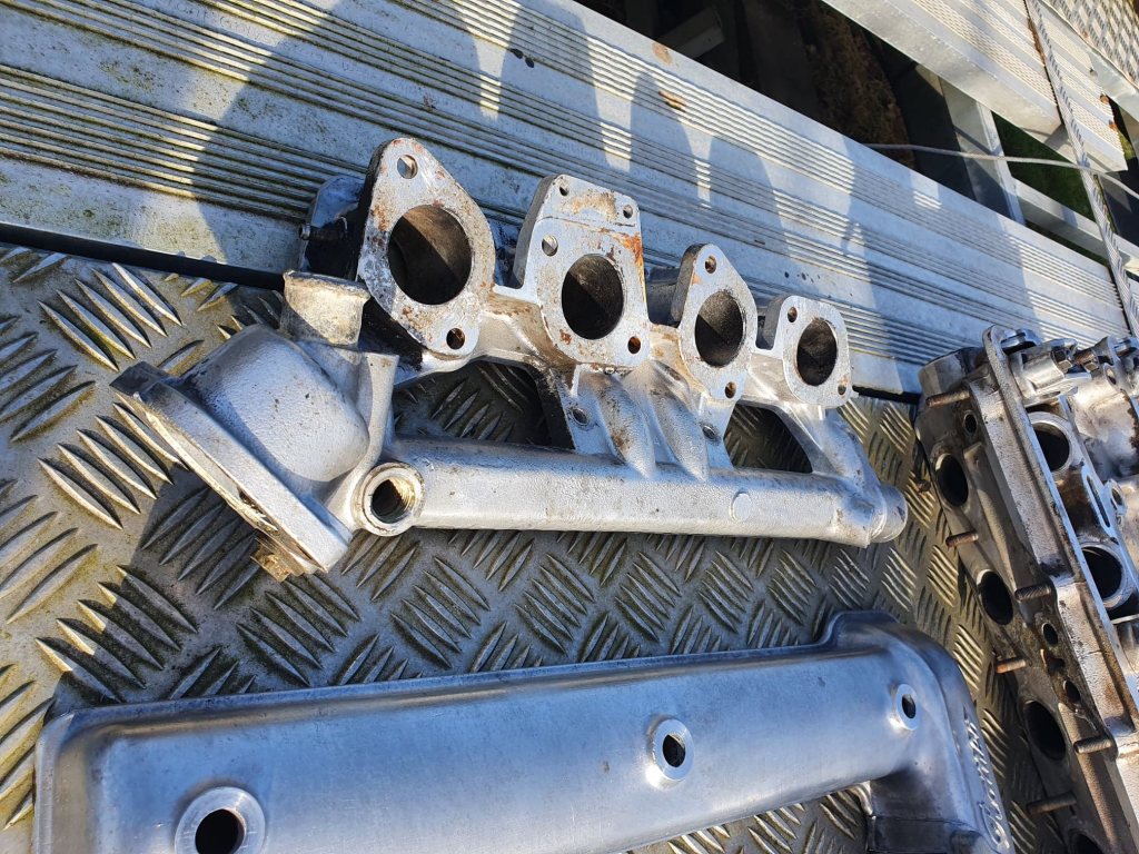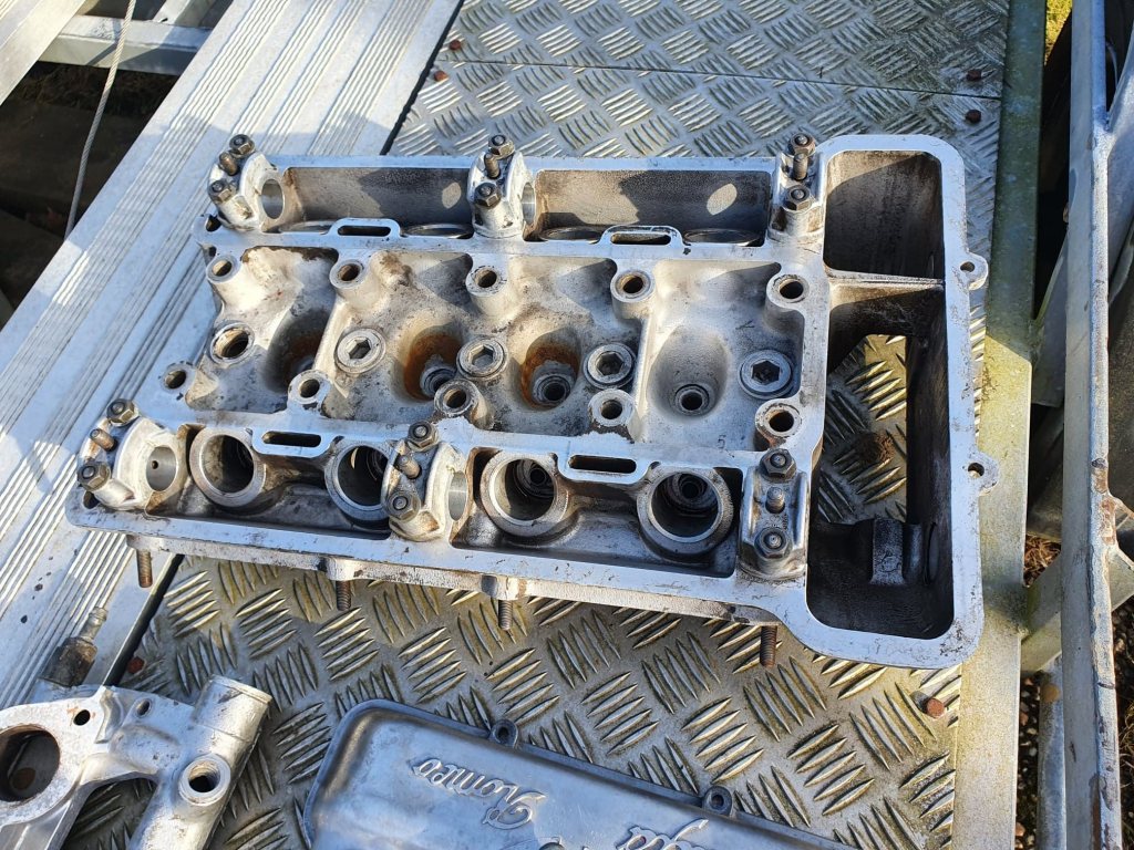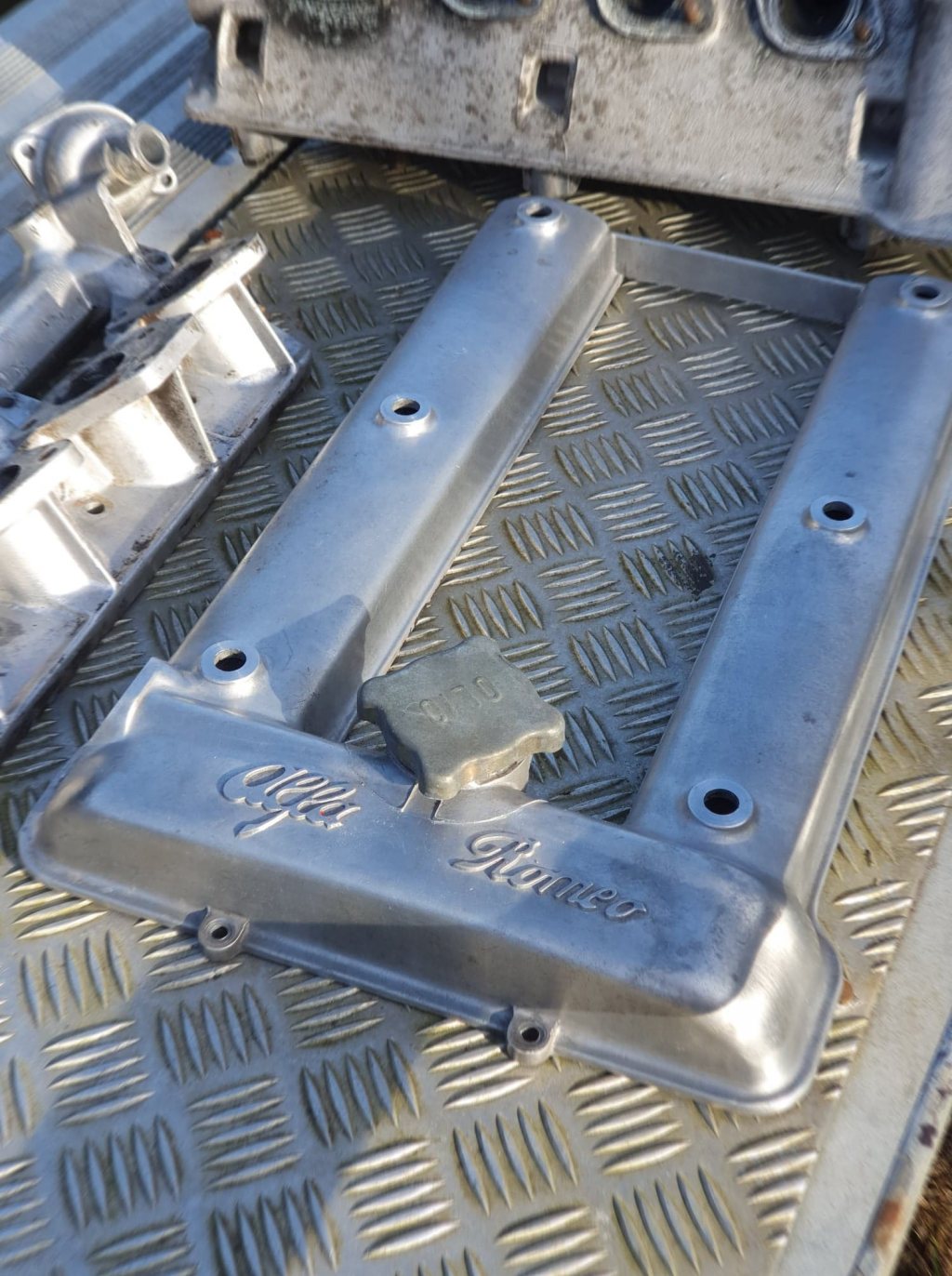 Garagestädning.. Säljer ett topp lock till Alfa Romeo 105-serien. Enligt märkningen är toppen från en senare modell av 1750cc. Topp säljs tillsammans med insugsrör och ventilkåpa. Inga ventiler eller tryckare i toppen som bilderna visar. Notera att bakre gängade pluggen för kylvatten är borta. Toppen var en reservdel till min tävlingsbil på 80 & 90-talet, men har inte använts av mig.