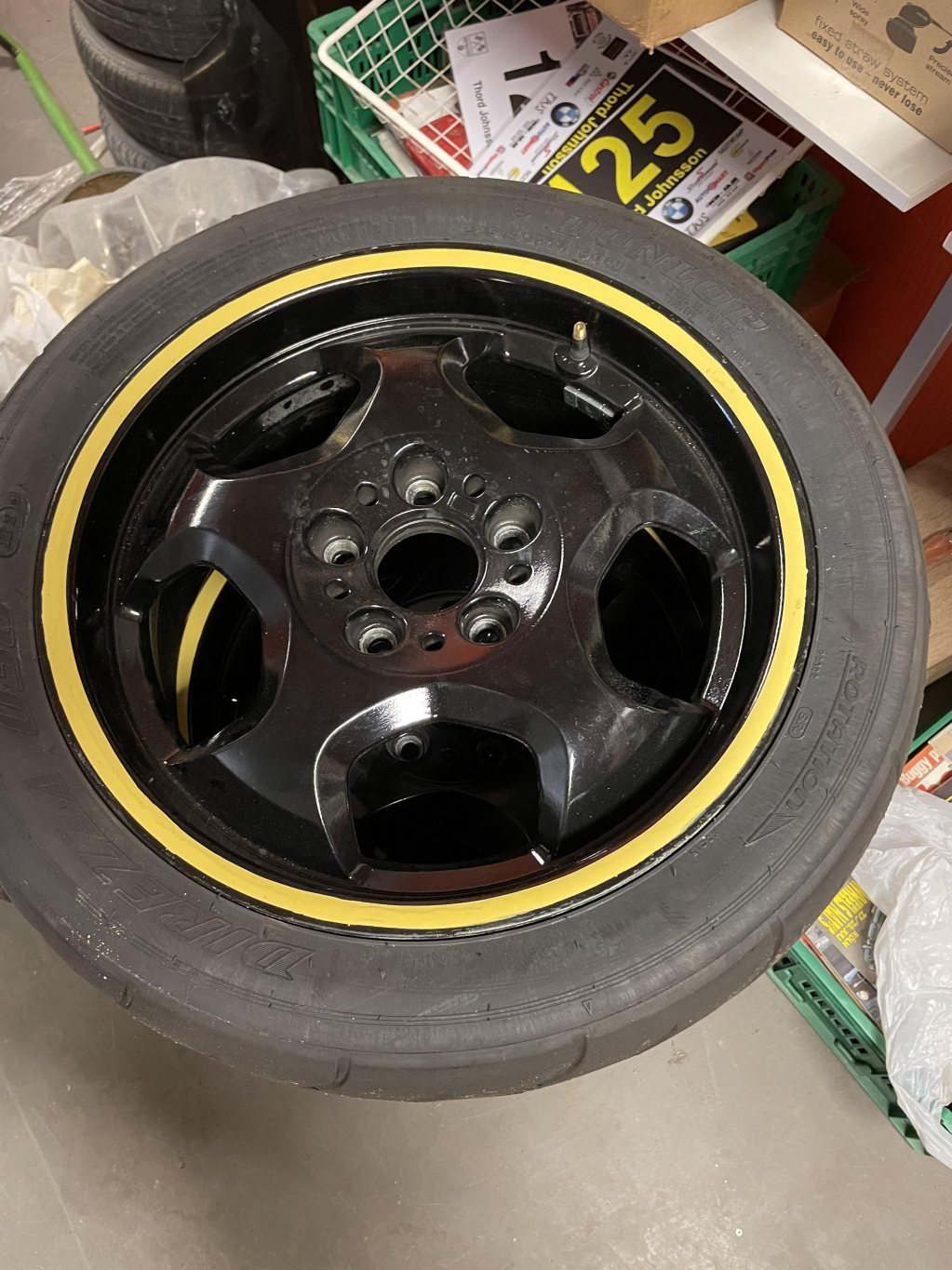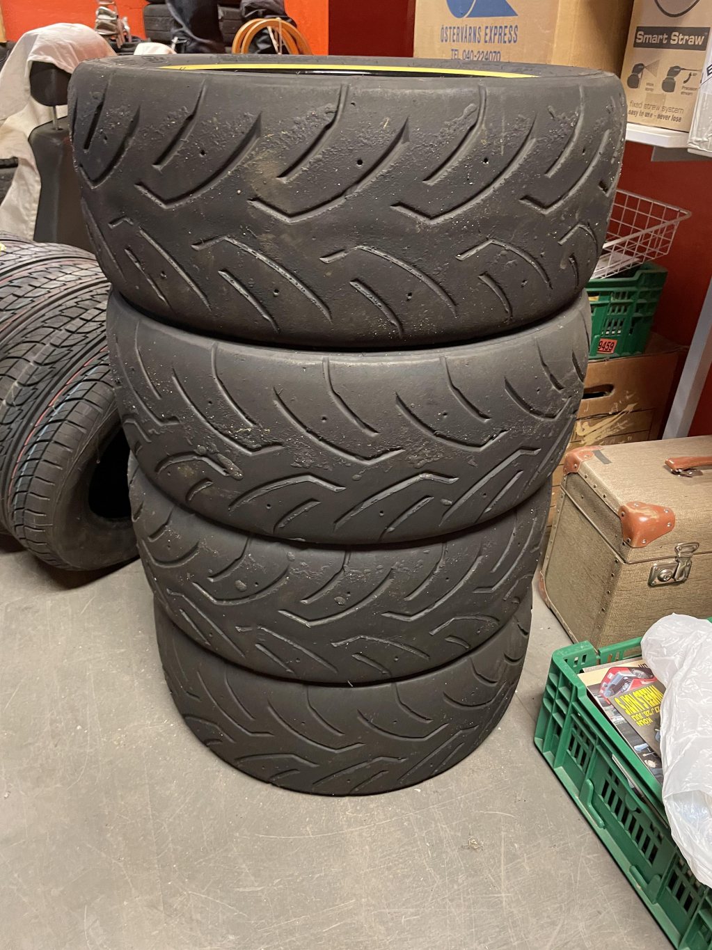 R-däck på BMW M3-fälgar. Legat lagrade mörkt och svalt i några år.
