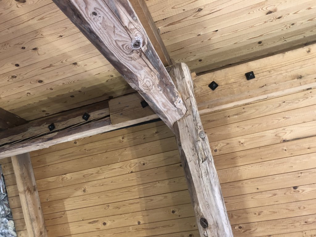 Huset har överlag klarat sig relativt bra under åren, men troligen har det stått tomt en tid i mitten på 1900-talet. Tittar ni på första bilden i min första post så kan man även sen att taket där hade fått sig en knäck. Troligen har det varit i dåligt skick, och i samband med att huset gjordes i ordning som sommarhus kring 1970 så har man bytt ut stora delar av takåsen i nock, samt monterat modern råspont på nya sparrar. Detta tak har sedan dess klarat sig fin-fint. När jag började gräva i takåsarna så kan jag dock på vissa lokala ställen hitta spår av gamla fukt/röt-skador, rimligen från tiden innan takbytet. Tog därför hit en lokal timmerman för lite konsultation, och hans analys var att det inte var någon strukturell fara, men att det inte var fel att byta ut det dåliga trät innan jag delvis kapslar in det i isolering. Exempel på skada: