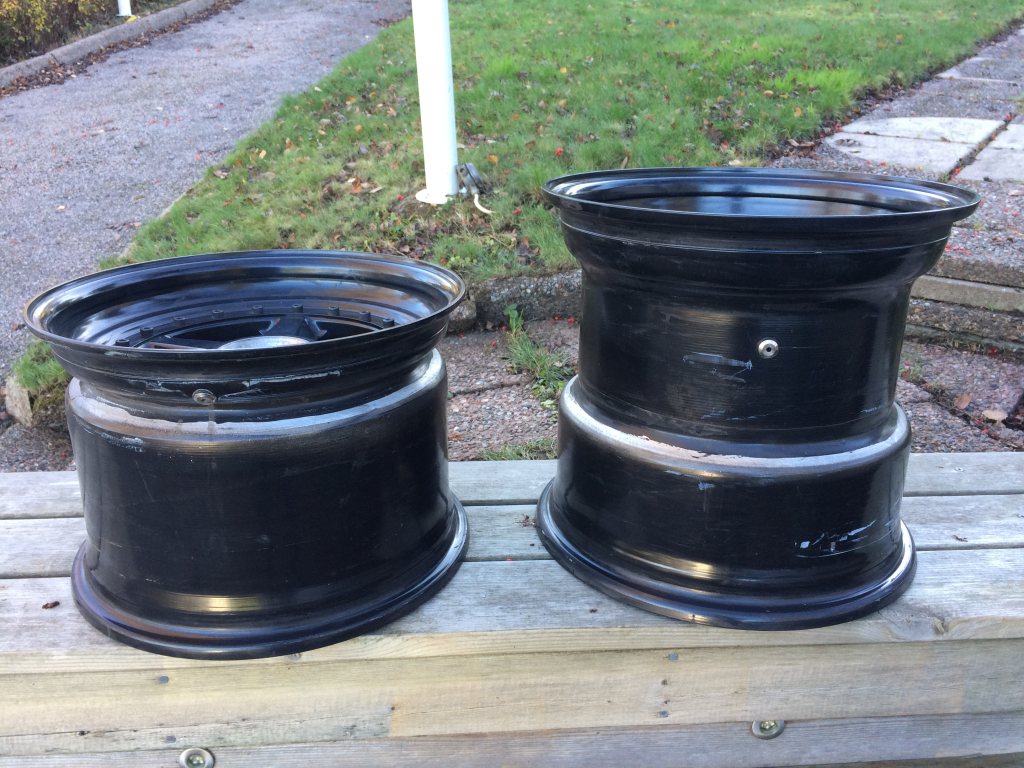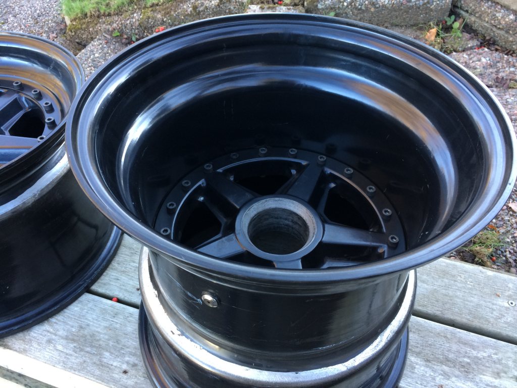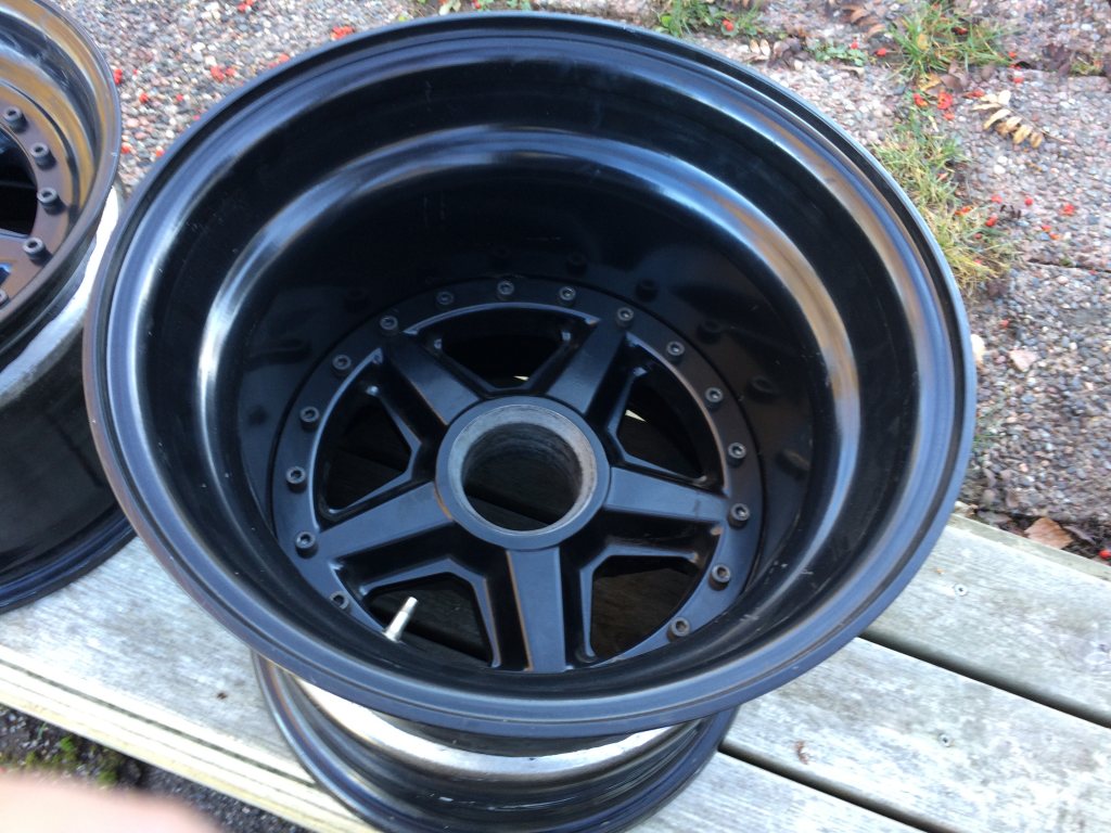 Tillverkade i USA för Bailey's i Sydafrika till deras replika 917. Mina som är till salu är 15 tum diameter. Fram 10 tum breda med 160 mm baksida. Bak 14 tum med 135 mm baksida. Med dessa följer adapters för centrumbult, som bygger 12 mm. Däck har varit monterade men fälgarna är inte körda. Innehåller fyra fälgar, fyra adapters med centrum mutter och pegs. Säljes för 55 tusen sek. Frakt inom Sverige ingår.