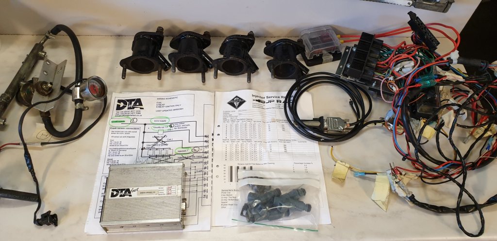 Fristående tändsystem som suttit i min1750 GTV med 2.0 l Nordmotor. Fungerade bra men har bytt till förgasare. Kan också användas på valfri 4-cylindrig motor. Följande ingår: - DTA box, uppkopplingsbar via USB - Kopplingsschema - Kabelhärva, uppmärkt - Elcentral med relä, säkringar (ursprung Alfa 75, TS) och kopplingsplint - Insugningsrör med hål för spridare, koniska 48 mm mot trottel body/förgasare och 40 mm mot topplock. (Andävde Delllorto 48 som spjäll, funkade fint) - 4 st sprdare, 390 cc, servade och därefter aldrig använda - Givare för triggerhjul - TPS - Tryckregulator, pulsdämpare, fuel rail, manometer (ursprung Alfa 75 TS) - Tändspole För att få det komplett behöver man skaffa: - Triggerhjul - Tempgivare (anslutning finns) Säljer allt i ett paket, inga lösa delar. Pris 4500 kr, kan skickas med spårbar frakt, köpare betalar frakt.