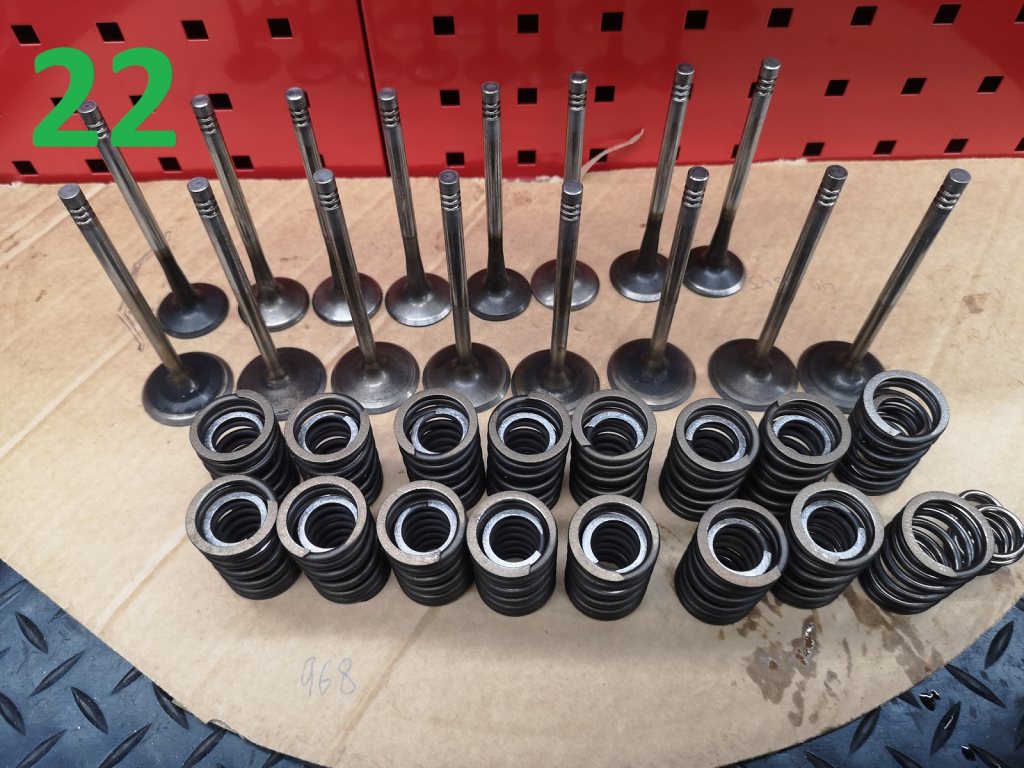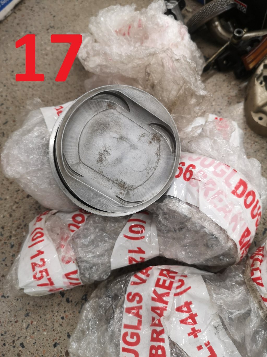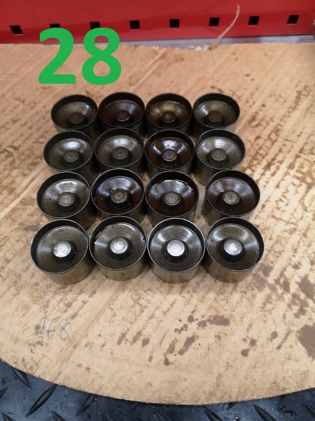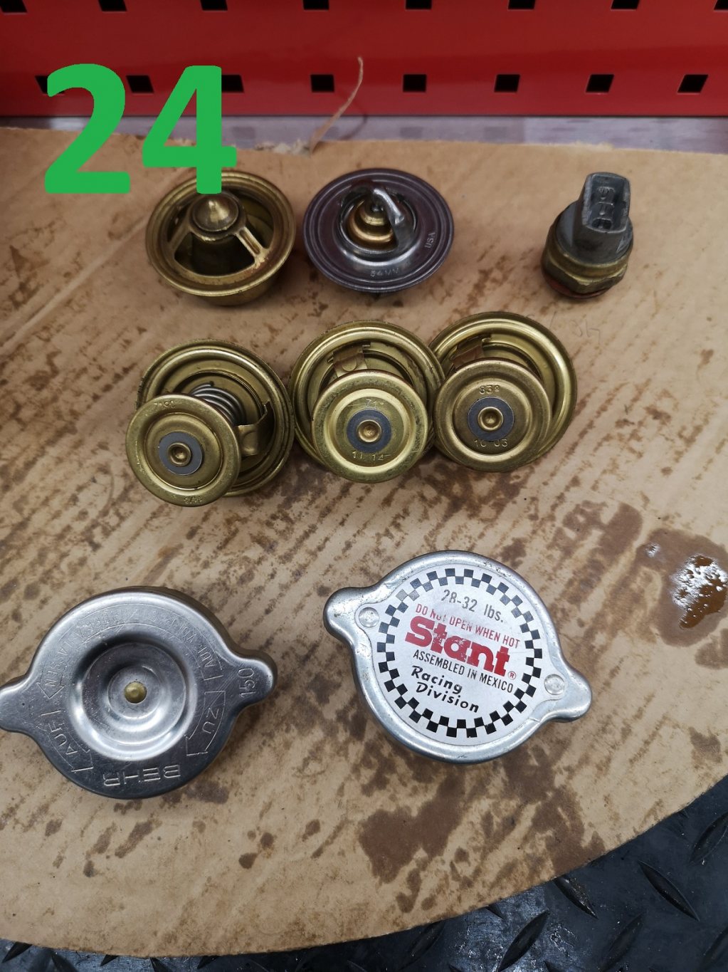 Kompletta stakar och kolvar Kamkåpor & fördelare Kamkedjespännare De flesta bultar till bottendel + topp/kammar 18. 944 S2 & 968 täcklock för topp: 4st avgaslock 3st insugslock 19. Oil pan gasket retainers. För att minska risken att oljetrågspackningen trycks ut. För 944/968 20. Topplockspackningar: Cometic MLS för 2.7/3.0l 105.5mm 0.051" (2st) Cometic MLS för 944 2.5l 100.5mm 0.060" Porsche original för 2.7l, 944 S2 och 968 (3st) Porsche original för 944 Turbo 21. Insugsventiler 944 Turbo (45mm). 6 st. 22. Komplett uppsättning ventiler till 968 (39/33mm) med ventilfjädrar. Kommer från en fungerande motor. En inre ventilfjäder trasig. 23. Komplett uppsättning ventiler till 968 (39/33mm) med Lindsey Racing beehive ventilfjädrar med chromoly retainers. Kommer med knaster. Kommer från en motor med 600+ hk. 24. 4st 71 graders termostater. 1 st 83 grader. 1 original lock expkärl och 1 Stant 2 bars lock. En original fläktswitch (sitter i kylaren). 25. 8st lyftare 8v 26. 8st lyftare 8v, set nr 2 27. 16st lyftare 16v 28. 16st lyftare 16v, set nr 2