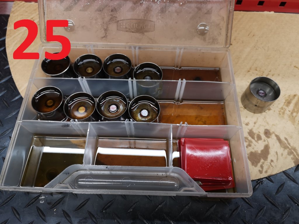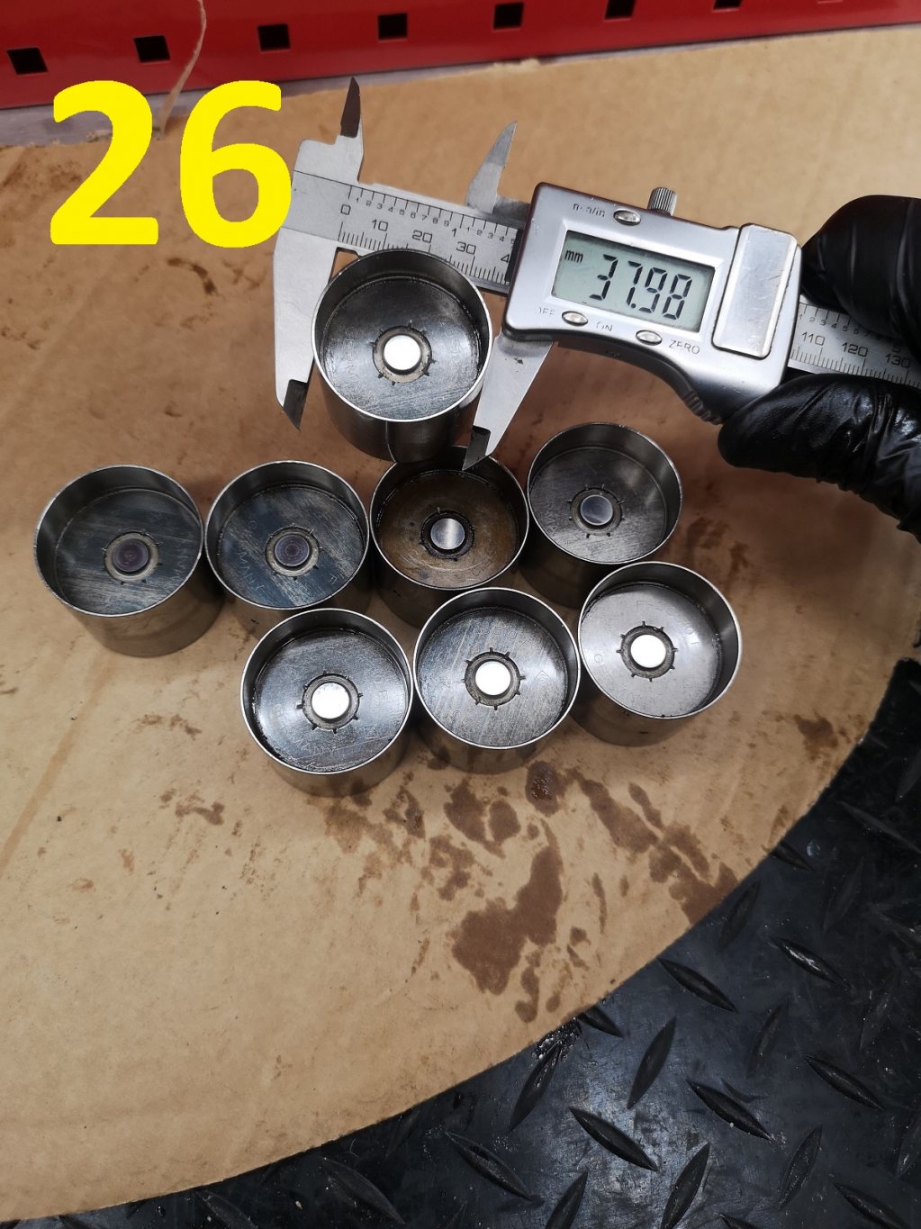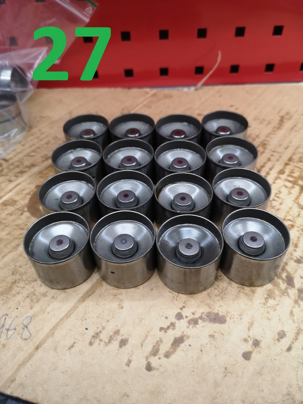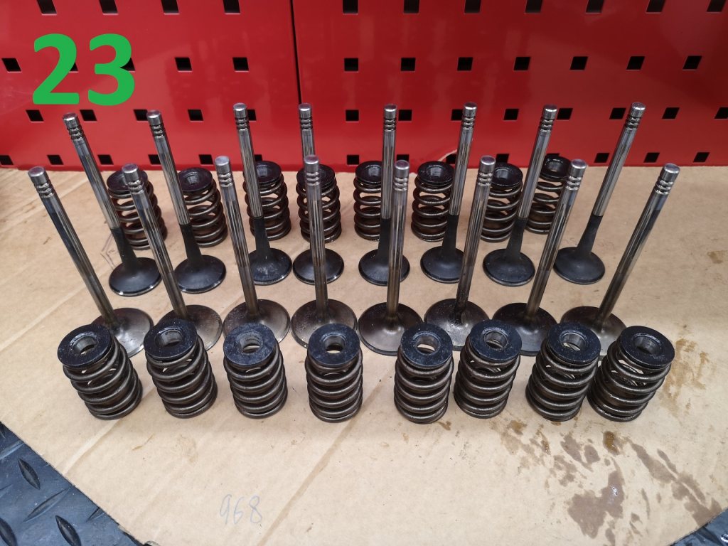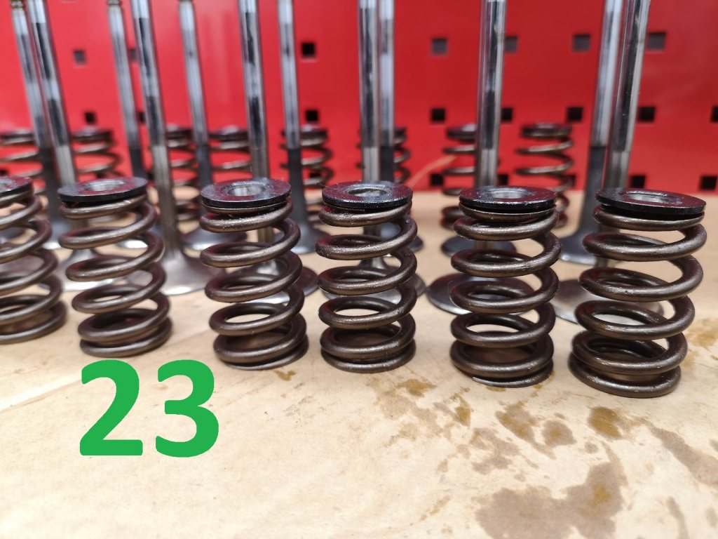 Kompletta stakar och kolvar Kamkåpor & fördelare Kamkedjespännare De flesta bultar till bottendel + topp/kammar 18. 944 S2 & 968 täcklock för topp: 4st avgaslock 3st insugslock 19. Oil pan gasket retainers. För att minska risken att oljetrågspackningen trycks ut. För 944/968 20. Topplockspackningar: Cometic MLS för 2.7/3.0l 105.5mm 0.051" (2st) Cometic MLS för 944 2.5l 100.5mm 0.060" Porsche original för 2.7l, 944 S2 och 968 (3st) Porsche original för 944 Turbo 21. Insugsventiler 944 Turbo (45mm). 6 st. 22. Komplett uppsättning ventiler till 968 (39/33mm) med ventilfjädrar. Kommer från en fungerande motor. En inre ventilfjäder trasig. 23. Komplett uppsättning ventiler till 968 (39/33mm) med Lindsey Racing beehive ventilfjädrar med chromoly retainers. Kommer med knaster. Kommer från en motor med 600+ hk. 24. 4st 71 graders termostater. 1 st 83 grader. 1 original lock expkärl och 1 Stant 2 bars lock. En original fläktswitch (sitter i kylaren). 25. 8st lyftare 8v 26. 8st lyftare 8v, set nr 2 27. 16st lyftare 16v 28. 16st lyftare 16v, set nr 2