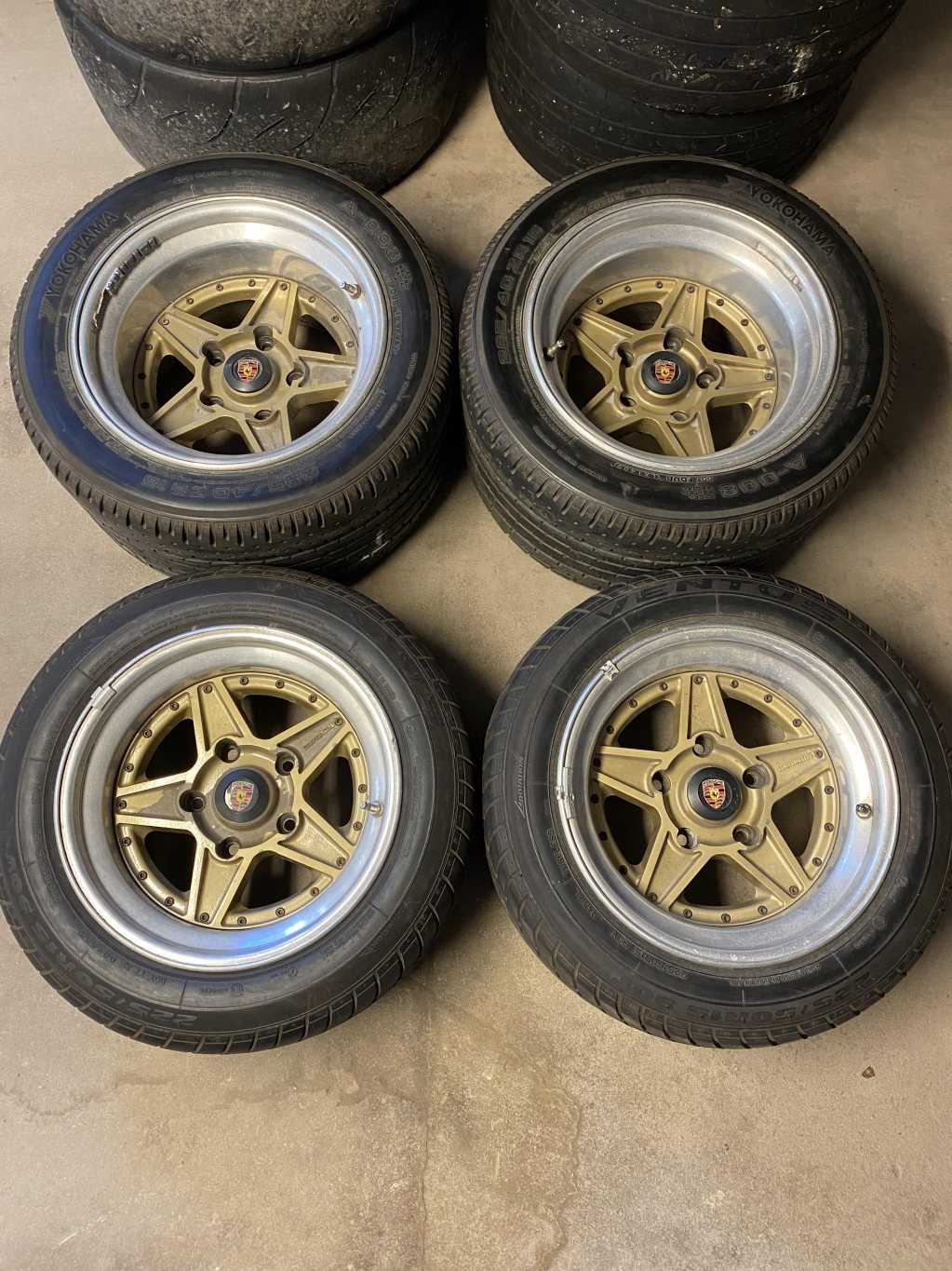 4st Compomotive FH500 splitfälgar till Porsche, bultdelning 5x130. Sitter bra på turbobred 911 eller rsr bred bil. 225/50-15" fram. Bra med mönster men äldre däck. 285/40-15" bak godkända men äldre däck. Finns för avhämtning i Alunda utanför Uppsala. Kan bytas emot breda 18" Porsche fälgar.