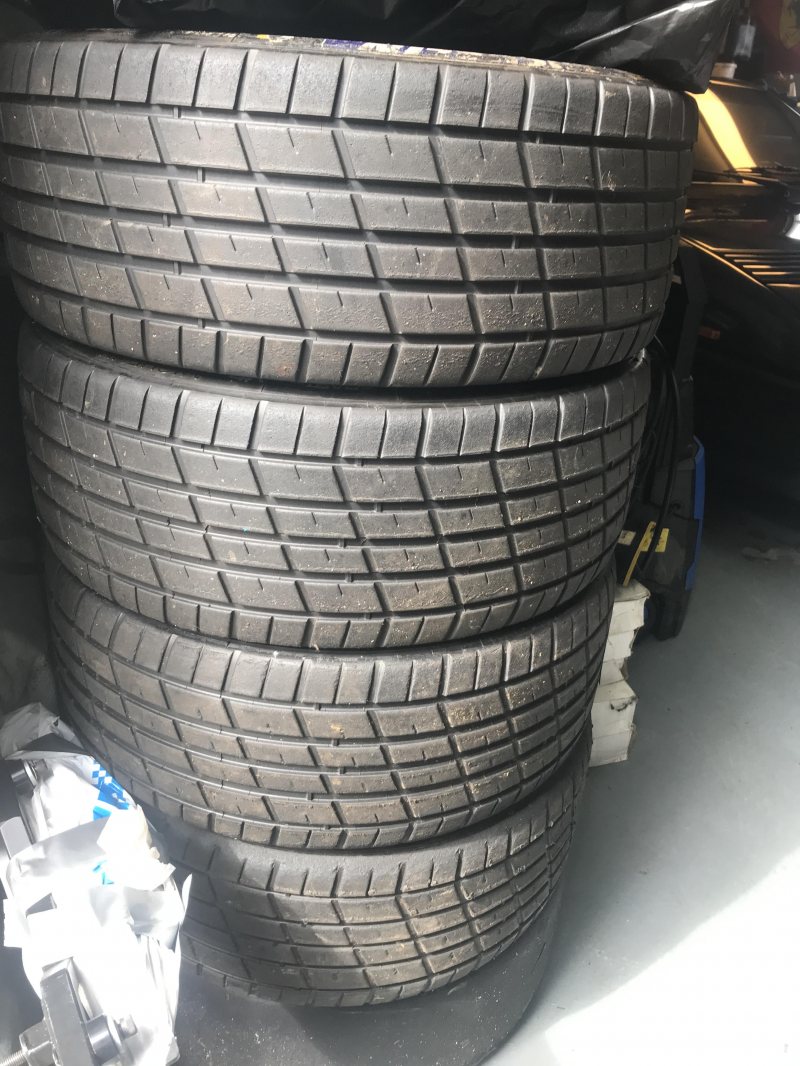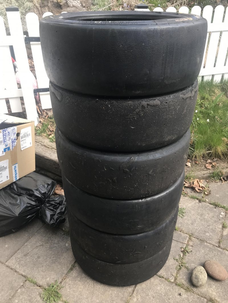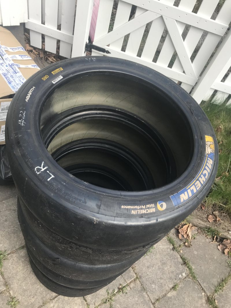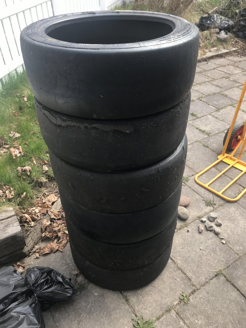 6st Michelin slicks 210-40/17 *SÅLDA* 4st Michelin regndäck 210-40/17 *SÅLDA* Dessa däck följde med min Abarth när jag köpte den för två år sen så jag vet inte historiken förutom att de använts på denna bil. Har själv kört ett par test- & träningssessioner på fyra av slicksen och de funkade fint. Regndäcken har jag inte använt. Alla däck höll luften innan de demonterades från fälg. Se bilder för uppfattning om skicket. Pris: 6st slicks 3000kr *SÅLDA* 4st regndäck 2000kr *SÅLDA* Finns i Stockholm / Älvsjö, skickas helst inte... Det är trångt i garaget så snabb upphämtning har förtur ifall flera är intresserade!