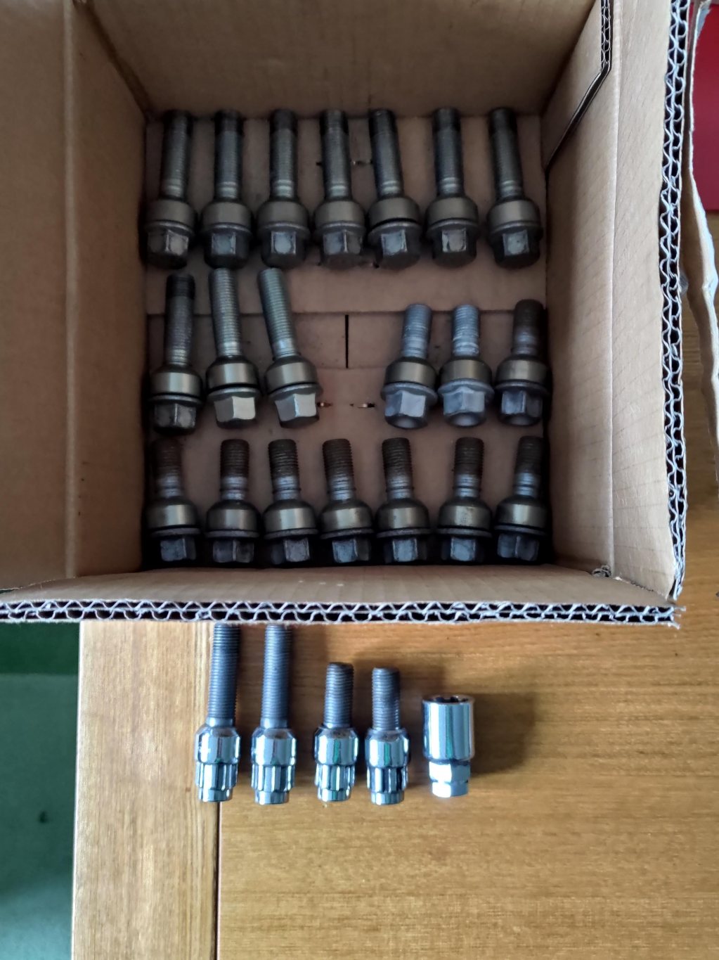 En axelsats (10 st) hjulbultar till Porsche (M14x1,5 med radiesäte) i standardlängd säljes. De längre bultarna på bilden är sålda.