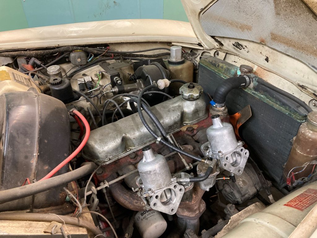 * Lite spruckna dörrhandtag. * Förardörren säger 'knäck' på ett ställe när man öppnar den. * Toppen är inte omgjord för blyfritt * Lampan till ena strålkastaren har gett upp. * Saknar batteri. * Liten lackskada vid kofångare fram Startade utan problem för två år sedan när vi flyttade mellan garage. Gick att bromsa utan problem oxo. Tror den är delvis omlackad. Jag har under vintern renoverat förgasarna, nya nålar och ultraljudstvättat dom. Inte riktigt klar att plocka ihop det sista och synka dom. Bytt någon meter bränsleslang och kylarslangar. Det som är kvar att göra är plocka ihop länkage till förgasare korrekt och man bör byta kylarlock. Kylaren ser risig ut men håller tätt. Ett oljebyte är nog på sin plats. SVIS hade ingen kylare kvar , har frågat dom. Har renoveringskit till förgasarna från SU i england samt ett oljefilter liggandes. Garaget är inte alls på samma plats som där jag bor. Pris: 300 000:- eller bud. Byte kan va intressanta, M3/911/Brabus osv.