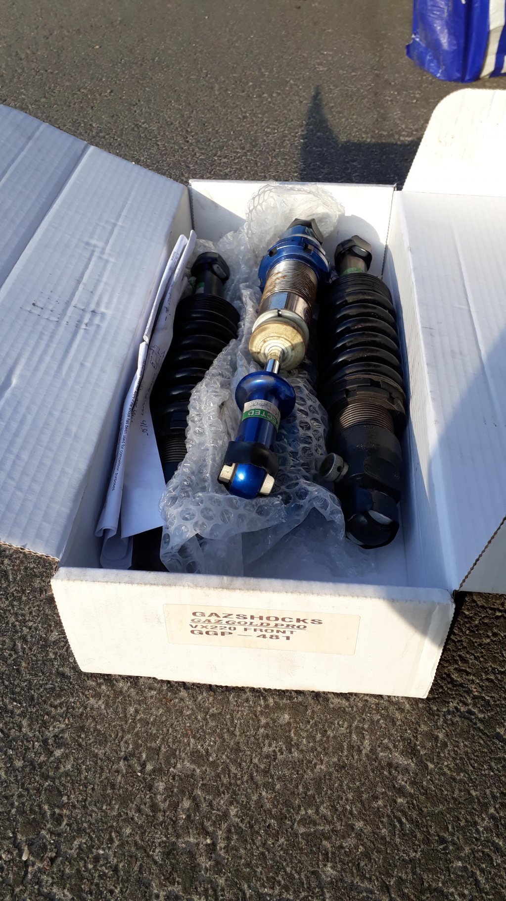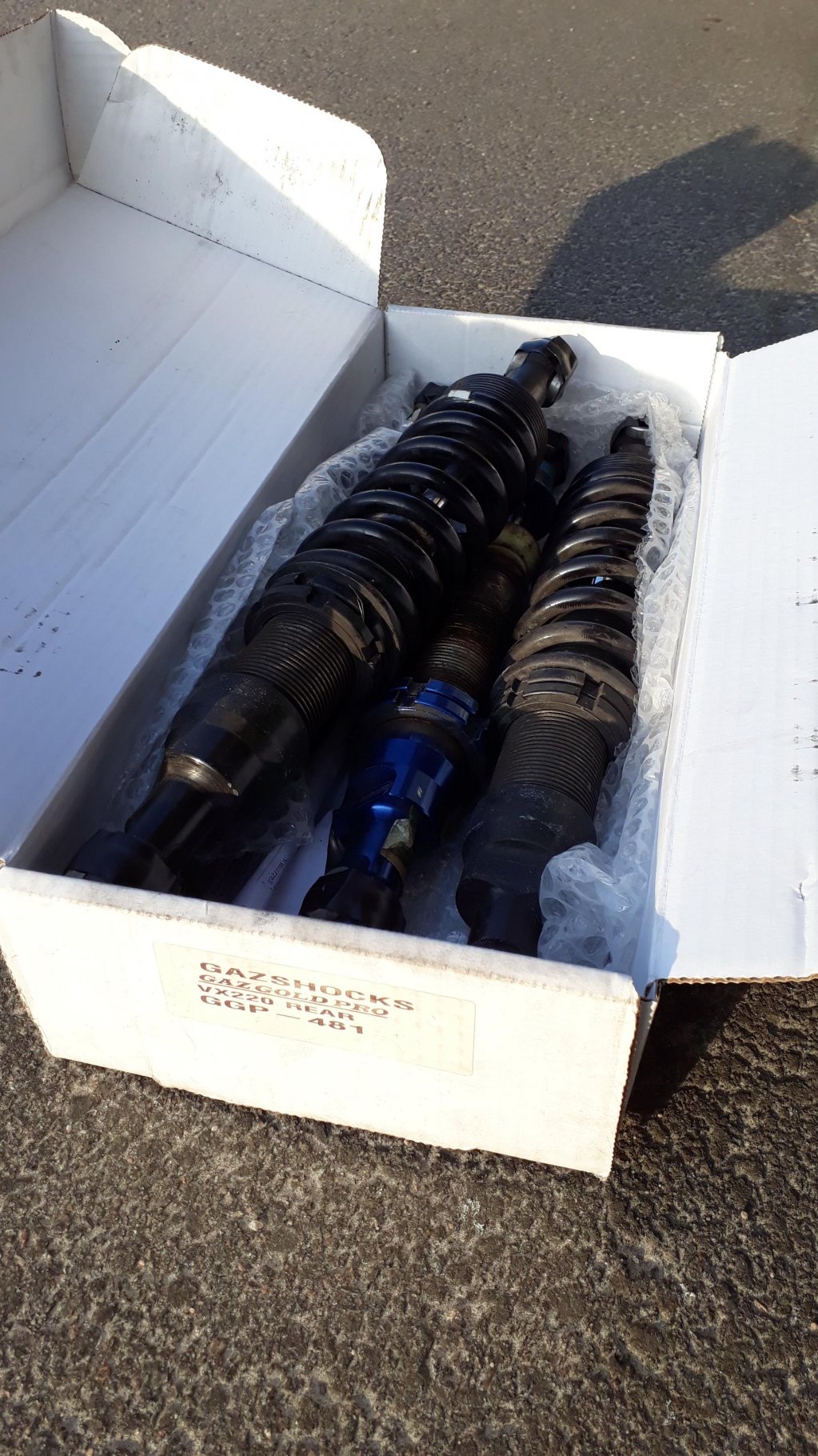 GAS-dämpare som också suttit på en Opel Speedster med hjälpfjädrar. Framfjädern: 375 lbs (65,7 N/mm), bakfjädern: 450 lbs (78,8 N/mm). Inställningsskruven på GAS-dämparna är trög och kan behövas smörhja upp för att kunna skruvas från ändläge till ändläge. Pris idé 400 kr. Allt hämtas i Varberg, sänd PM. Hälsningar RaceJo