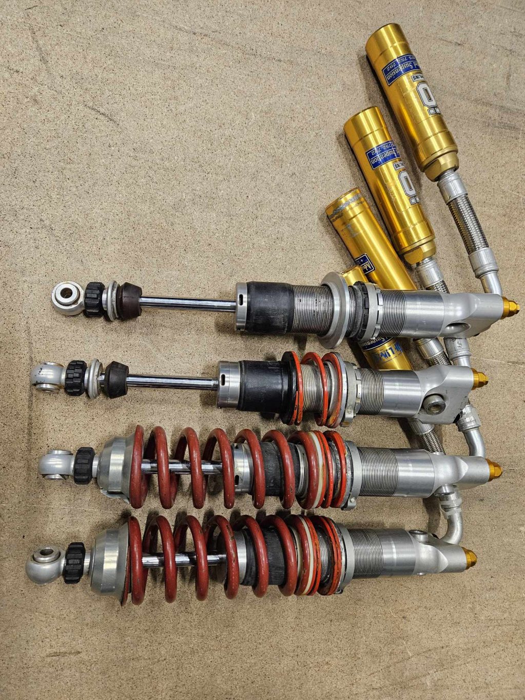 Öhlins 3-vägs Aluminium ( lätta) Öra-öra i båda ändar Separata behållare Fjädrar till 2 av dem 445 mm mellan fästhål c-c Borde passa något rejsabygge med dubbla a-armar , jag har liknande på min Lotus jag byggde en gång Har inte bra bils nu men lägger in sen 0763091088 så har jag nånnbild nu iaf Tänker 20 tusen _________________ emil andreasson |