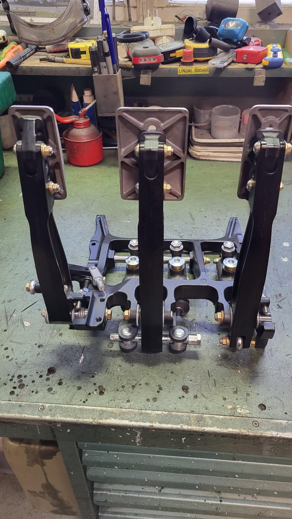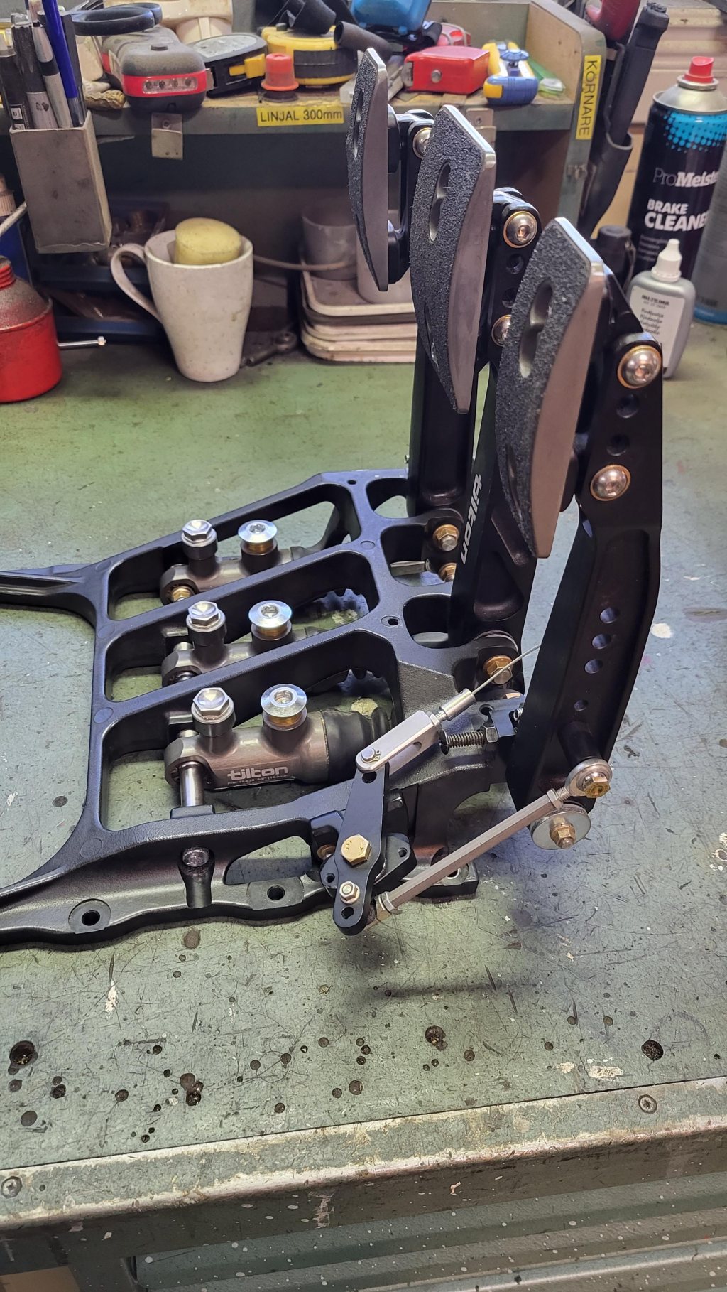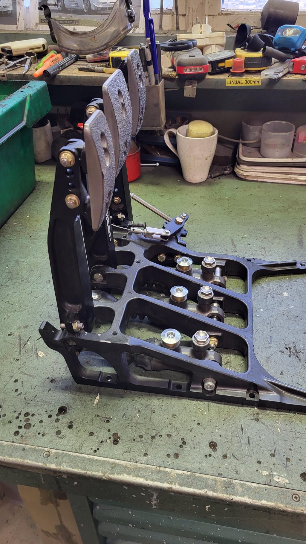 Har ett superfint pedalställ från Tiltons lite värre 850-serie som har pivå-upphängda cylindrar för bättre känsla och kontroll (lägre friktion). Modellen heter 72-856 och finns tex här: https://acm.se/category/936/product/ Klippt ur deras beskrivning: - High-efficiency balance bar and pivot-mount master cylinders design - Forged aluminum pedals engineered for high rigidity and low weight - Adjustable pedal ratio (4.8:1 to 6.1:1) enables the brake pedal to be tuned to driver preference without having to change master cylinder bore size - Foot pads can be adjusted vertically, horizontally, and in angle to suit individual driver preferences - Lightweight and high-strength aluminum frame - 7/16" diameter balance bar provides maximum rigidity. PTFE coated aluminum clevises allow for increased durability and reduced friction - Pedal pivots feature wave washers to reduce lateral pedal movement and oil impregnated bronze bushings decrease stiction - Throttle linkage kits options for mechanical linkage and Drive-by-Wire systems (sold separately) Pedalstället är komplett med 3st cylindrar från 78-serien, länkage för gaswire och "false floor kit" = aluplåt att ha fötterna på över cylindrarna. Cylindrarnas storlekar är 5/8" (15,9mm), 7/10" (17,8mm) och 13/16" (20,6mm) 78-Series Master Cylinder Features: - Billet aluminum body with proprietary low‐friction coatings minimize wear and provides smooth operation - Rear spherical bearing mount and one‐piece piston/pushrod eliminates side thrust into the master cylinder bore, providing consistent and repeatable braking - Hand‐built and blueprinted for cut‐off port travel - External dust boot included - O‐ring seal at the main rod guide and body interface - 1.1" of stroke - AN3 outlet port and AN6 inlet port - 7 bore sizes available - Fits Tilton 800-Series and 900-Series pedal assemblies - 3/8"-24 pushrod Pedalstället har endast varit provmonterat i bil och är därmed i nyskick. Nypris komplett: drygt 30.000kr Mitt pris: 15.000 kr SÅLT!! Första kontakt via PM.