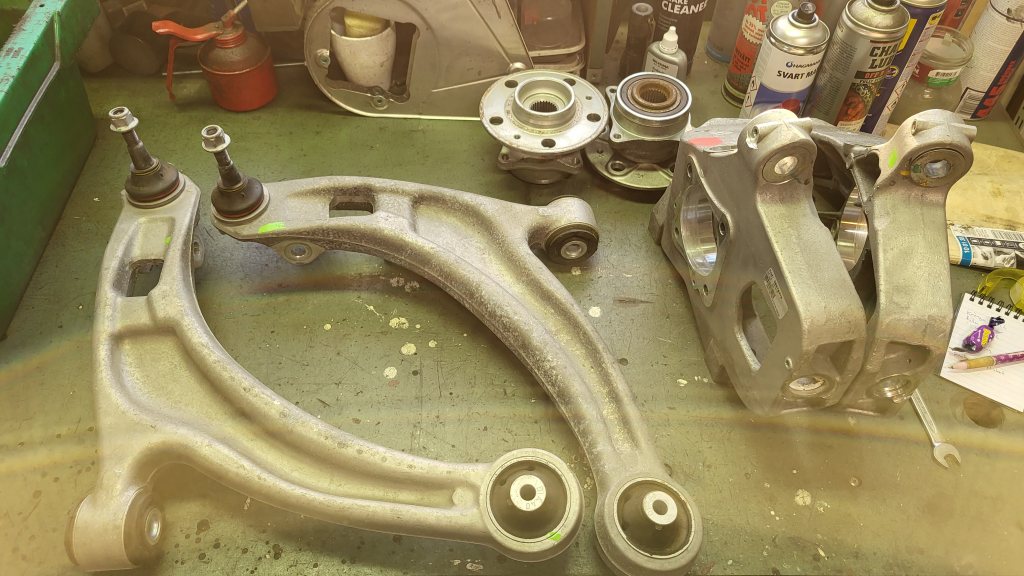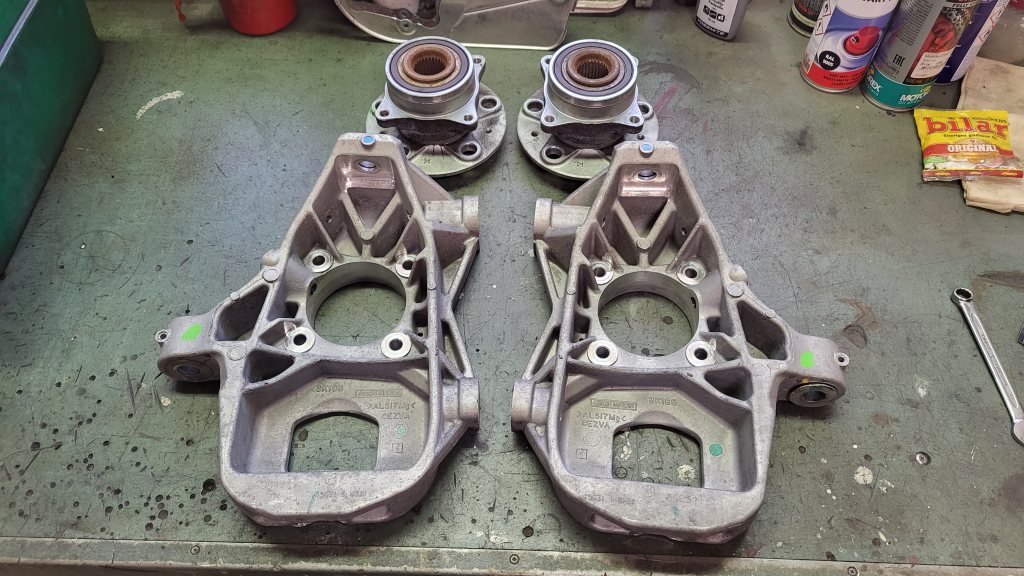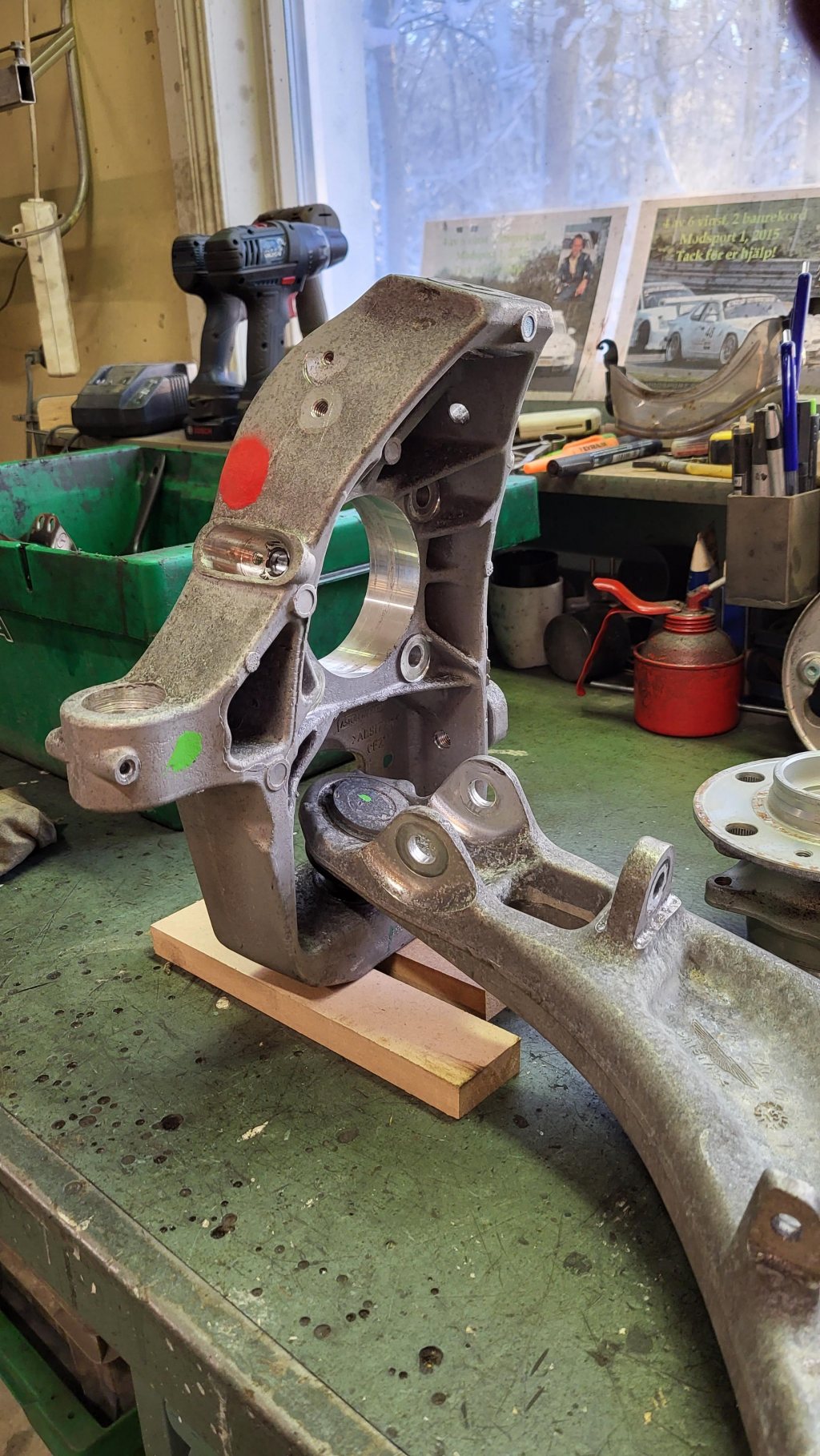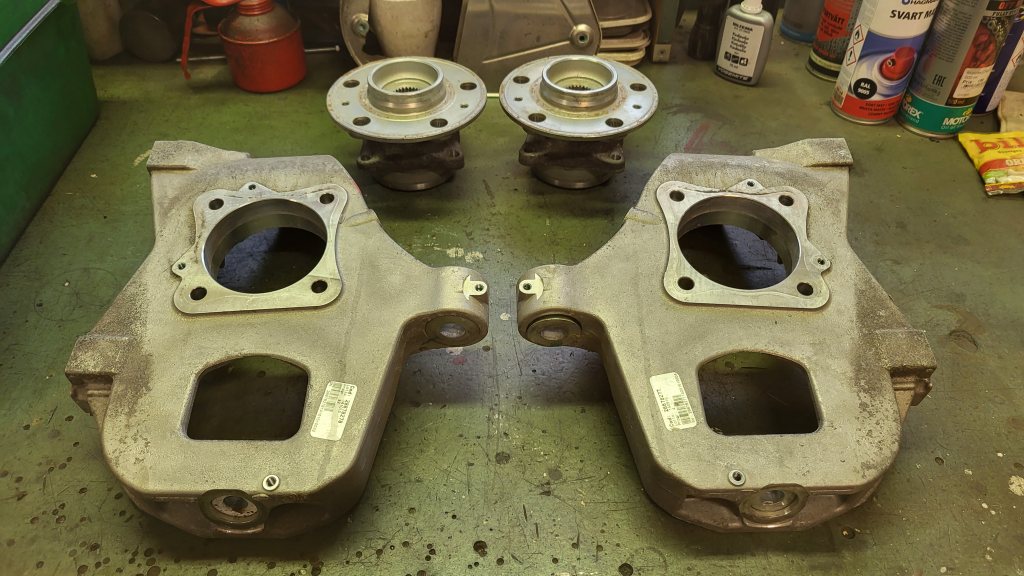 Har två spindlar med hjullager/nav och undre bärarmar i nyskick till Aston Martin Vantage 2016 som endast gått 697mil. Perfekt för bygge av lite större rejsbil, då dessa klarar att hantera stora krafter från breda slicks. Hade tänkt göra egna övre bärarmar, men vill man köra standard så finns dessa kvar på skroten från samma bil: https://www.bildelsbasen.se/sv-se/pb Fästen för radialmonterade bromsok med 200mm c-c mått. Pris: 10.000kr för allt Första kontakt via PM