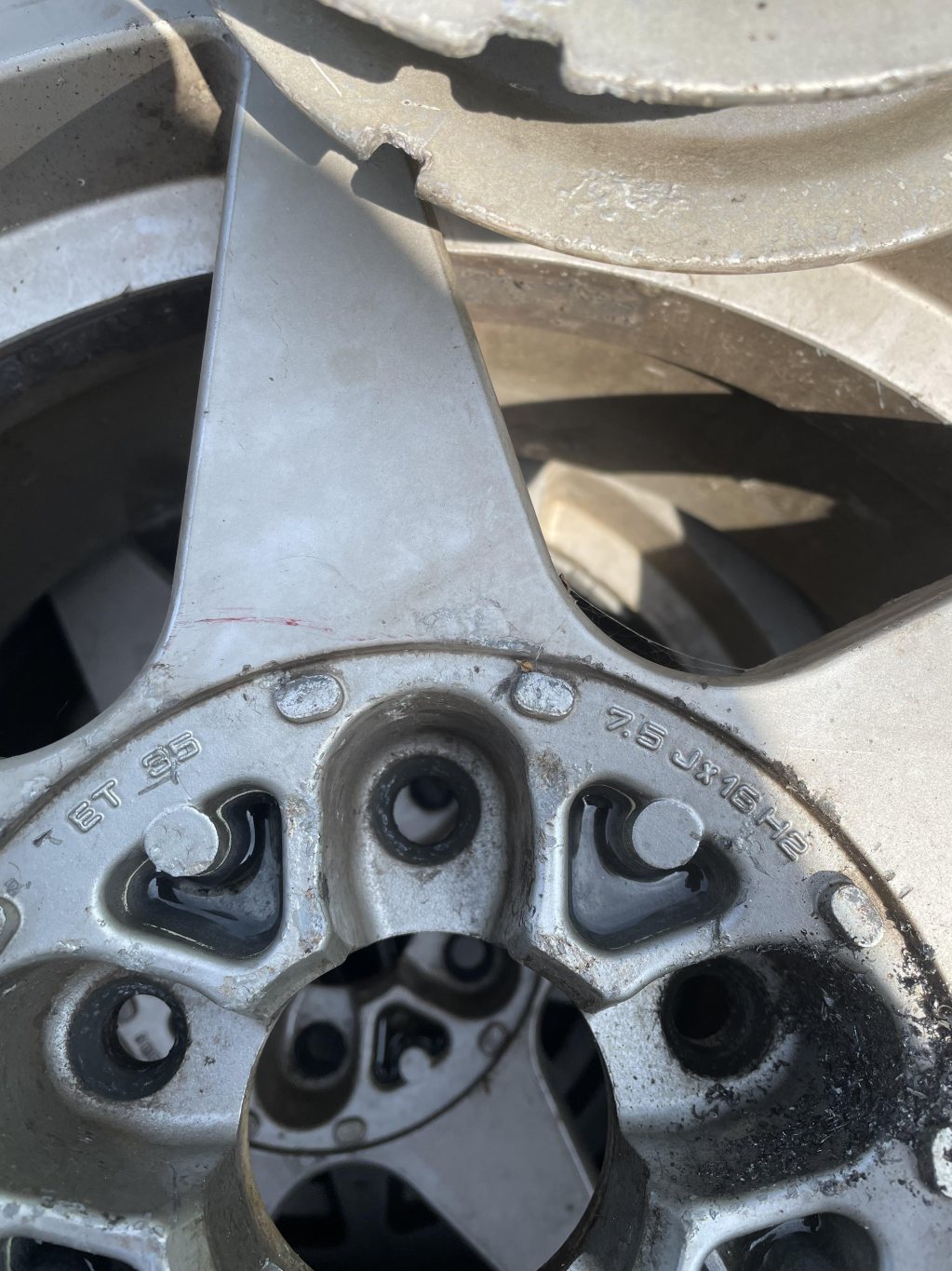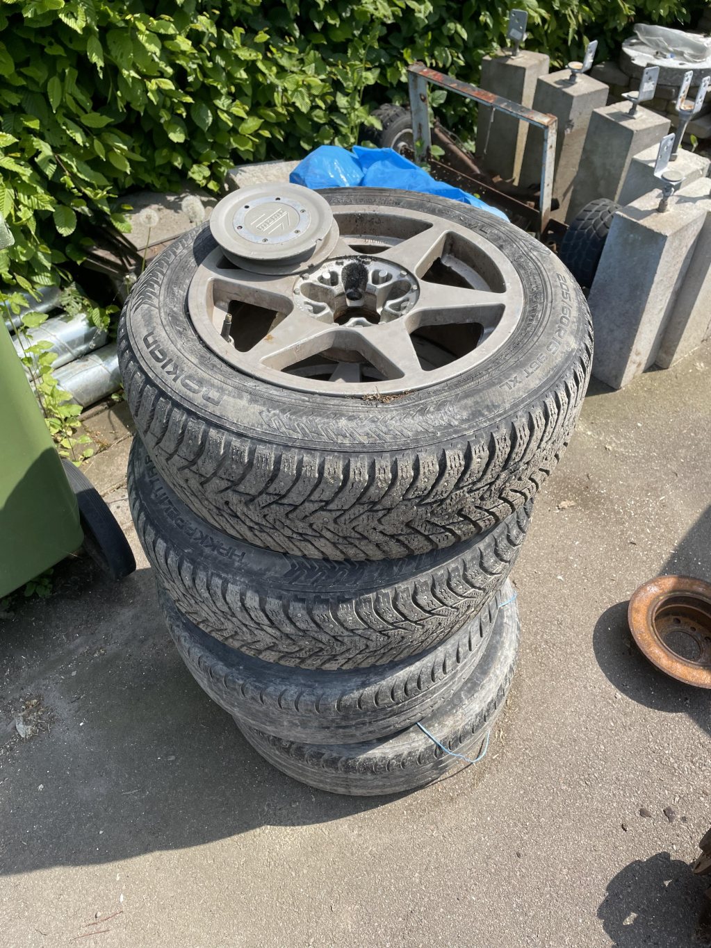 Fyra momofälgar i fyndskick, två navkåpor fattas.