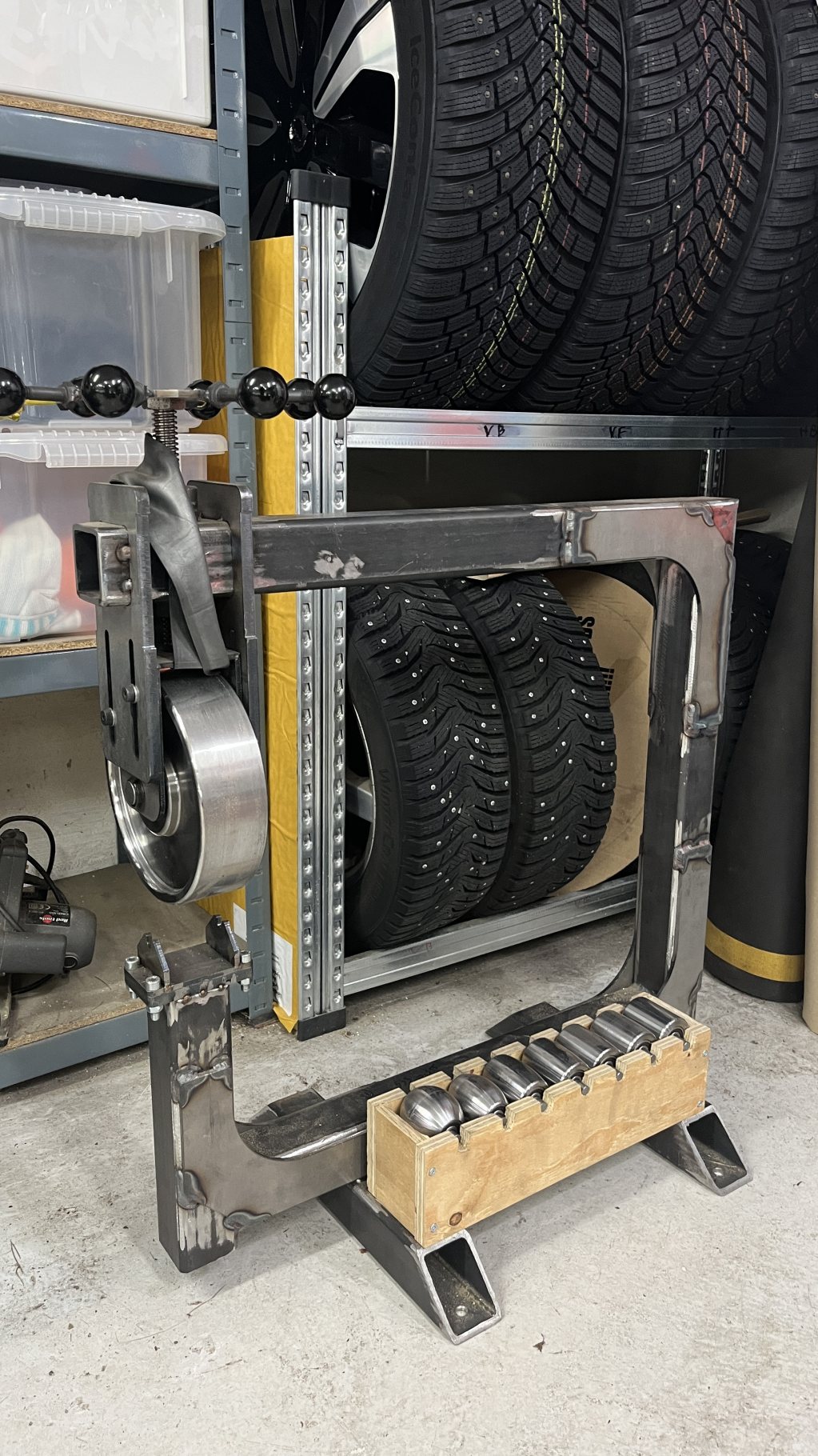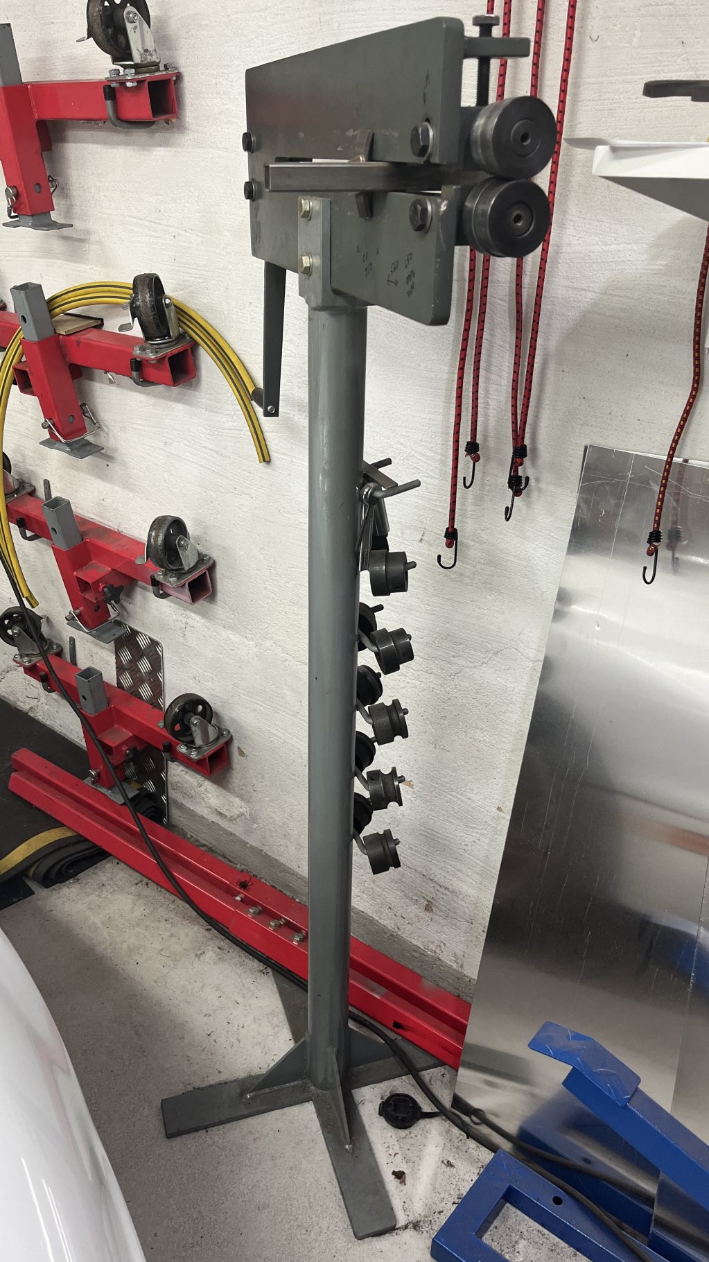 Engelskt hjul med 7 st underhjul. Arbetsdjup ~600 mm Gummiband till överhjul + extra gummin (klippta ur lastbilsslang) Jag har kört 1,2 mm alu samt 1 mm stålplåt med gott resultat. (bara valskittet kostar £312 + frakt och tull/moms) Pris 5000 kr, skickas ej, betalning via Swish.