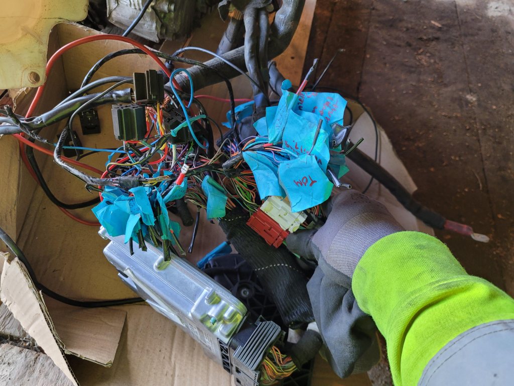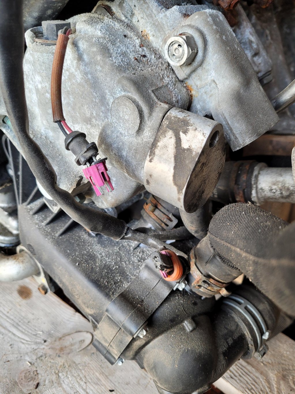 På den "negativa" sidan så finns det en kontakt som är trasig på framsidan av motorn (se bild), i bakkant motor går ett kylrör mellan cylinderbankerna, detta var buckligt och fick inte heller plats riktigt i Audi V8an. Så det röret är isärsågat och jag har dragit om rören en del, detta är inte komplett men alla originaldelar följer med motorn.