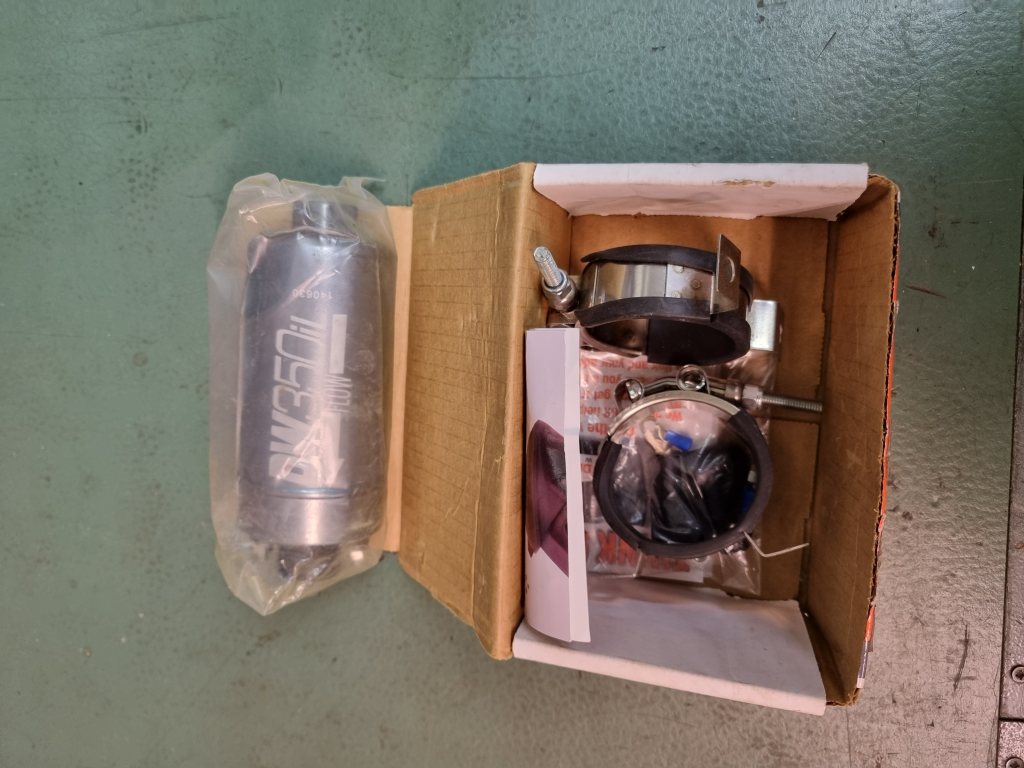 Bränslepump DW350il Ny bränslepump som aldrig varit använd. Inlinepump som flödar 350l/h vid 2,8bar, 300l/h vid 5bar. Tål E85 Anslutning för AN8 nippel in och ut. Monterklammer ingår.