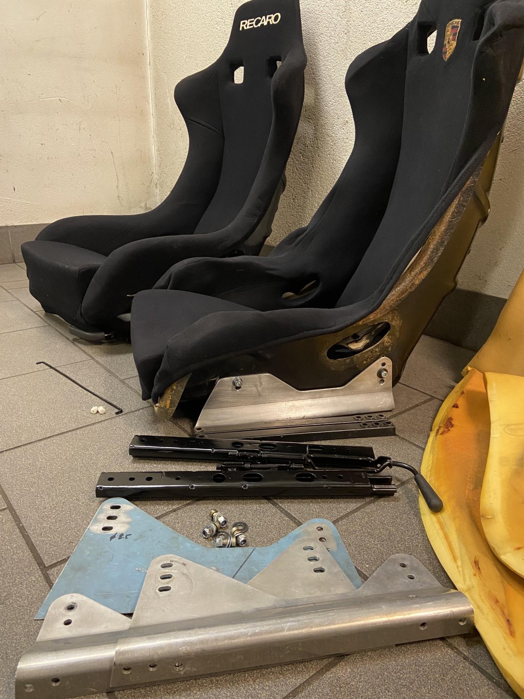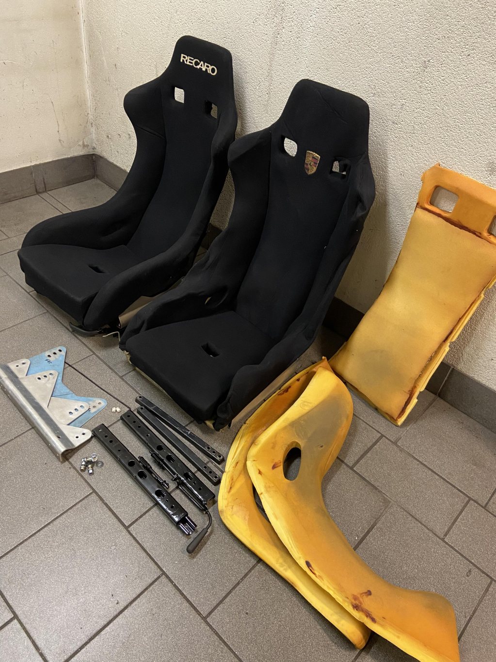 Har två till salu, kommer från en 944 TurboCup -86 Den ena tillverkad -85, sliten och har nog gått ett par säsonger i serien. Den andra, tillverkad -89 och lite bättre kvalitet. Sidokonsoller och Recaro glidskenor med lås på båda sidor. Extra sidokonsoller och ett par adapter för att höja stol finns till. Klädslar vart demonterade för service/ och inför omlackering baksida. Prisidé 8.000:- för allt. Peter Sandén 0706-634630