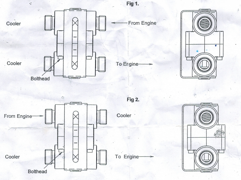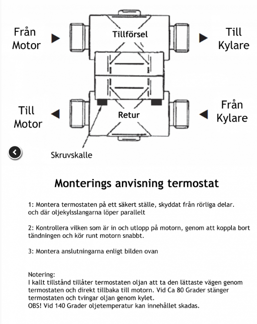 Jag har kopplat in den enligt "Fig1", men det funkar inte riktigt som jag vill. Min oljetemp vill aldrig gå upp så jag misstänker att oljan alltid går genom oljekylaren nu.. "Fig2" visar en annan inkoppling, men den känns lite underlig. Vid stängd thermostat vill jag att oljan endast ska gå direkt tillbaka till motorn, och i detta fallet ser det ut som att oljan skulle gå både till kylaren och motorn via den övre delen av 'huset'. Det kanske är önskvärt för vissa, så därför det visas som ett alternativ? Kollar jag samma oljetermostat hos en annan leverantör, KL Racing, ser det ut såhär: https://shop.klracing.se/sv/artiklar