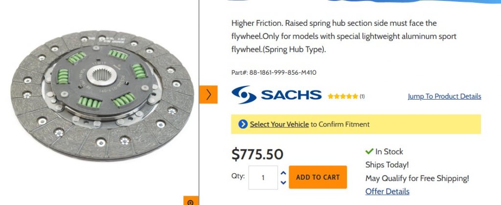 Aasco Flywheel 106411-11 Sachs Pressure plate 883082999736 Sachs Clutch Disc 881861999856 Sachs Release bearing and hardware included ***2002-2004 uses a different pressure plate. Please see part # 106411-11-PKG-02-04 _________________ Fredrik Boivie
