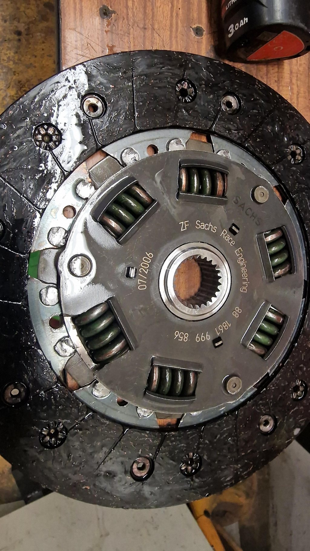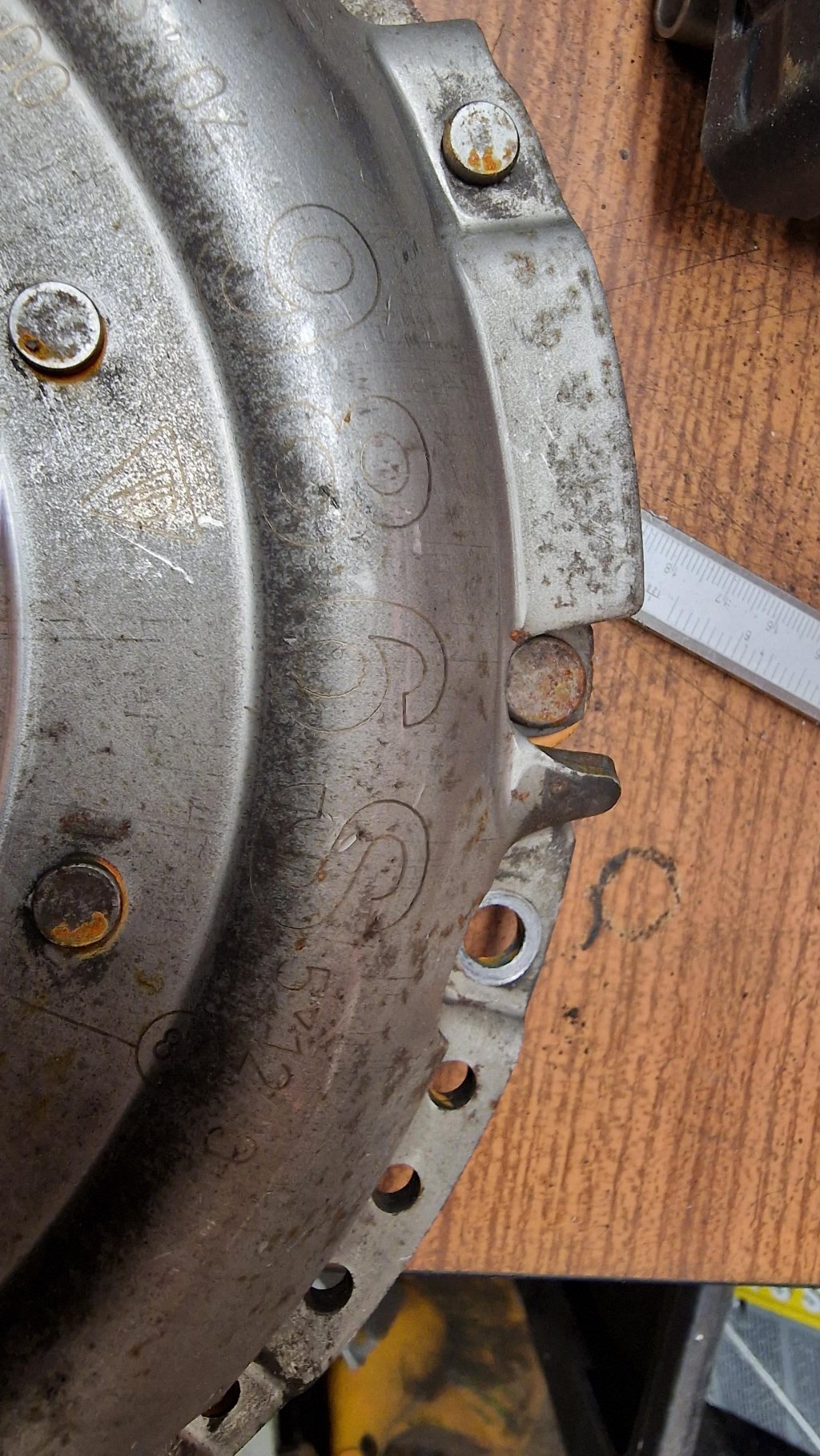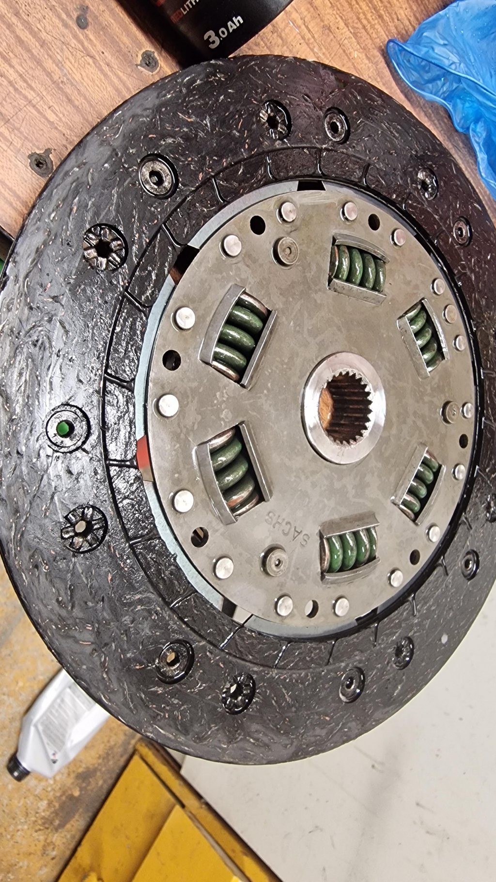 Det skramlade om tryckplattan och så trillade det ut en stålbit. Letade ställen och hittade till slut att en stor bit av lamellens fjäderkorg gått sönder. Högst obra men skönt att ha hittat ett rejält fel. Svänghjulet är inte repigt annat än i mitten så allt verkar ha klarat sig utan andra skador än kosmetiska.