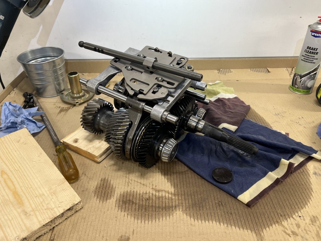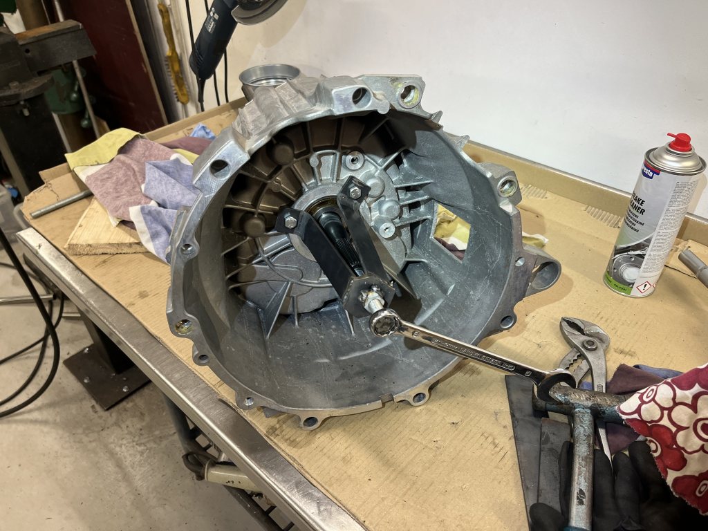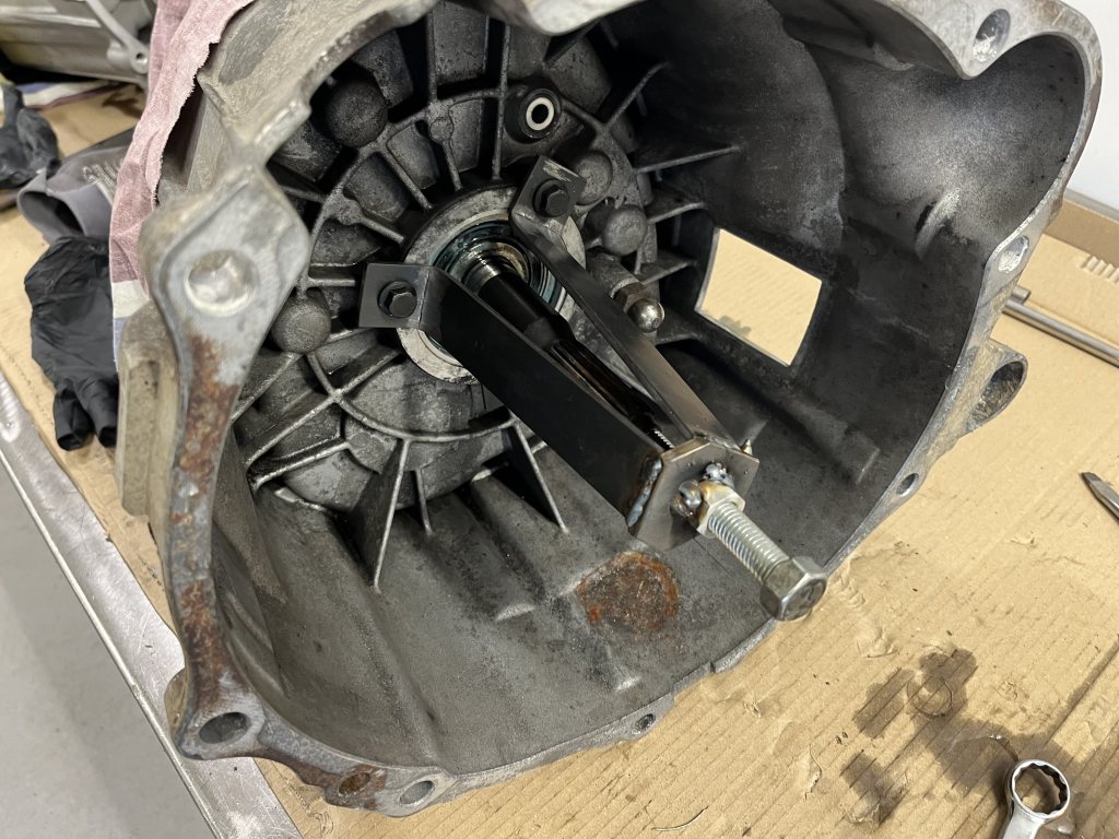 Är det nån som har erfarenhet av dessa M90-lådor? Idag har jga spenderat typ halva dan till att försöka få ur innehållet ur lådorna. Men ingående axeln vill inte släppa i lagret. Enligt youtube-filmer och olika forum ska det bara vara att knacka med en klubba på ingående axeln så kryper den ur tillsammans med resten. Men det vill inte. Så jag tog och tillverkade en enkel avdragare för att få lite press på axeln.