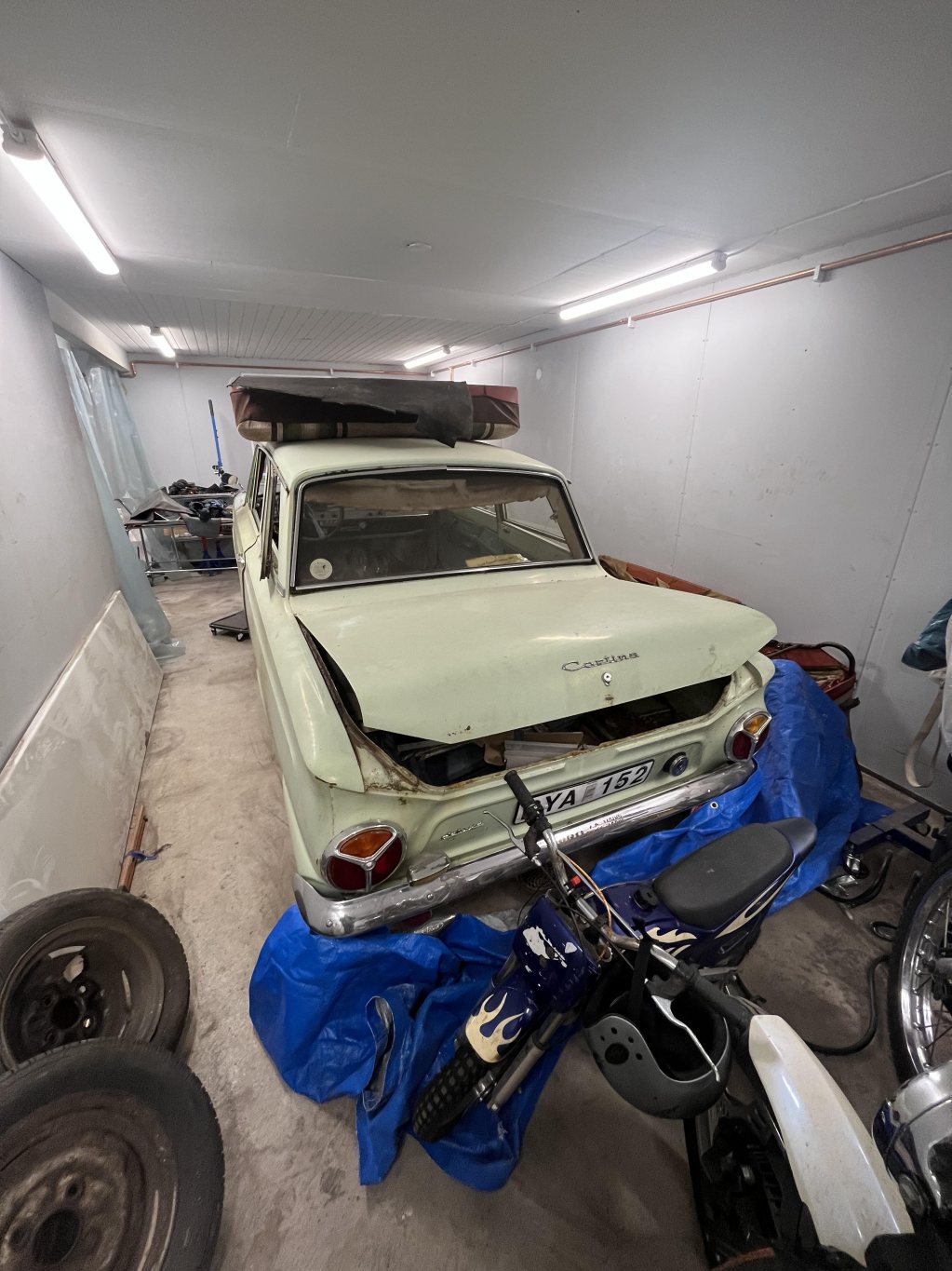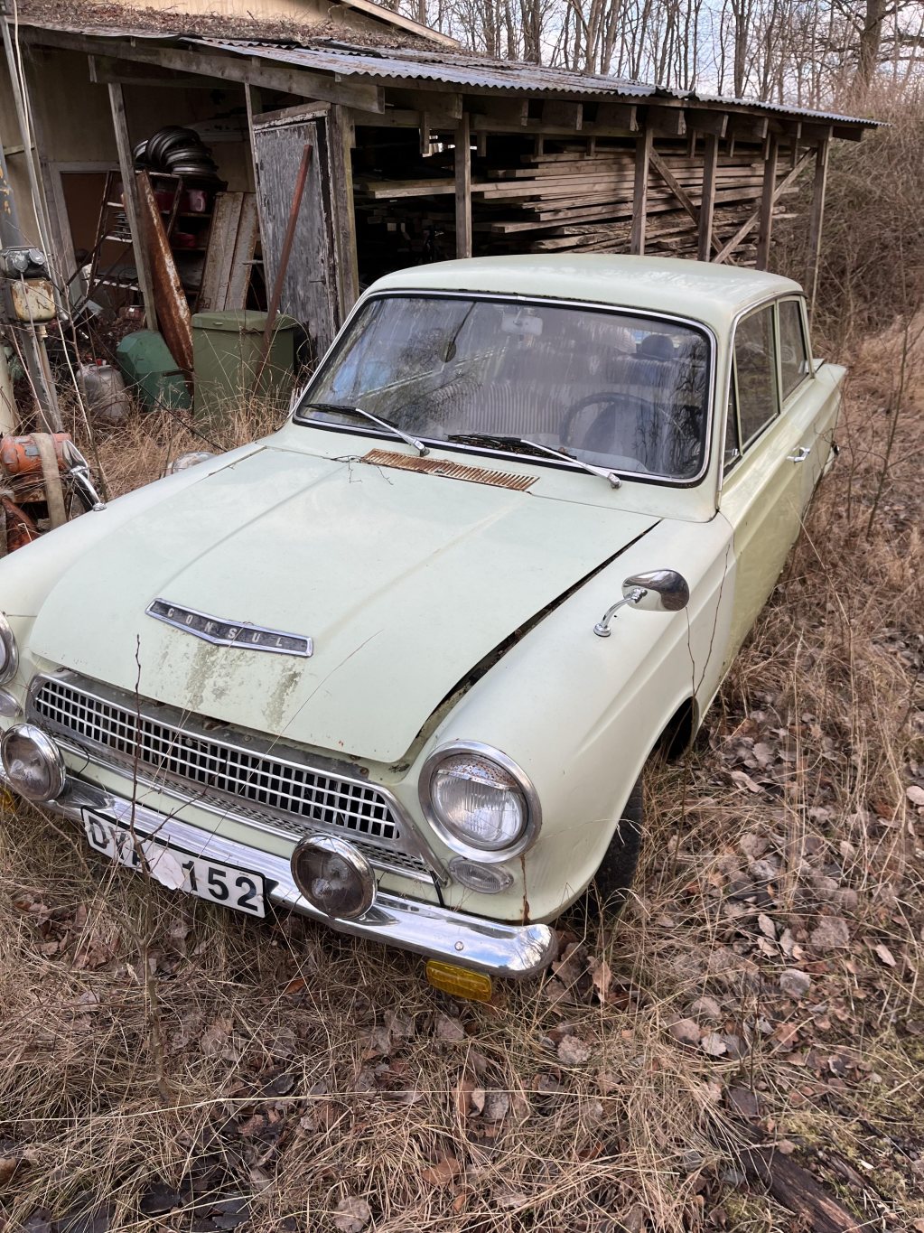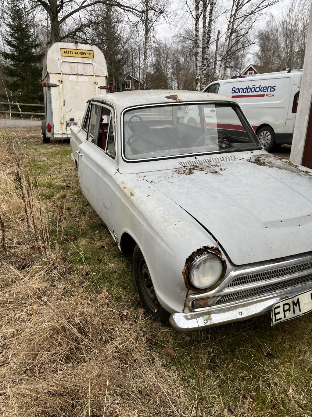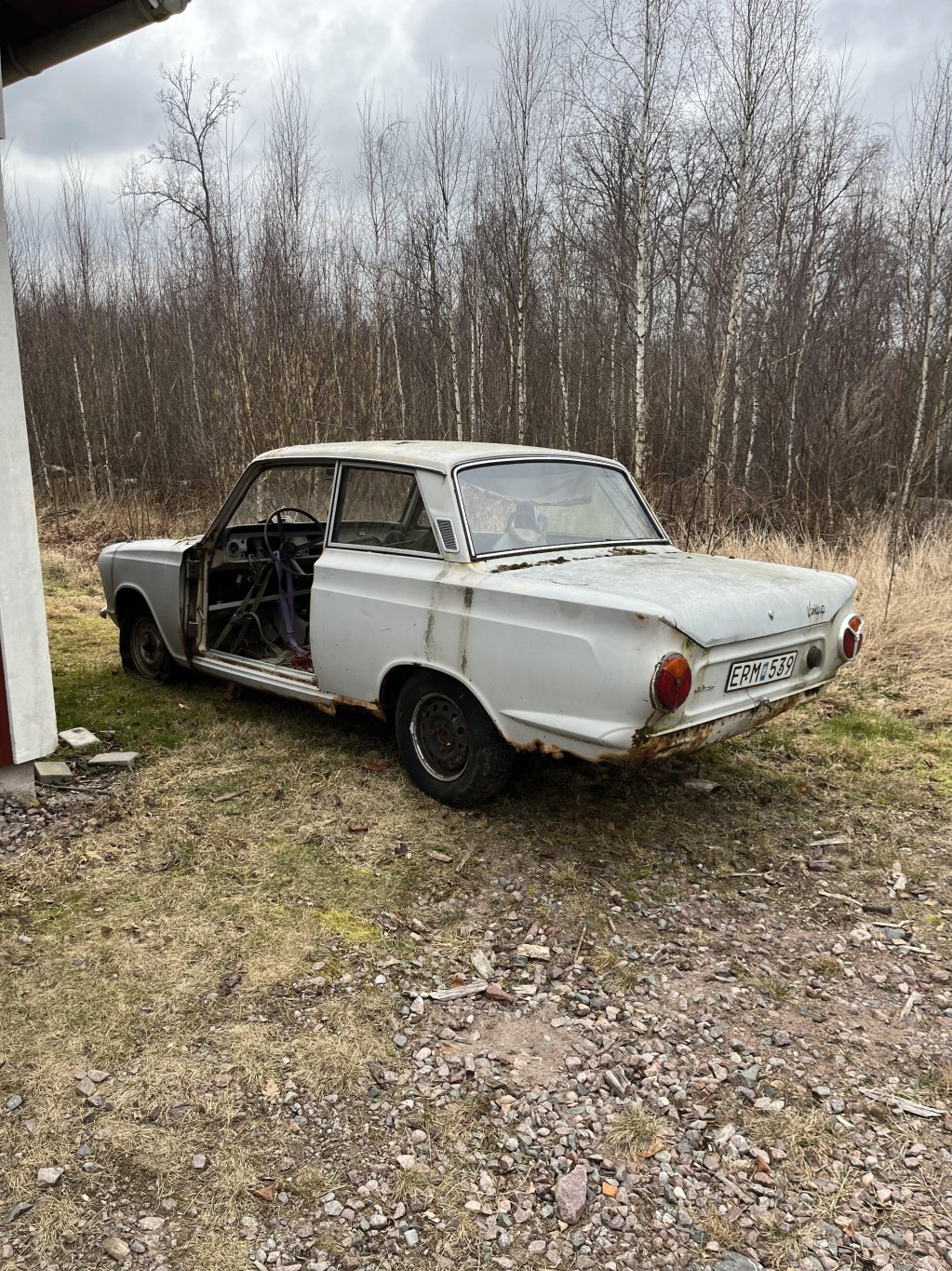 Hej. Har ju redan en projekttråd till min BMW 2002 som numera är lite pausad i en lada. Så tänkte jag gör en tråd om vad som händer med Cortinan som fick ta lite plats istället. Kortfattat så cyklade jag och min äldsta son förbi ett hus med massor bilar ståendes på nyårsafton förra året, åkte hem och luskade lite i vad som fanns på gården, la en lapp i brevlådan och 2 veckor senare så hade jag köpt inte bara en utom 2st Cortinor, en tidig 1963 och en lite senare 1966. Consul cortinan (ljusgrön) är besiktad för alltid och har brukats av gubben jag köpte den av tills för ett par år sen då den blev ståendes. 66an är en reservdelsbil och såldes och skrotades lite senare. Det är den ljusgröna Consul cortinan som detta projektet handlar om. Ford Cortina debuterade 1962 och detta är en 1963, dem hette Consul cortina fram tills 1964 då dem bara blev "Cortina" och har en lite annorlunda grill samt dekor på C-stolpen. Annars skiljer dem inte så jättemycket mot senare cortina. -Vad är planen? Jo att ha en trevlig bil att bruka på somrarna, men hålla det på en rimlig nivå, bmw 2002 projektet blev ju lite väl seriöst.. så denna kommer det inte kostas på något extra eller så, men den kommer bli roligare! det som ska göras innan våren 2026 är: *skivbromskonvertera fram. *byta bussningar, styrstag, dämpare fram *måla upp och snygga till framvagn. *rostlaga fjäderbenstorn vänster fram *rostlaga några balkar samt sandplåt bak *svetsa in bältesinfästningar *montera rullbälten *göra iordning inredningen lite. *byta till GT motor Låter som mycket jobb men det är inte så farligt ändå. Har påbörjat rostlagning och bältesinfästningar så det börjar ta sig!