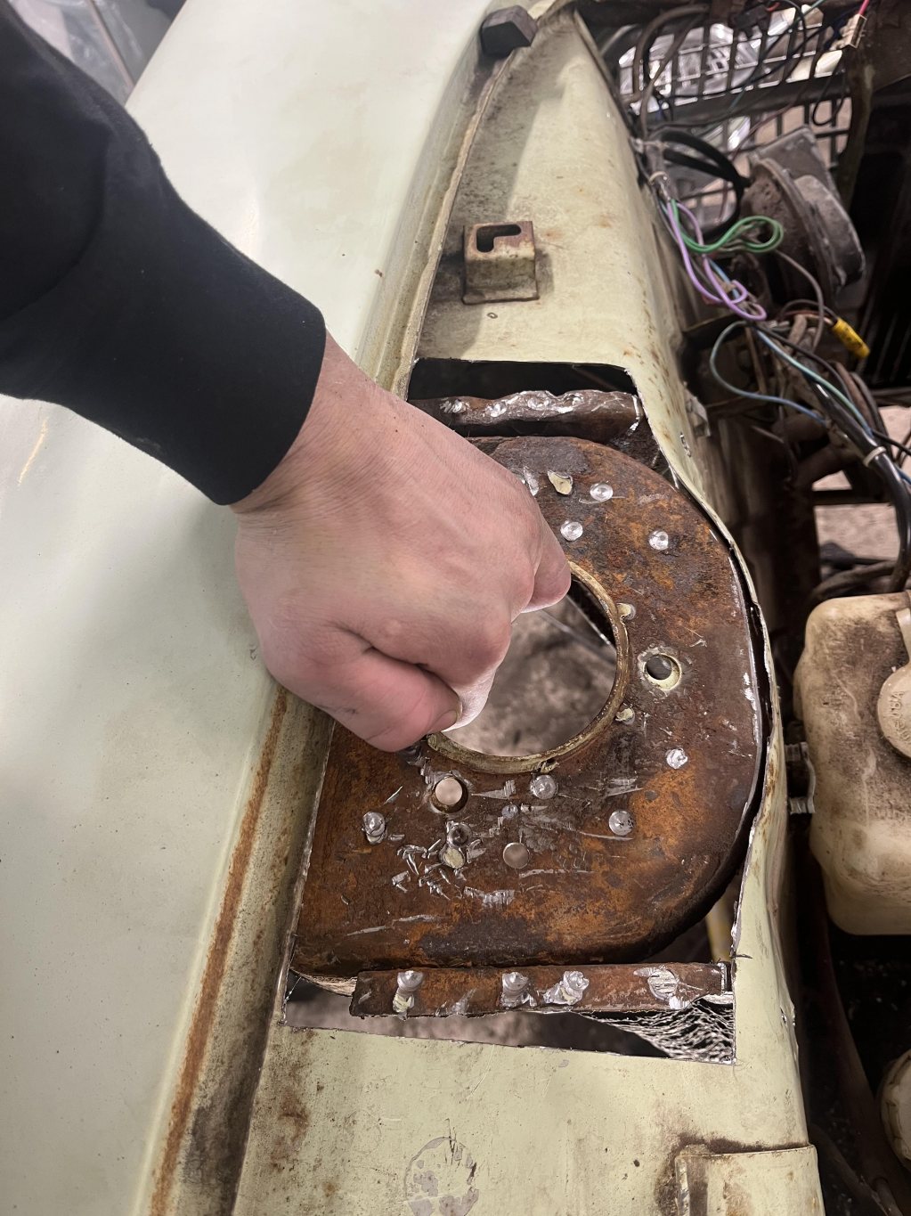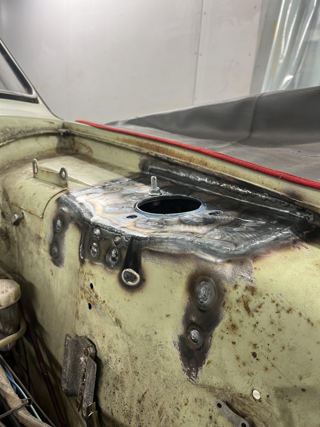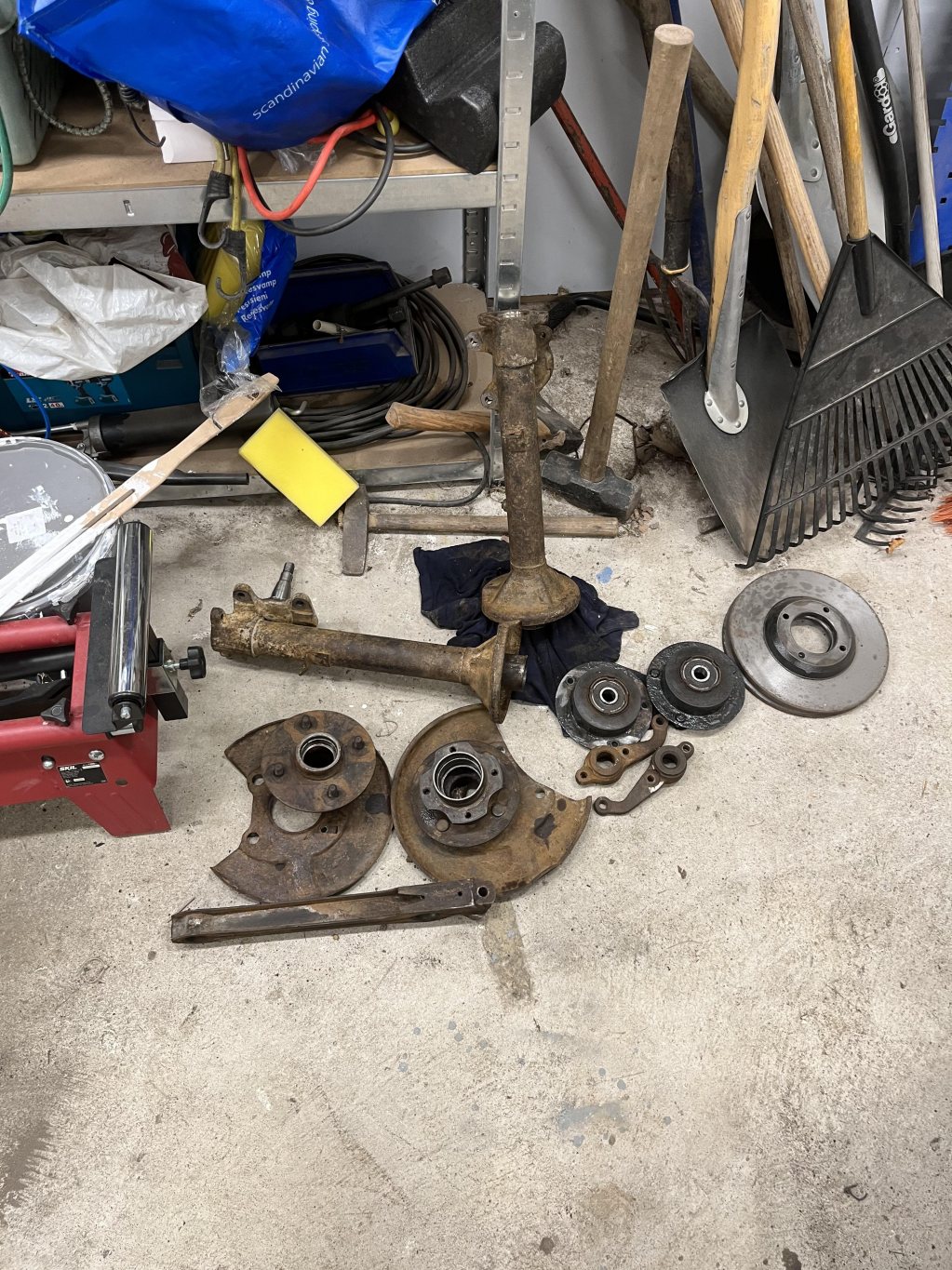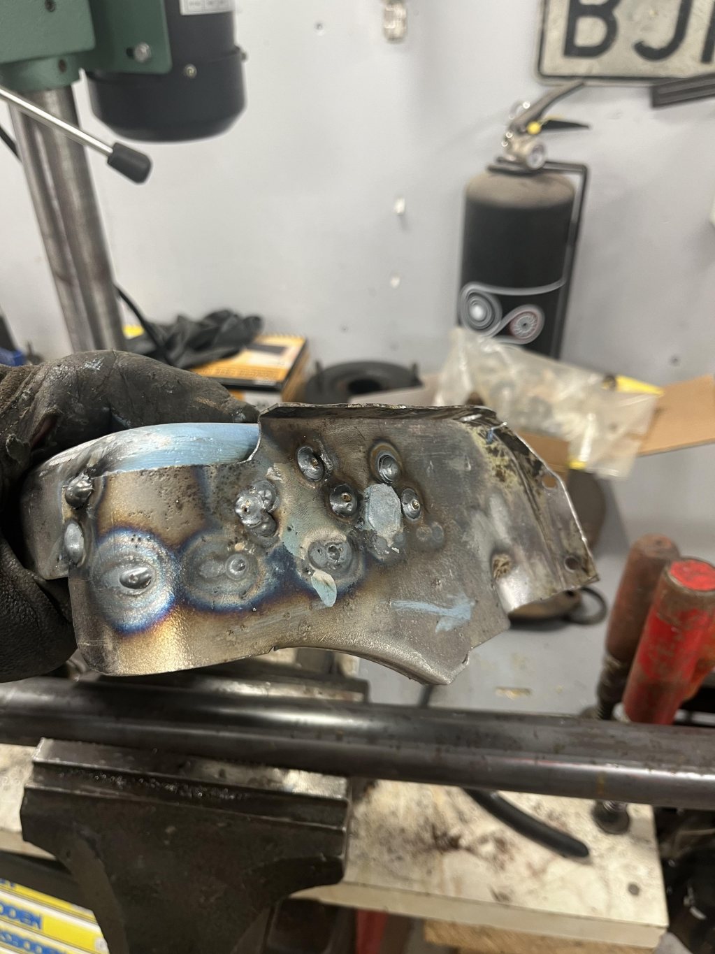 Sen helsvetsade jag fjäderbenstornet, och även övre bältesinfästningarna i B-stolpe. Sen påbörjade jag att demontera fjäderben för att blästra och lackera.