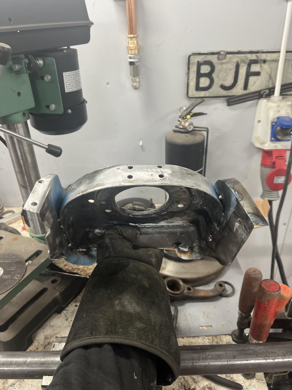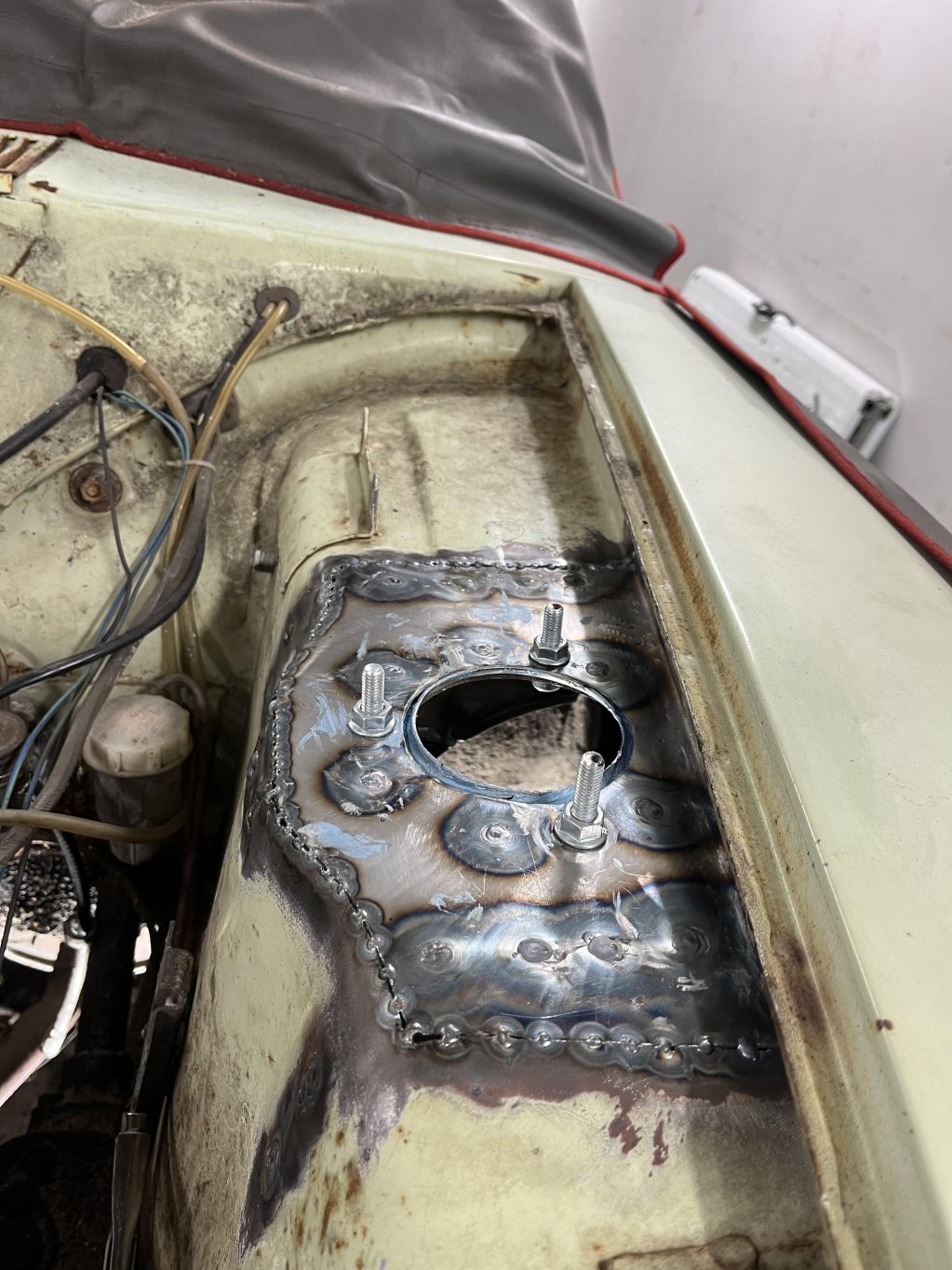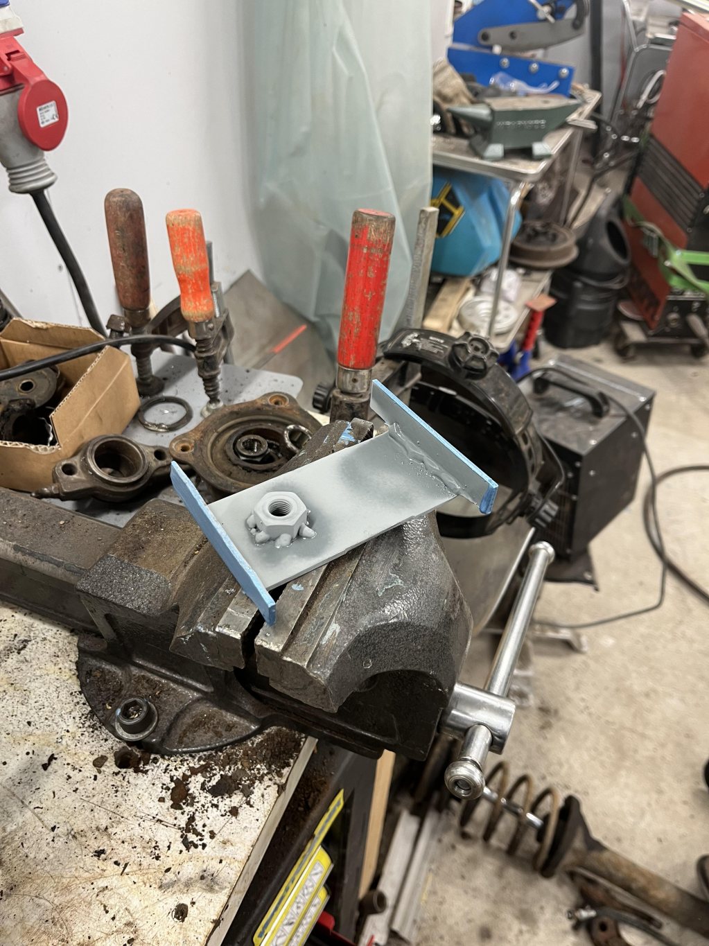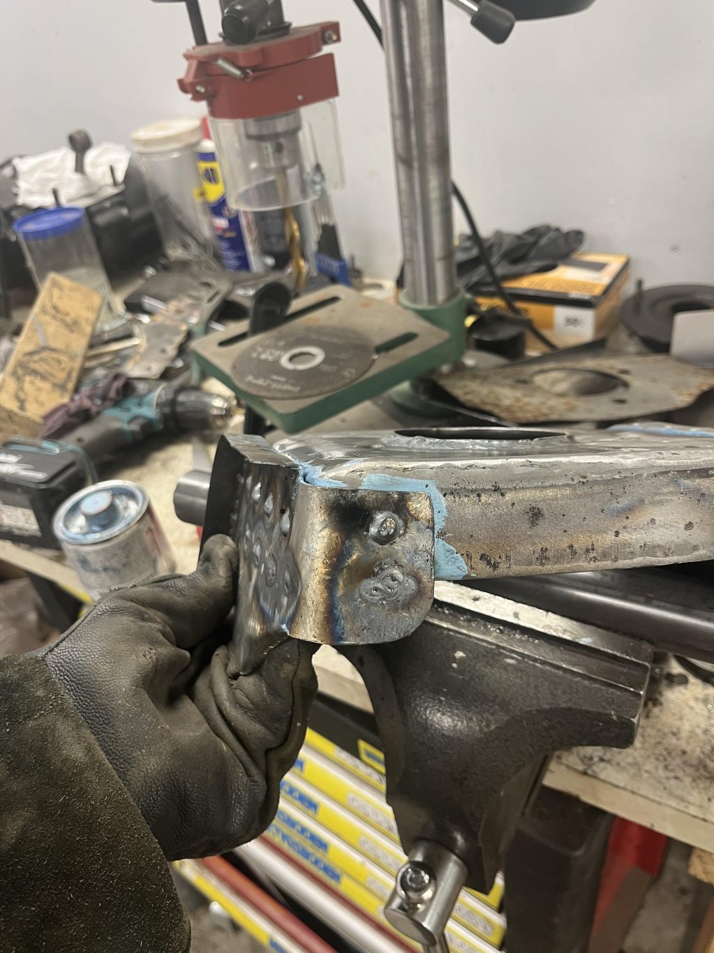 Sen helsvetsade jag fjäderbenstornet, och även övre bältesinfästningarna i B-stolpe. Sen påbörjade jag att demontera fjäderben för att blästra och lackera.