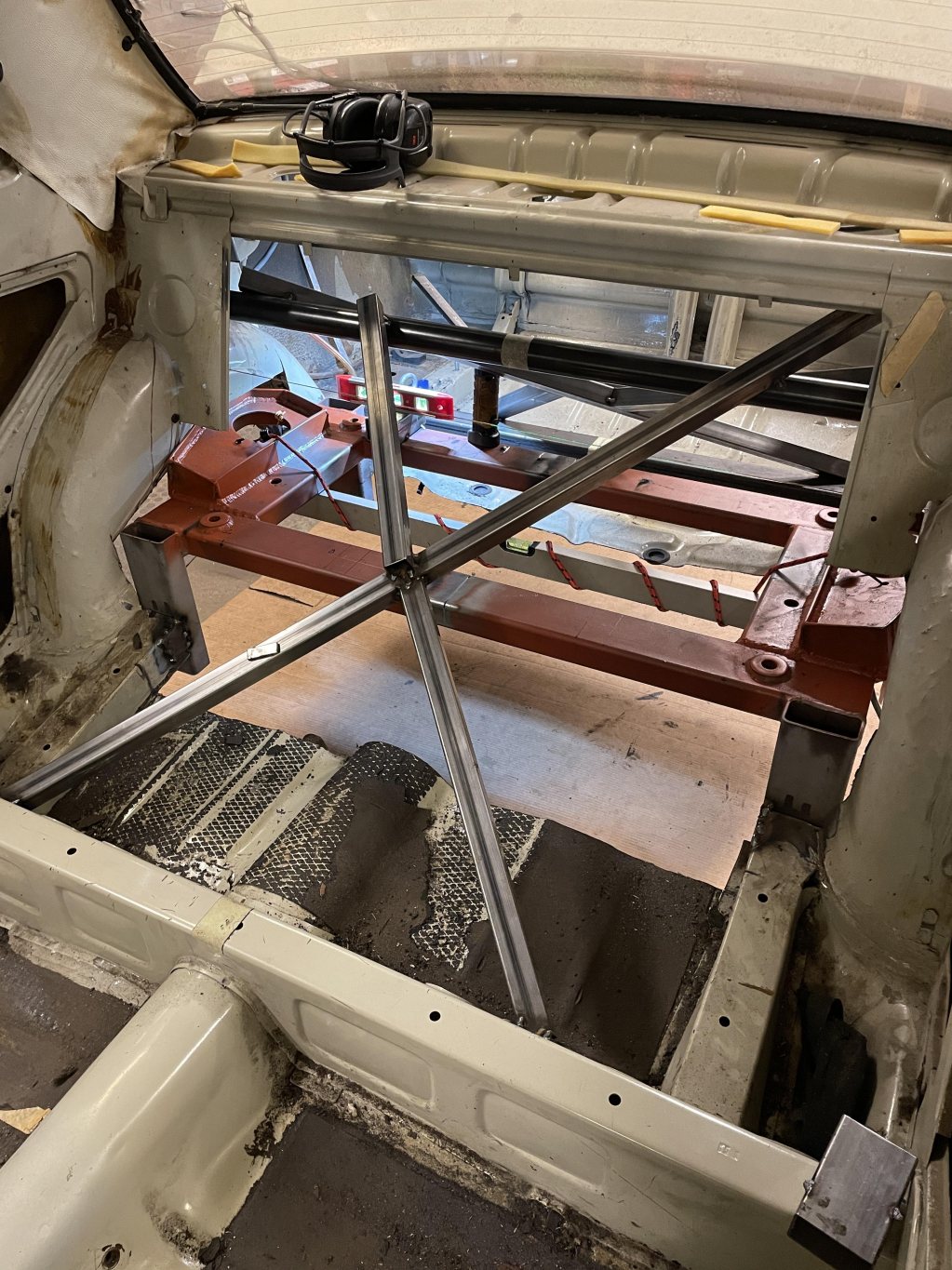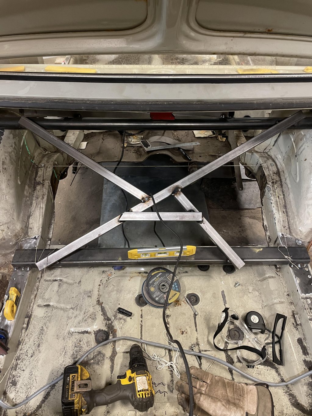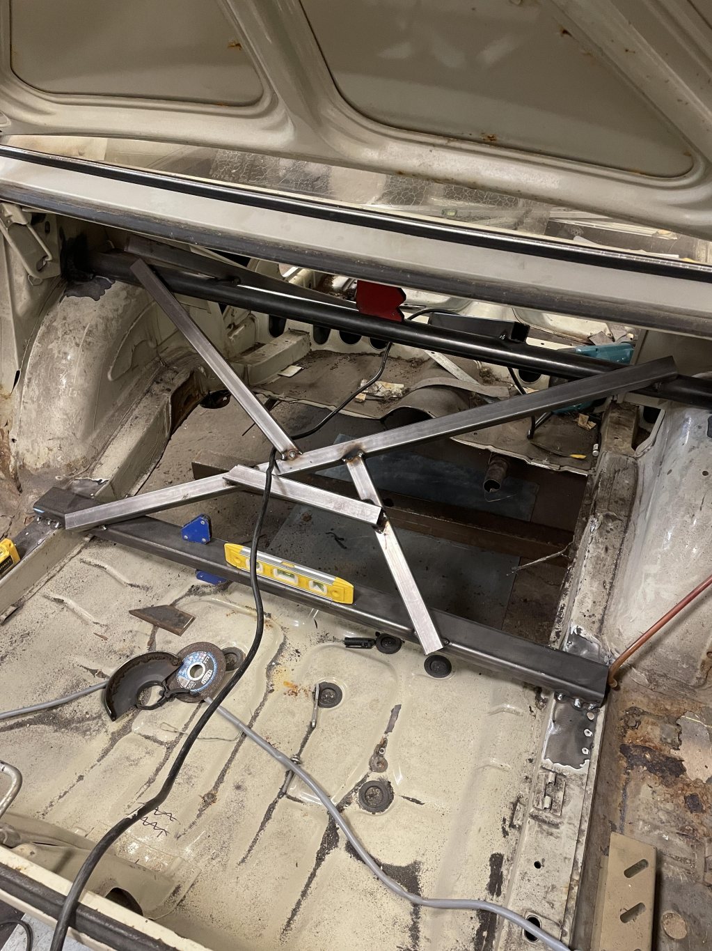 Då denna tråd nu är startad en bit in i bygget kommer jag lägga upp lite varje dag i mån av tid (livet är ju ändå fullt av annat tyvärr) tillsdess att vi är i fas med vad jag gör på bilen just nu. Eftersom jag byggt på ett "projekt" i nu hela 3 skepnader har man lärt sig på vägen hur man bygger, vad som behöver tas i beaktning etc. I verkligheten är detta den tredje karossen som nu byggs och har rätta förutsättningarna. Kaross 1 var realistiskt en trial-and-error, spenderade närmare 1 år att rostlaga de typiskt dåliga ställena på kadetter; A-stolpar, sparklådor, ram, golv. Tråkiga var att när man väl kommit genom hela frontpartiet och trösklar, så dök det mer och mer dåliga lagningar. Visade sig att jag kört bilen från norra dalarna till södra sörmland med ett 3cm tjockt lager av spackel, popnitad aluminiumplåt & asfaltsmatta som enda "struktur" av ram att hålla bilen från att vika sig på mitten, hur det gick undrar jag än idag. Närkag kommit till bakrehalvan av golvet där förarstolens rygg möter tvärbalken, fanns det _ingenting_ att svetsa i. Utöver det, flytande tektyl inblåst i hink-mängderi varje vrå, det var omöjligt att göra framstegutanatt det gav mer problemoch lagningarna blev skit. Fivk nys på en tom kaross i karlstad, värmland. Orörd, ovetsad, 3000:-. Kände det vägde tyngre stt börja på en ny kula. Ni ver säkert känslan jag hade, för när spackelkakorna på alla paneler ja reparerade var mellan 5-15mm på varje punkt jag tog bort lacken, blev det för mycket framtida tvång att lösa gentemot vad jag hade för kunskaper och verktyg att kunna rikta tunnplåt, speciellt när kadettens kaross har radier och linjer på stora ytor. Så, kaross 2 inhandlades. Det var som natt och dag. Krossen var helt orörd, vilket var bra utgångspunkt när man inte hade samma kunskaper för plåt jobb som man har idag. Här gick det undan kunde återanvända mycket av plåten som jag reparerade på kaross 1, tog färdiga sektioner och flyttade över, frid och fröjd. Jävla massa svetsande bara. Kanon faktiskt säga att det var på kaross två som jag på riktigt lärde mig att svetsa bilplåt och även knacka / valsa till passbitar för hand. Denna kaross fick ungefär ett år också. Gick skitbra. Gjorde framsteg fort. Hade ju mycket delar ifrån första karossen för det fanns ändå bra framskärmar dörrar och huv samt diverse andra plåt detaljer som kaross två behövde . Men, här kommer det tråkiga med att lära sig saker allteftersom. Kom så pass långt att bilen såg tämligen hel ut i det här läget är fortfarande min utgångspunkt att jag ska använda 2,4 liters motor av CIH typ alltså opels största motor som passar mellan många modeller ifrån liknande tid. Hade ju fått tag i den stora framvagnen den stora bakaxeln och stora växellådan växellåda. Tunneln var även ifrån den större modellen så förutsättningen var skitbra. Humöret var på topp. Men. Stort jävla men. När väl framskärmar, front, huv, bak skärmar satt på plats så passade inte längre dörrarna. Ingen utav dörrarna.
