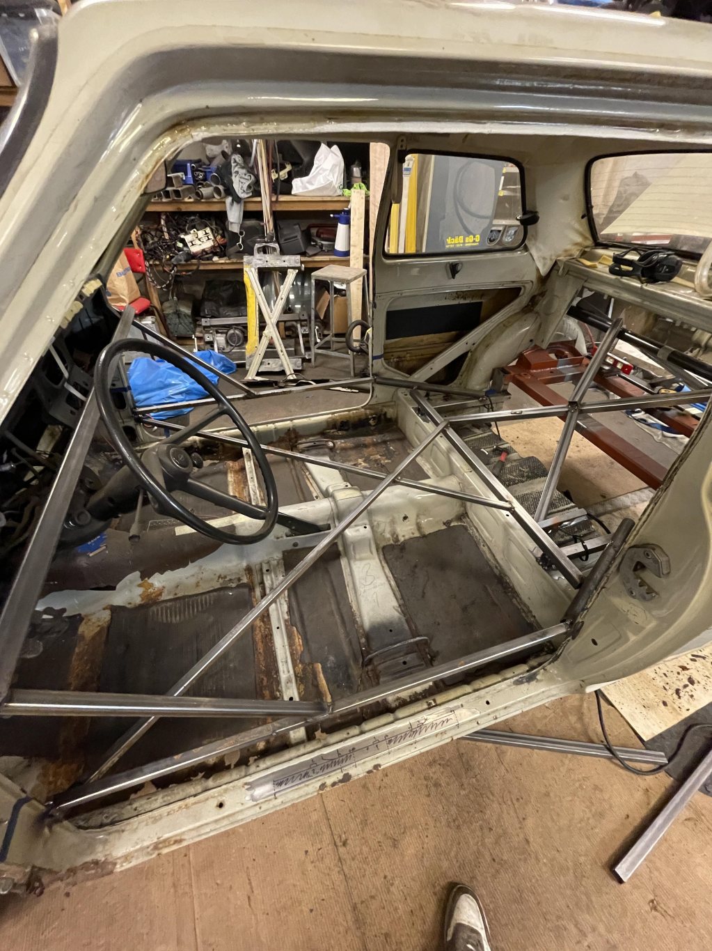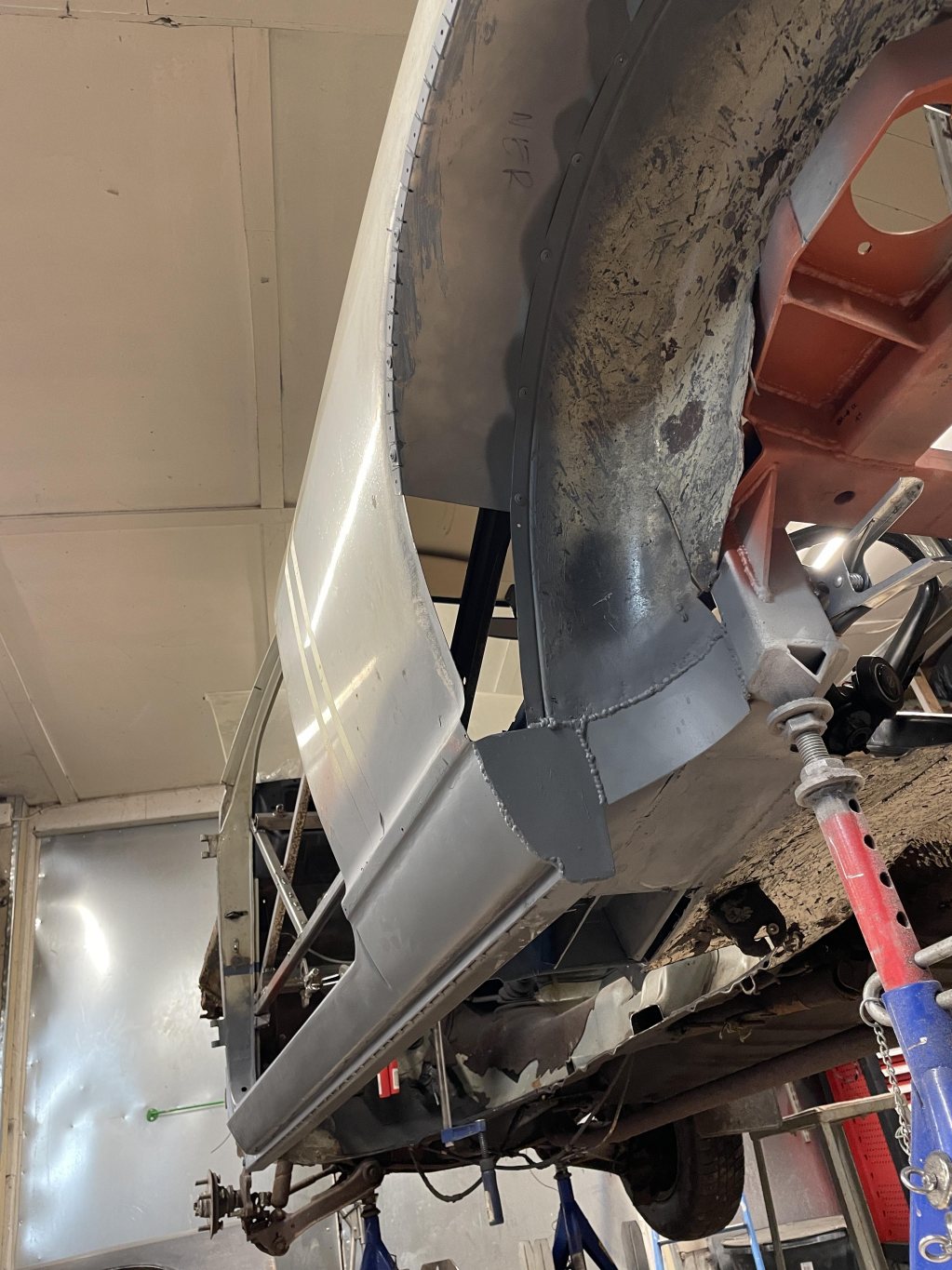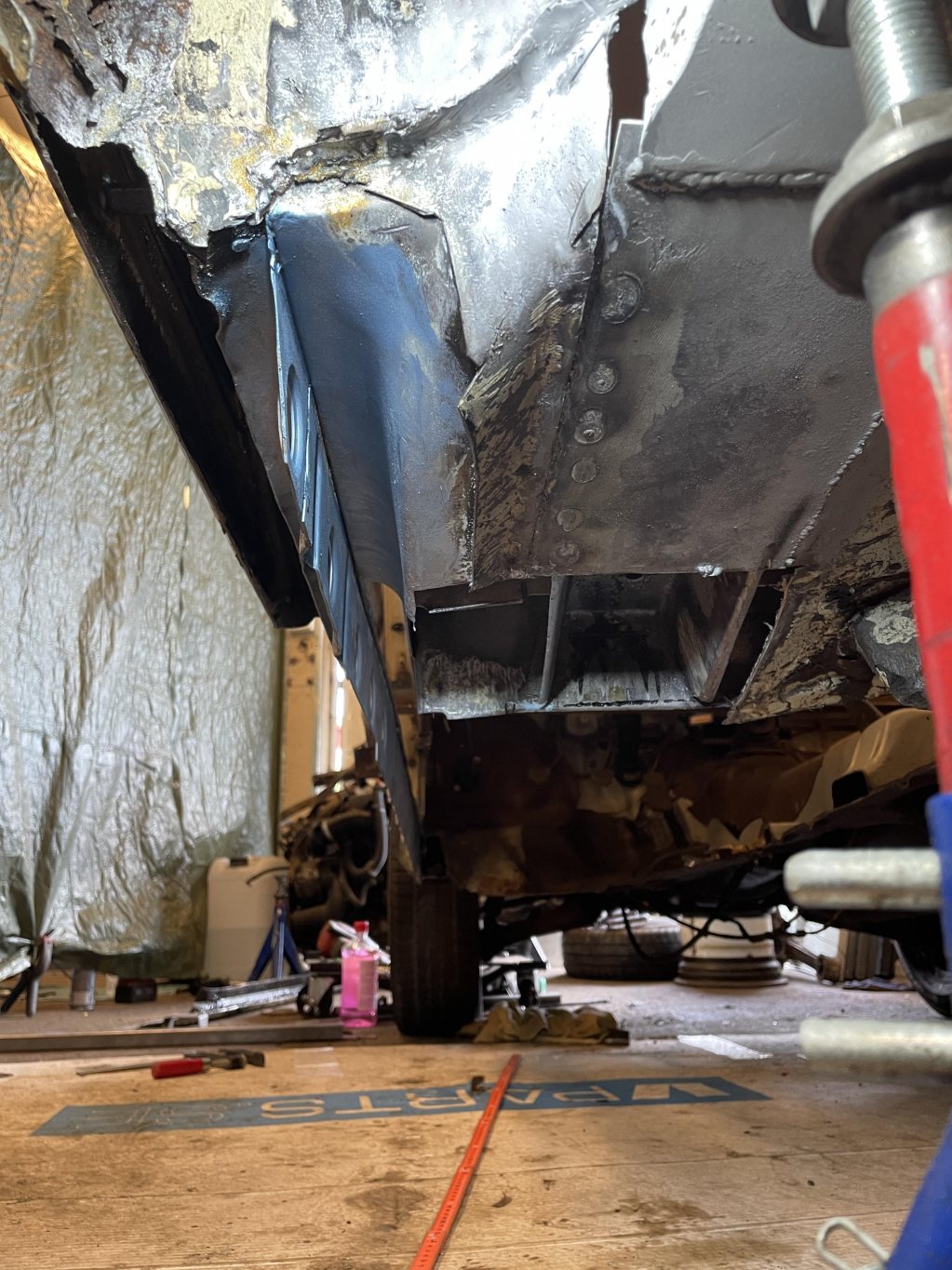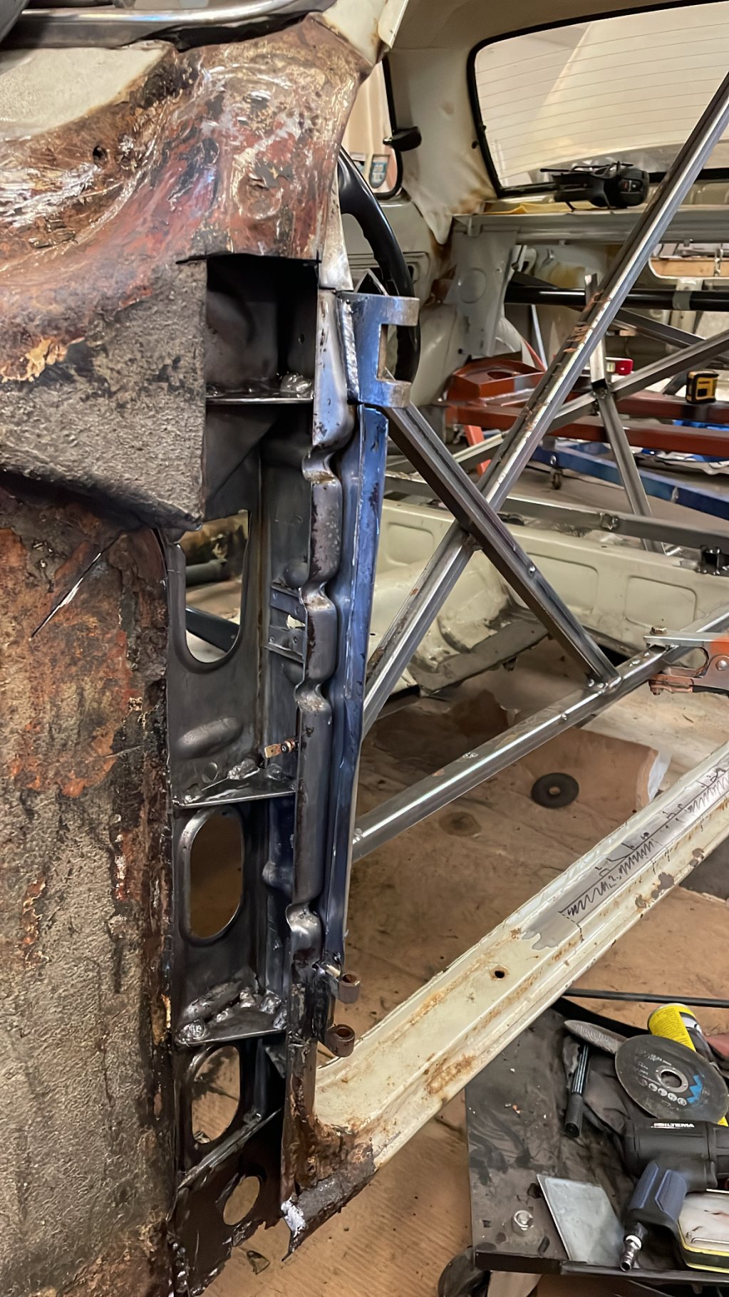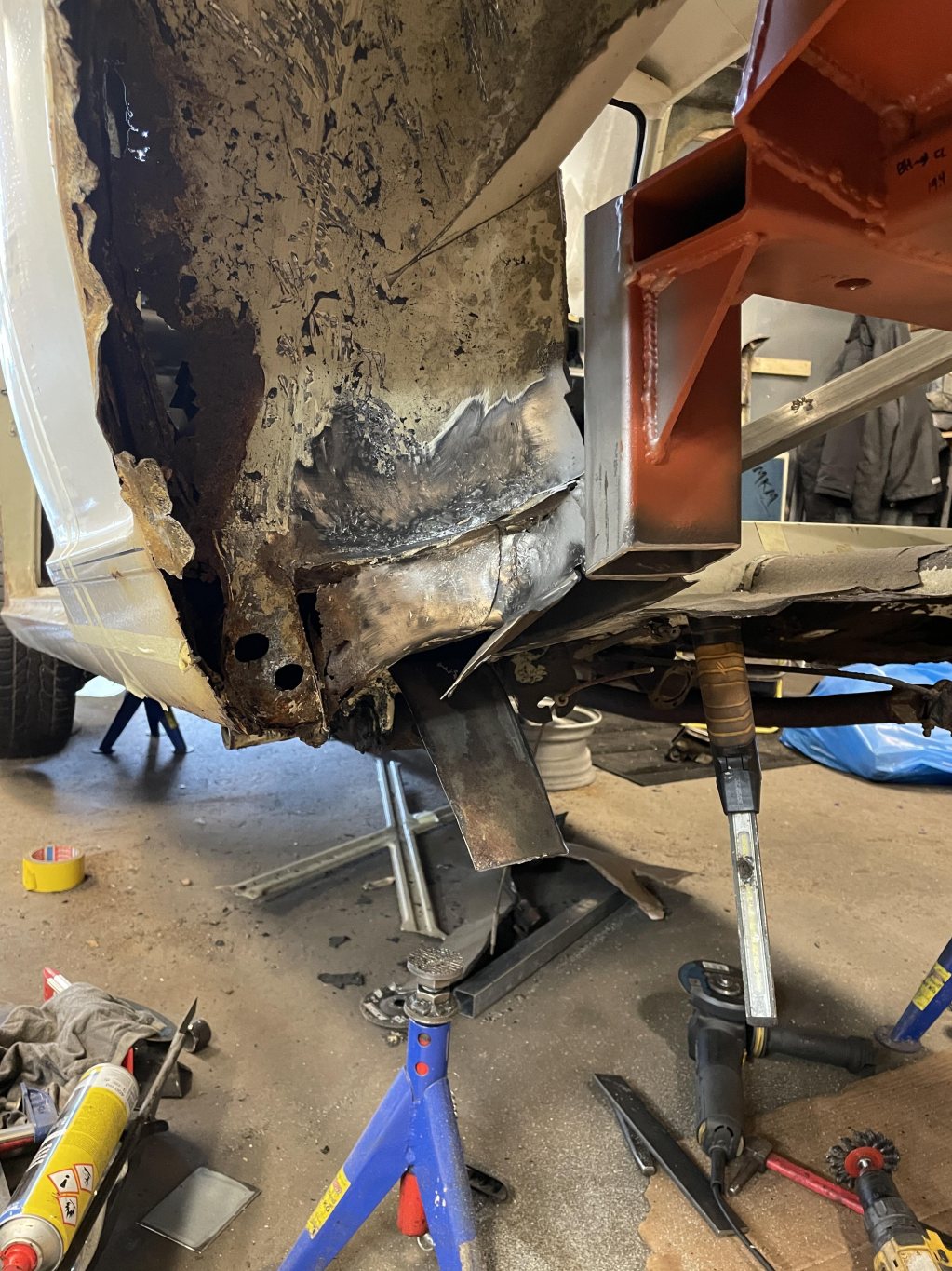 A-stolparna gick från 0mm godstjocklek (aka, bortrostade) till 2.5mm då jag hellre tar i än att bilen viker sig. I farten följde trösklarna med, det var inte möe kvar att kalla tröskel, men de var iallafall orörda. Jämnför jag med tidigare karosser, var detta en dans på blomsterängar. Lirkade in 40x80 balk i trösklarna för att aggera en stabilare ram. Gjorde detta med yttre orginalmått i beaktning, trösklarna behåller orginalutseendet. Fortsatte med hjulhuset & innerskärmen i samma veva, escort mk1 bubbelskärmar ska sättas på så de togs upp till en passande höjd.