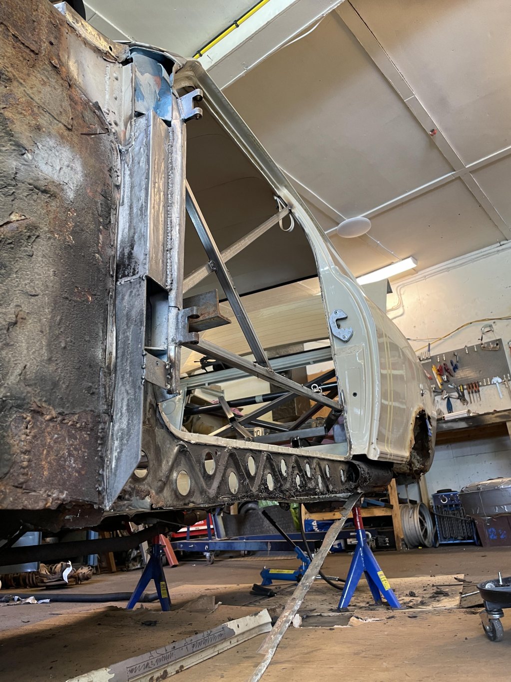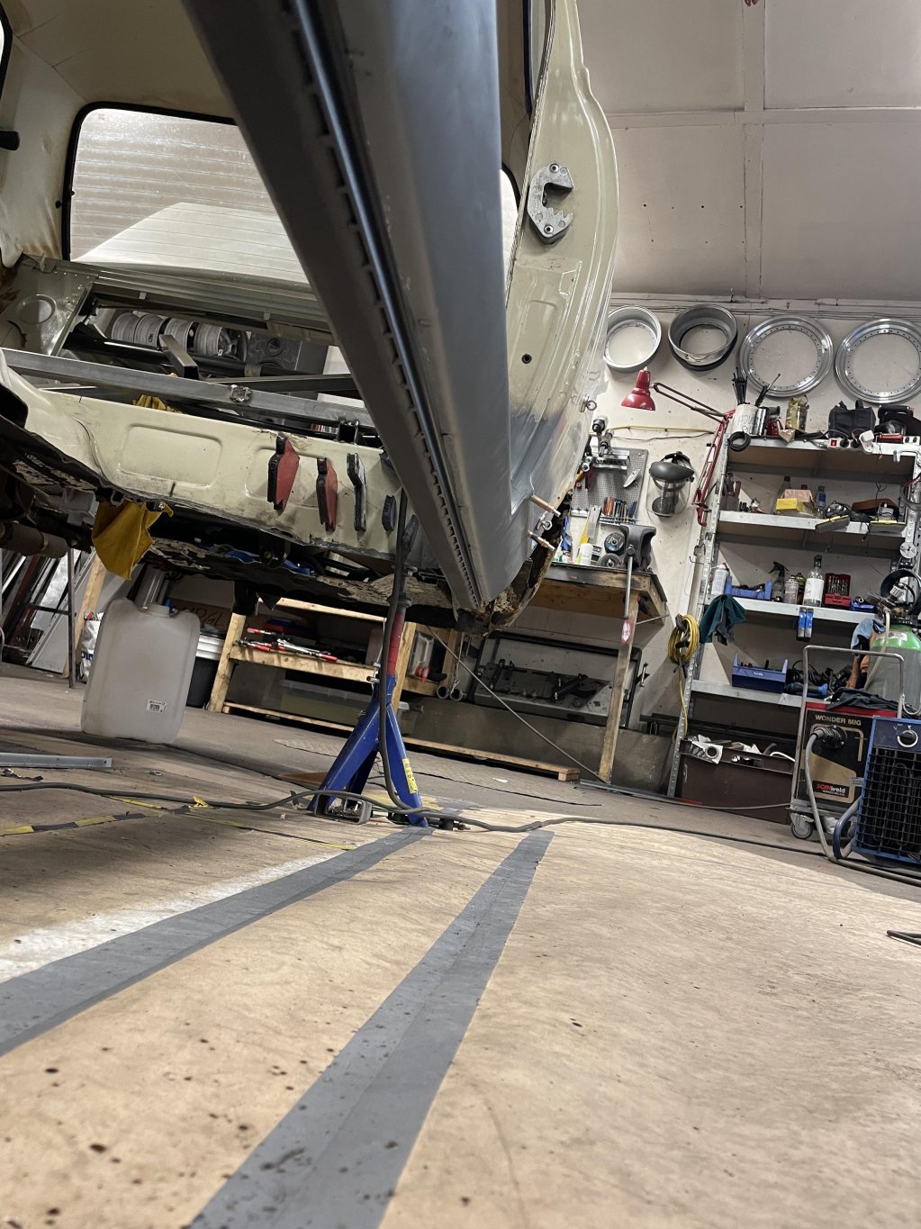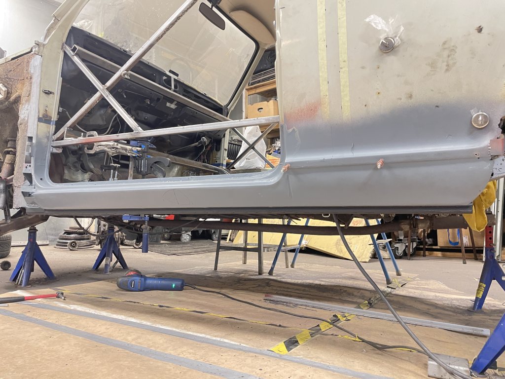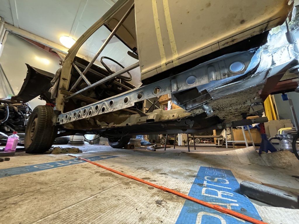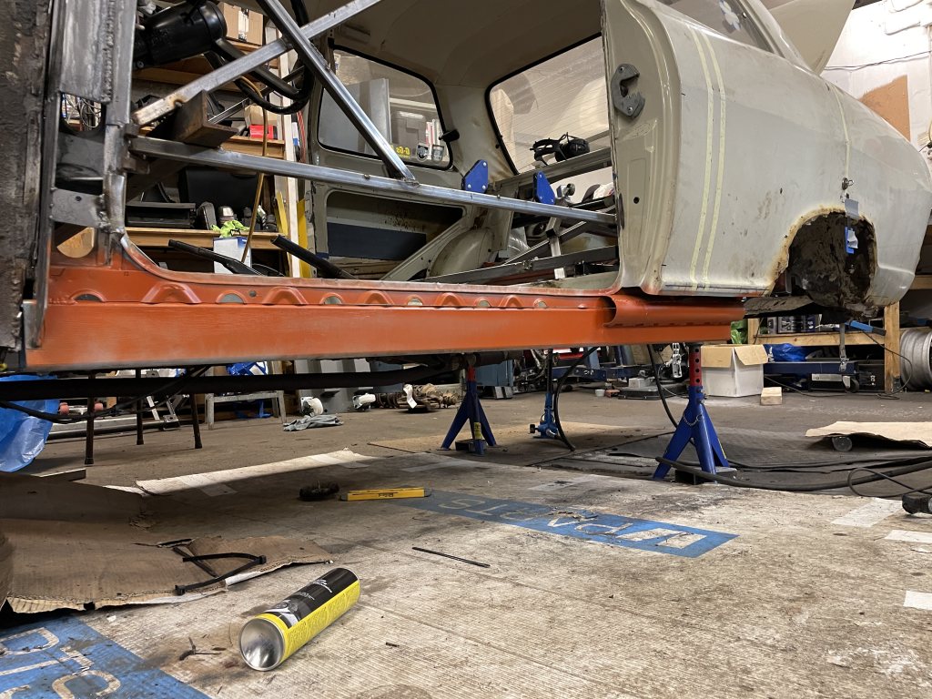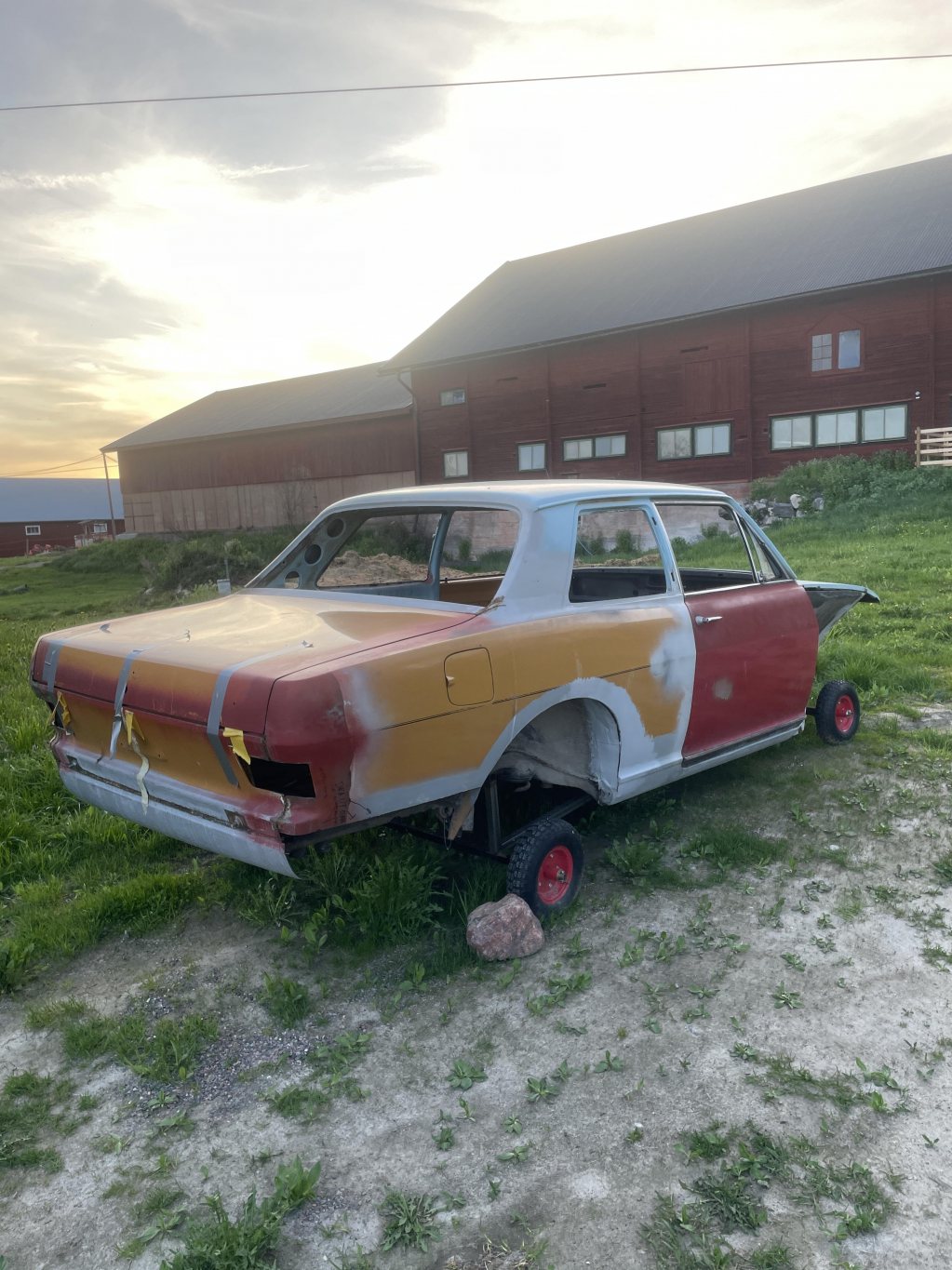 A-stolparna gick från 0mm godstjocklek (aka, bortrostade) till 2.5mm då jag hellre tar i än att bilen viker sig. I farten följde trösklarna med, det var inte möe kvar att kalla tröskel, men de var iallafall orörda. Jämnför jag med tidigare karosser, var detta en dans på blomsterängar. Lirkade in 40x80 balk i trösklarna för att aggera en stabilare ram. Gjorde detta med yttre orginalmått i beaktning, trösklarna behåller orginalutseendet. Fortsatte med hjulhuset & innerskärmen i samma veva, escort mk1 bubbelskärmar ska sättas på så de togs upp till en passande höjd.