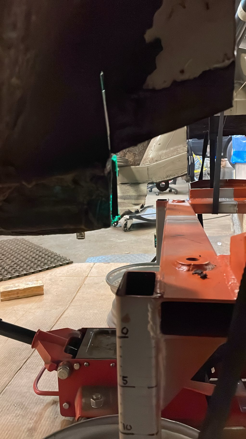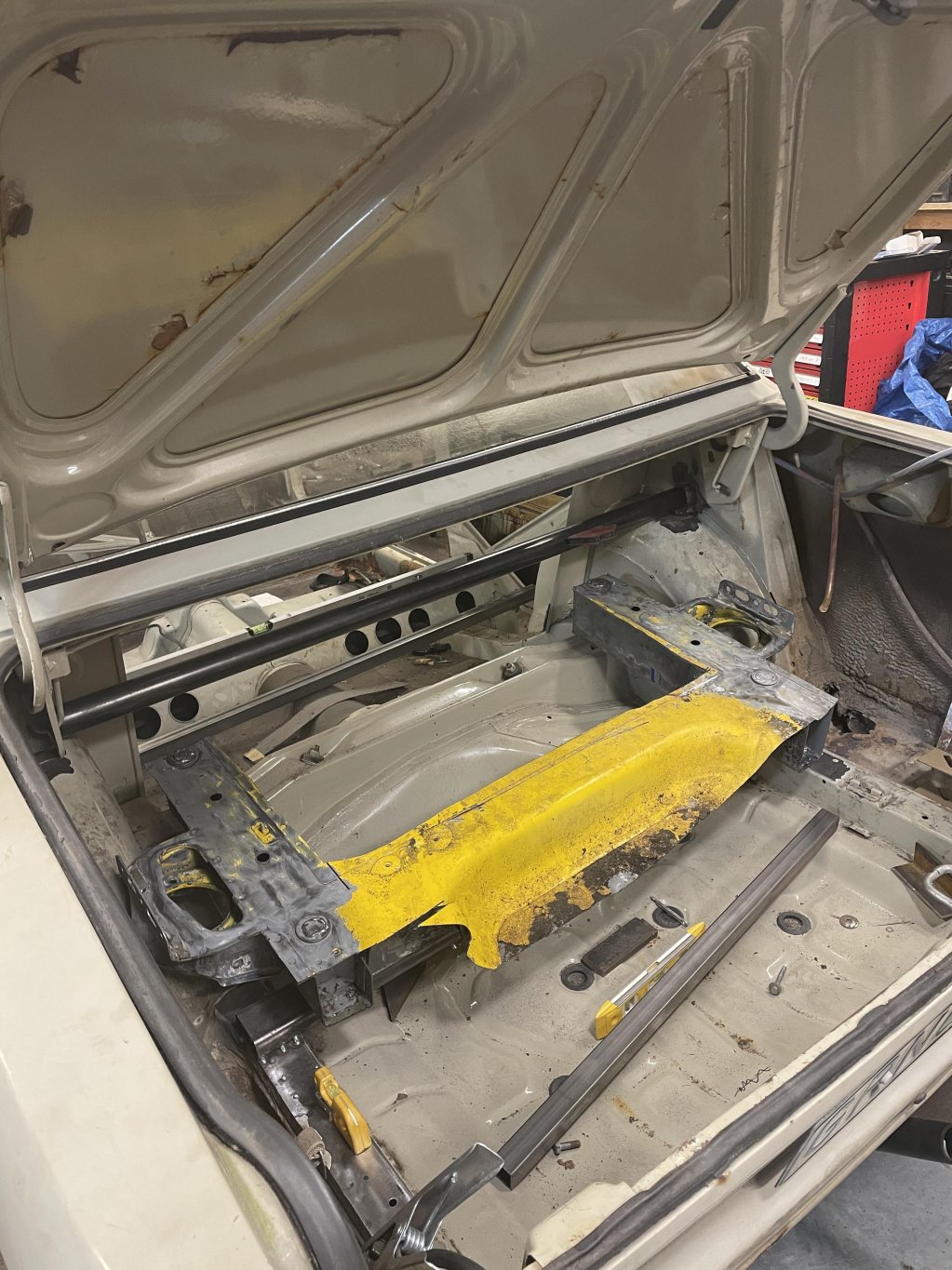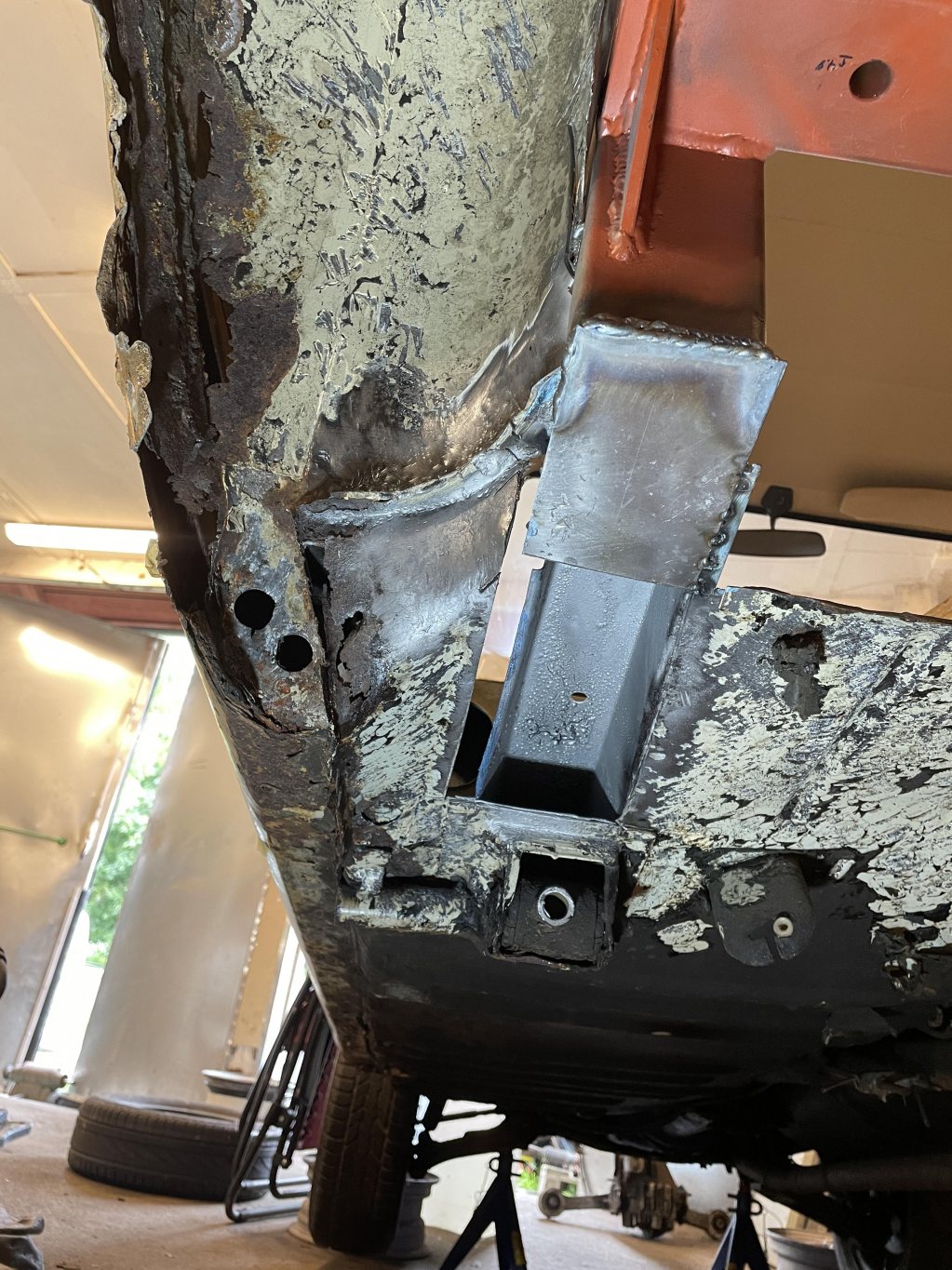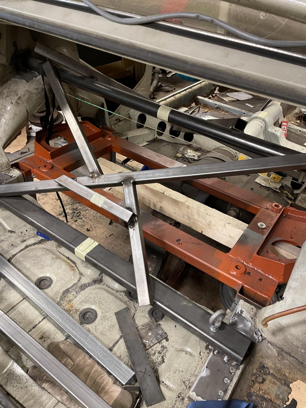 A-stolparna gick från 0mm godstjocklek (aka, bortrostade) till 2.5mm då jag hellre tar i än att bilen viker sig. I farten följde trösklarna med, det var inte möe kvar att kalla tröskel, men de var iallafall orörda. Jämnför jag med tidigare karosser, var detta en dans på blomsterängar. Lirkade in 40x80 balk i trösklarna för att aggera en stabilare ram. Gjorde detta med yttre orginalmått i beaktning, trösklarna behåller orginalutseendet. Fortsatte med hjulhuset & innerskärmen i samma veva, escort mk1 bubbelskärmar ska sättas på så de togs upp till en passande höjd.