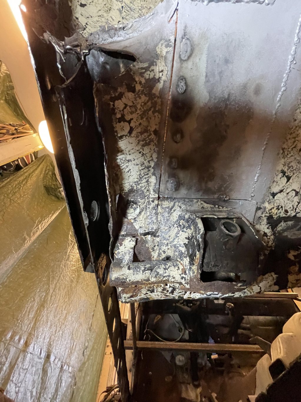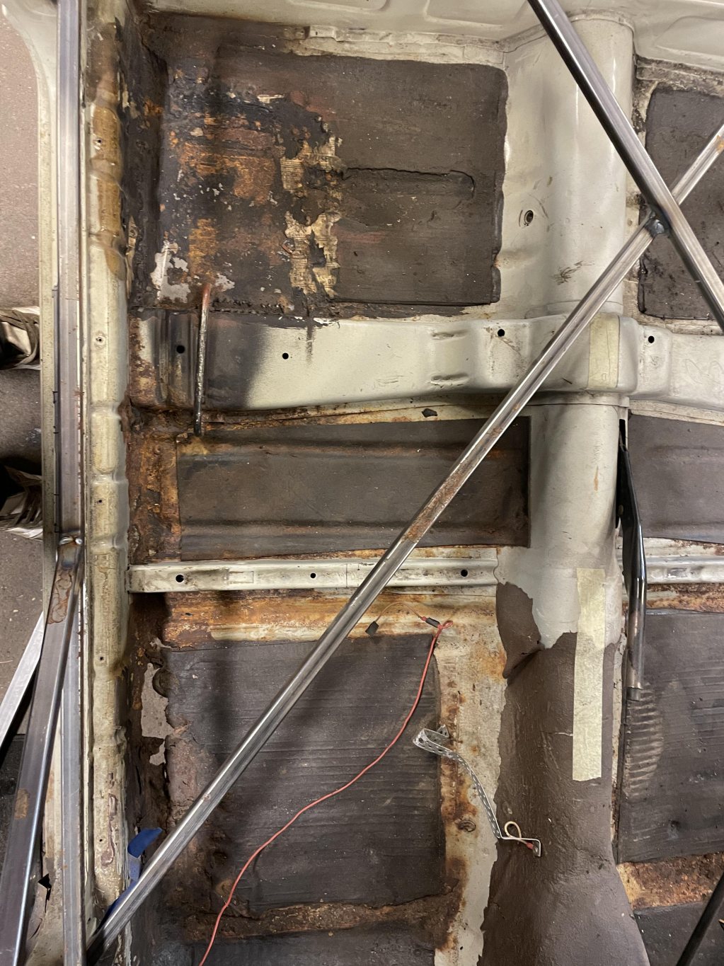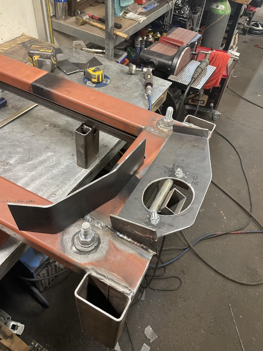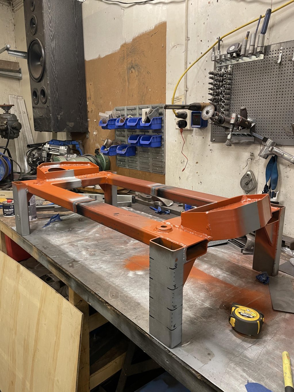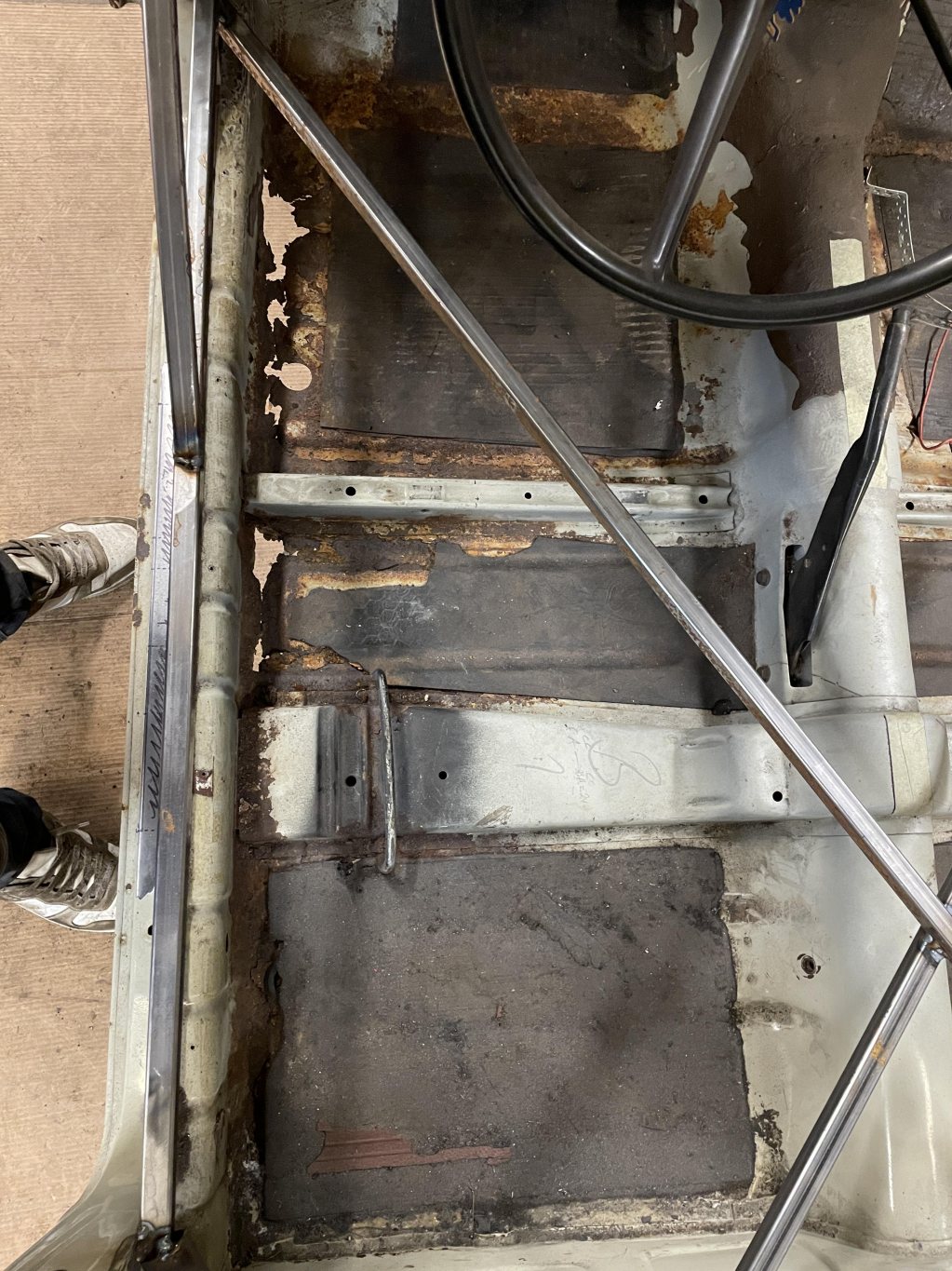 A-stolparna gick från 0mm godstjocklek (aka, bortrostade) till 2.5mm då jag hellre tar i än att bilen viker sig. I farten följde trösklarna med, det var inte möe kvar att kalla tröskel, men de var iallafall orörda. Jämnför jag med tidigare karosser, var detta en dans på blomsterängar. Lirkade in 40x80 balk i trösklarna för att aggera en stabilare ram. Gjorde detta med yttre orginalmått i beaktning, trösklarna behåller orginalutseendet. Fortsatte med hjulhuset & innerskärmen i samma veva, escort mk1 bubbelskärmar ska sättas på så de togs upp till en passande höjd.