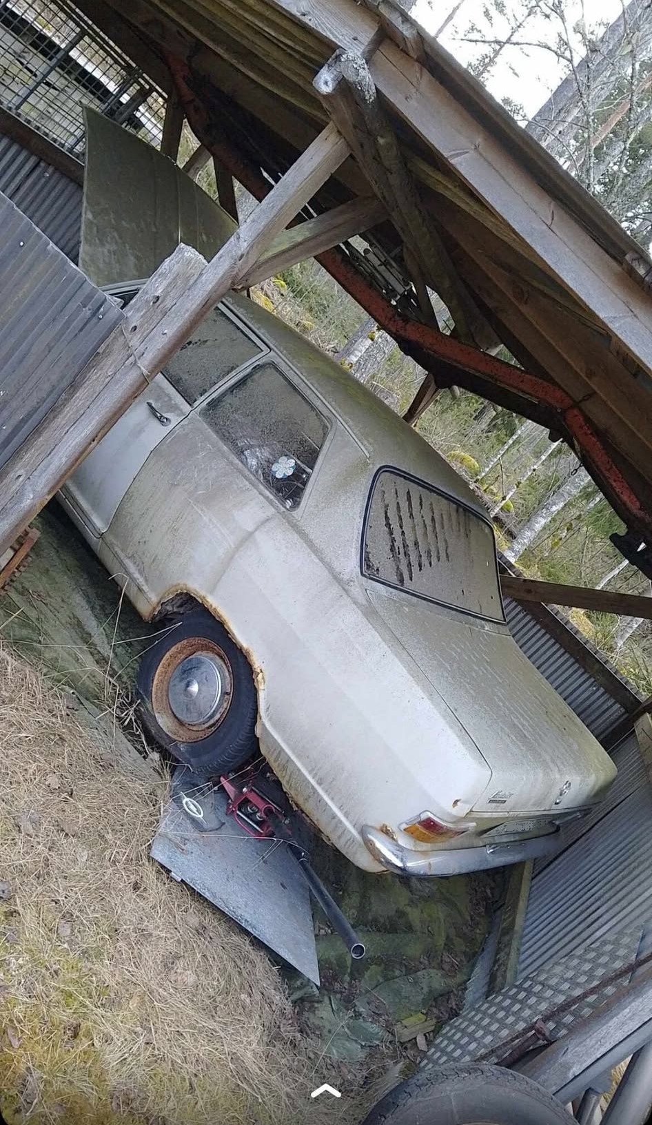 Här började processen att baxa ut den. Lugnt och fint, skjulfanskapet verkade platsbyggt runt bilen så tight som det var. Men ut kom den!