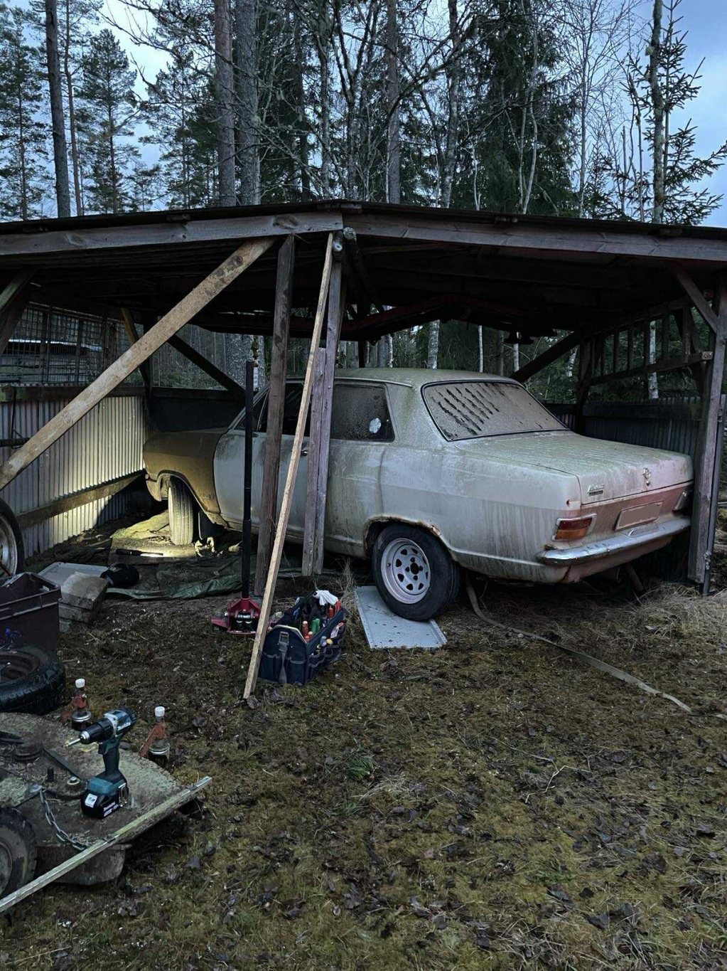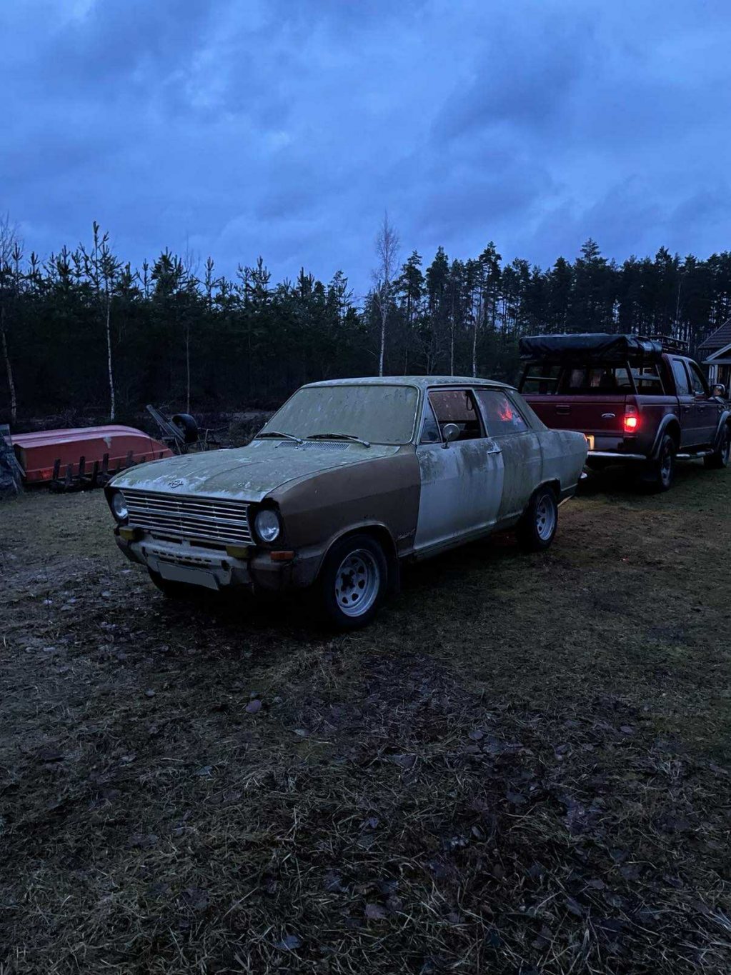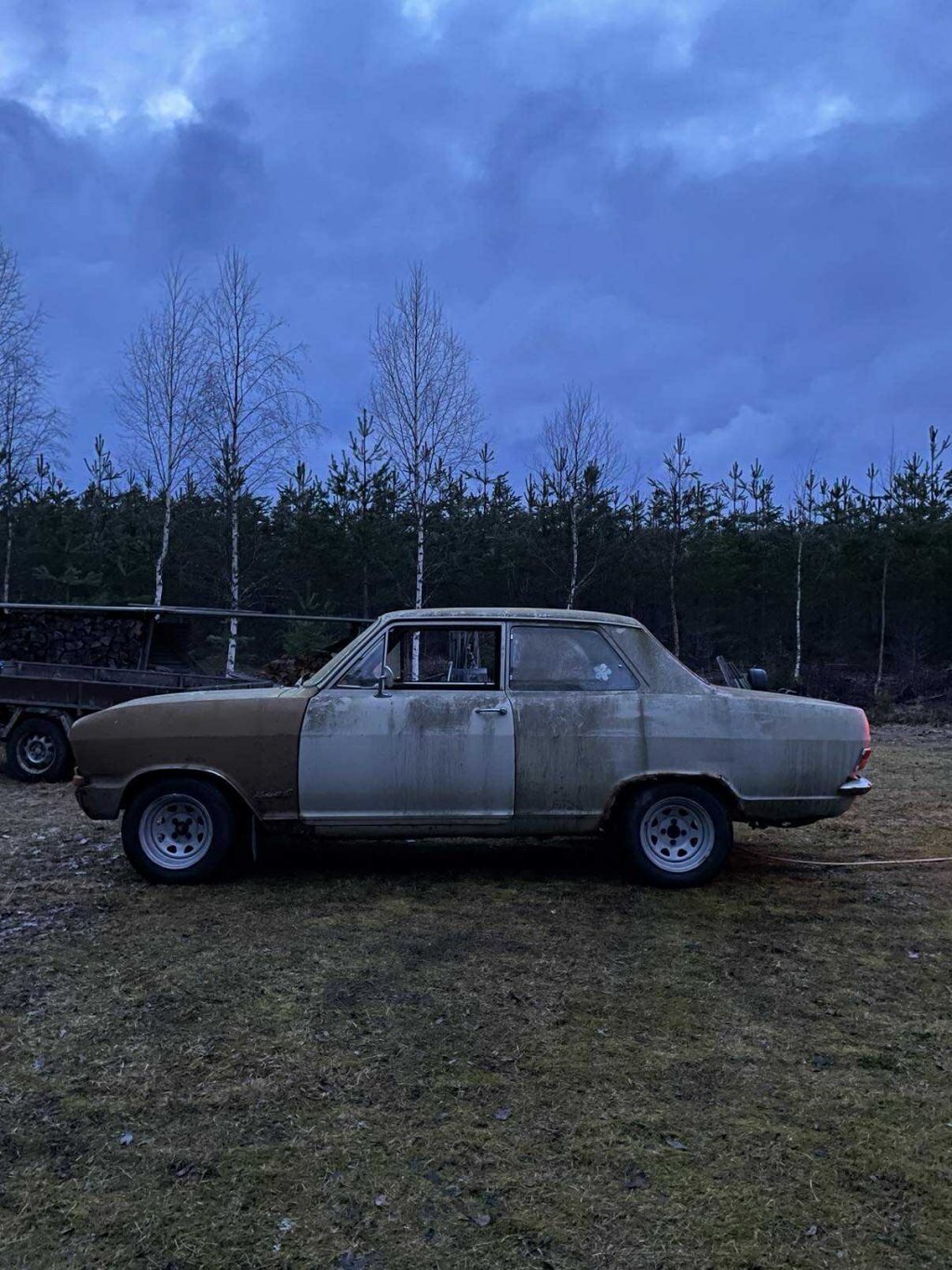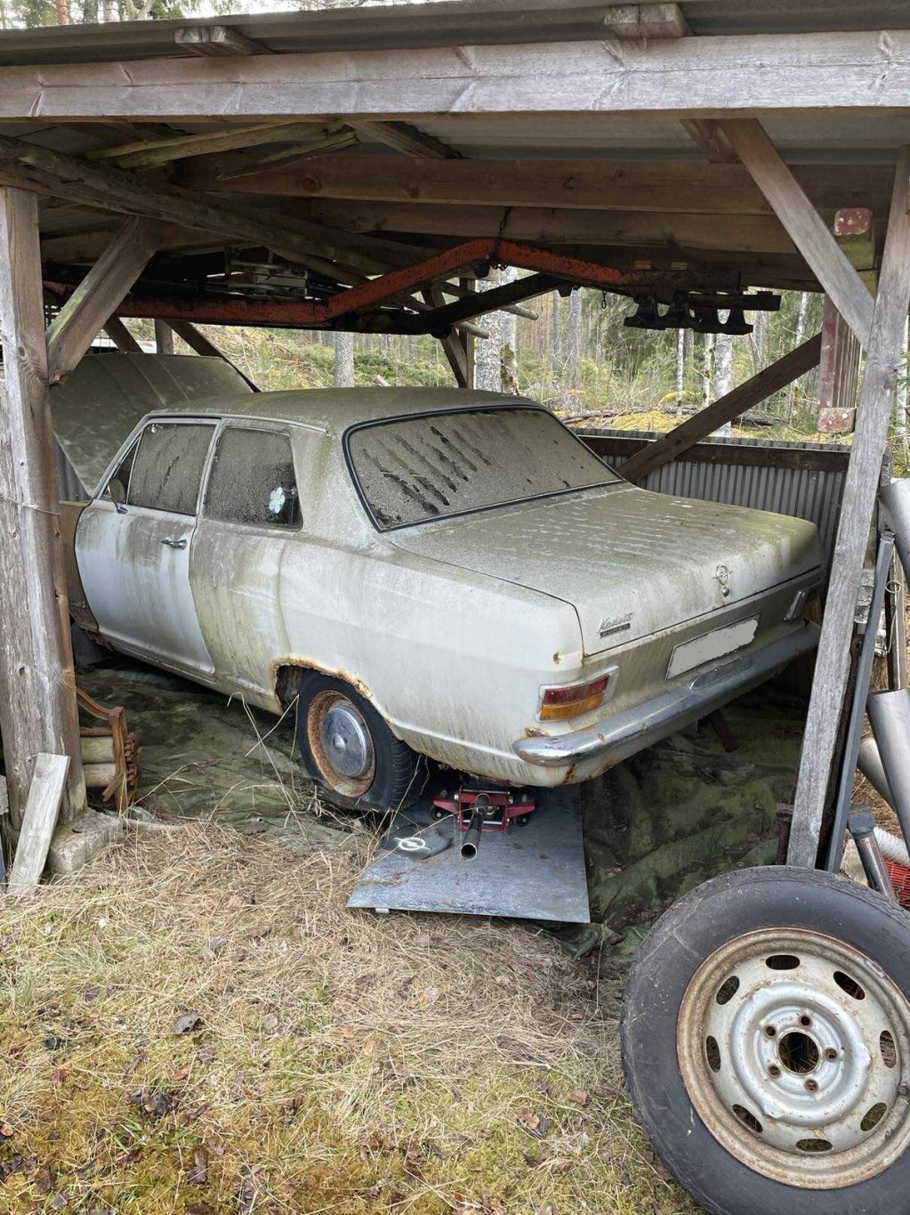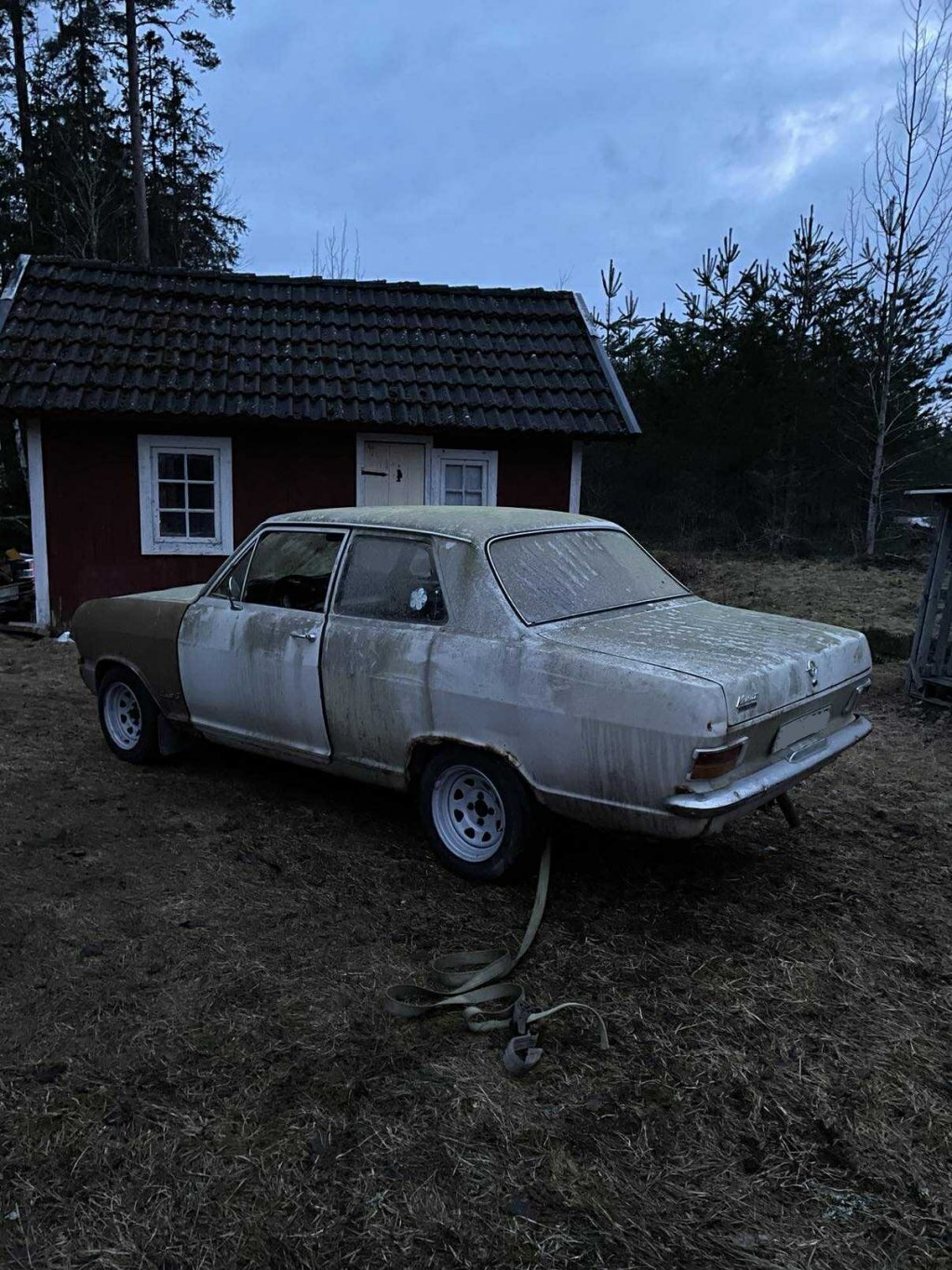 När då röda kadettens tid var över, fick jag av en händelse nys via en kollega att han visste var det stod en opel sen mitten av 90-talet. Han visste inte modell, men det var en vit opel, i ett skjul ute i skogen runt Finspång, med en PV ram påväg ner i taket. "Han skulle ta en bild påväg hem från jobbet och visa mig dagen därpå. Jodå, nog var det en kadett b som stod där i skjulet! Köp blev på monangen hela 1000:-. Dagen därpå tog jag garagepolarn för att försöka få ut den. Ni får avgöra själva hur fan gubben fått in den där från början