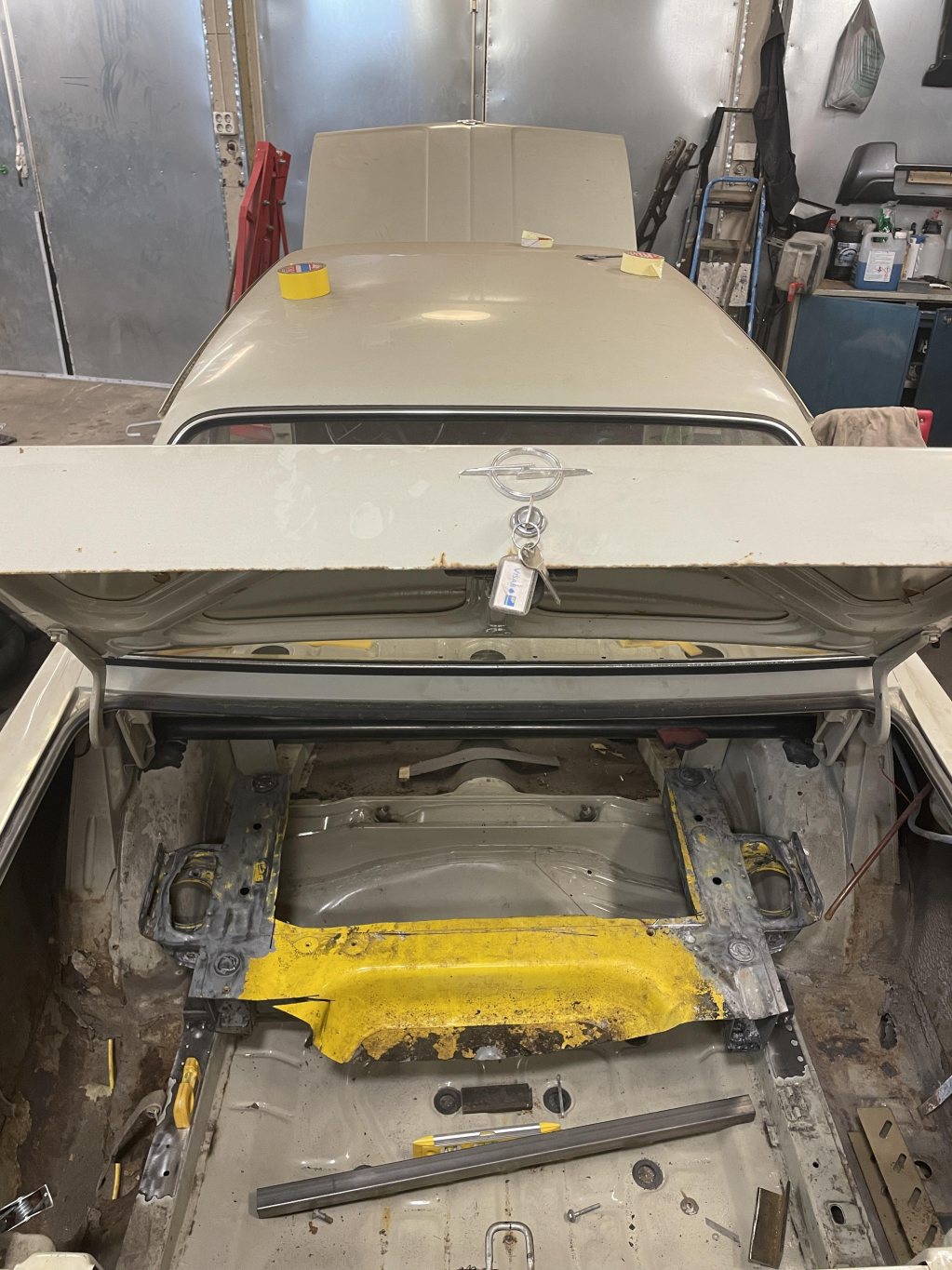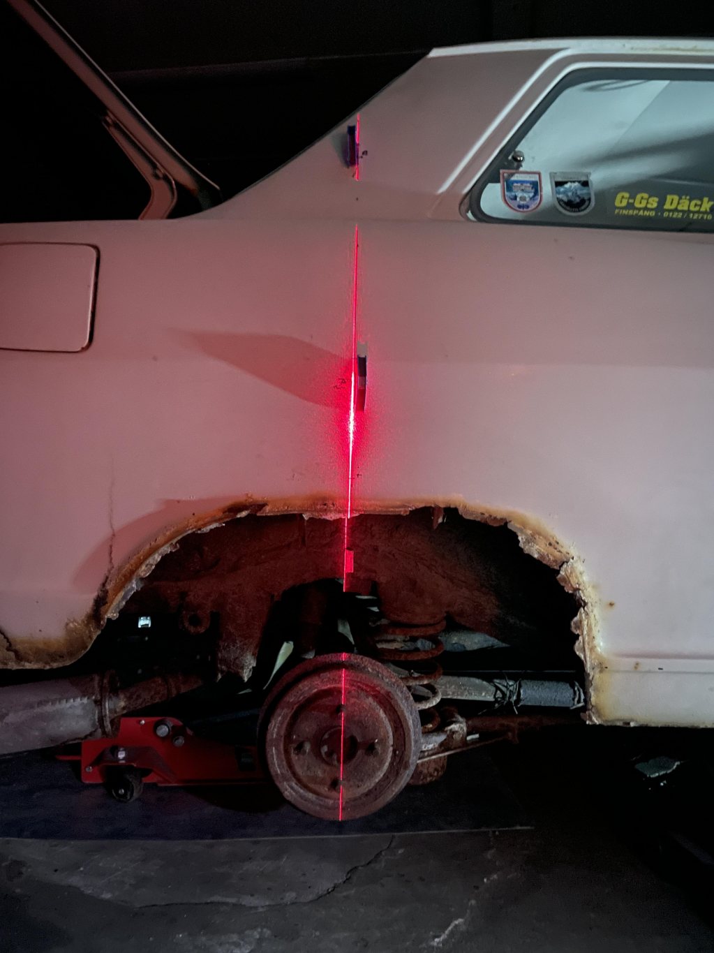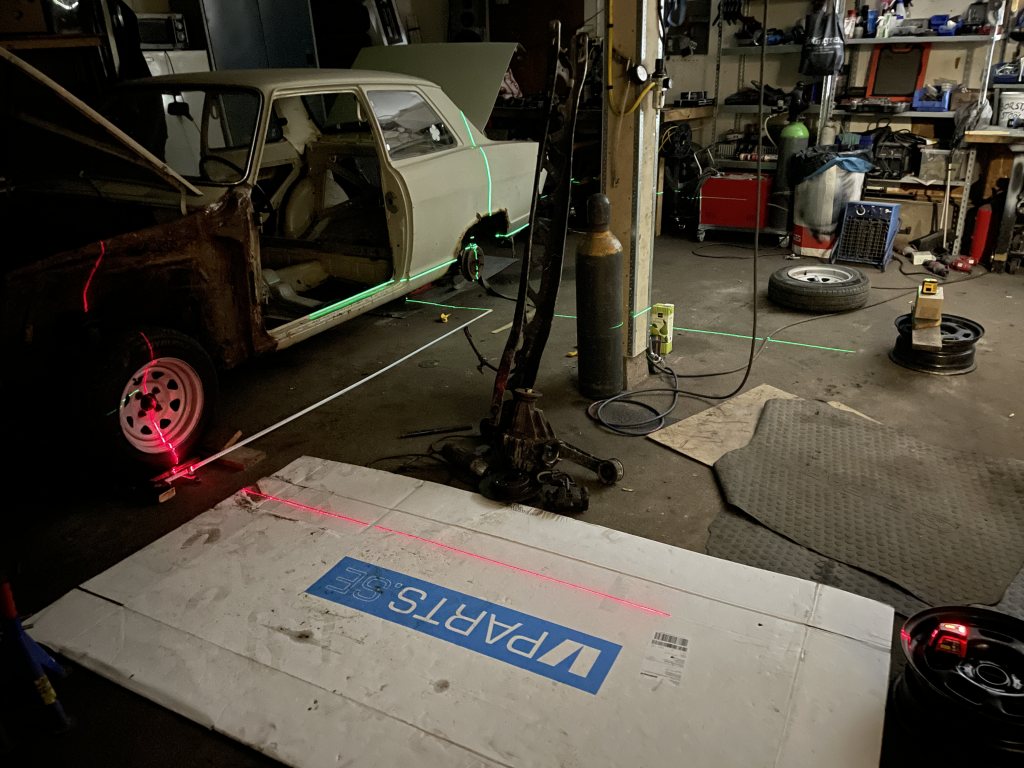 Blev tidigt klart att det var bättre fortsätta bygget på den nya karossen, även om den bara va tänkt till reservdelar från början. Visst var den som alla kadetter rostig på sina ställen, men inget nytt, dessutom var det bara yttre plåt som redan fanns att ta från kaross 2. Den nya tar sin plats i garaget för inmätning med laser, markera en sjuhelskottas massa referenspunkter och linjer för vad som komma skall. Landat i Bmw drivlina & framvagn, mazda mx5 bakvagn.