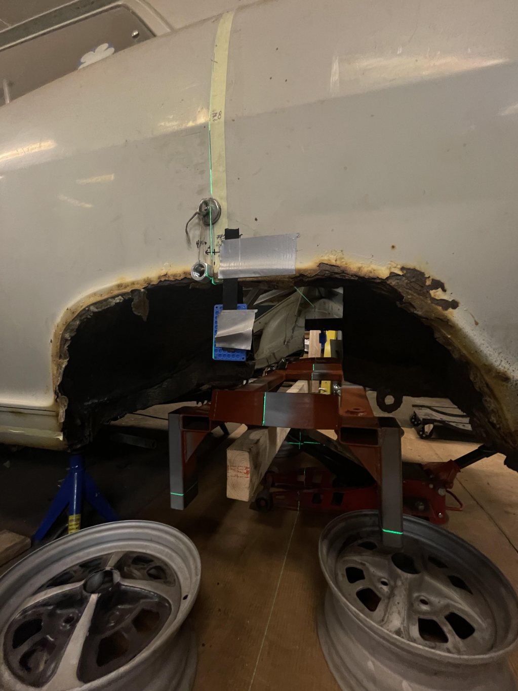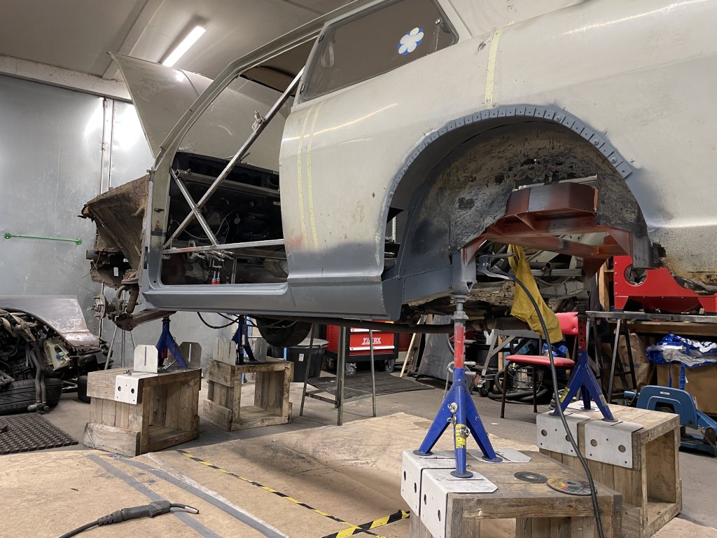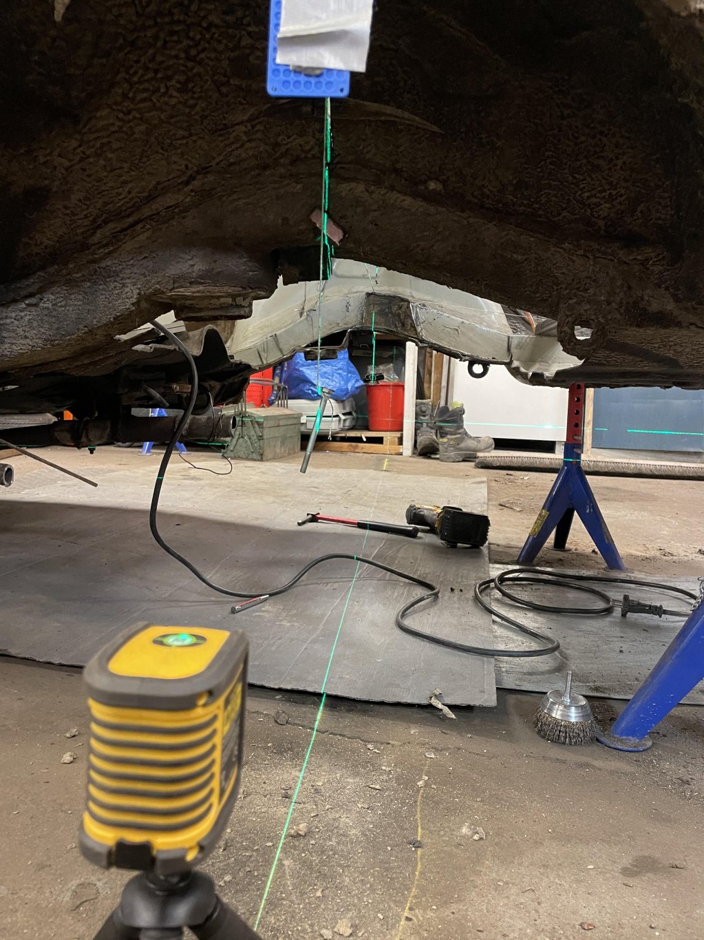 Blev tidigt klart att det var bättre fortsätta bygget på den nya karossen, även om den bara va tänkt till reservdelar från början. Visst var den som alla kadetter rostig på sina ställen, men inget nytt, dessutom var det bara yttre plåt som redan fanns att ta från kaross 2. Den nya tar sin plats i garaget för inmätning med laser, markera en sjuhelskottas massa referenspunkter och linjer för vad som komma skall. Landat i Bmw drivlina & framvagn, mazda mx5 bakvagn.