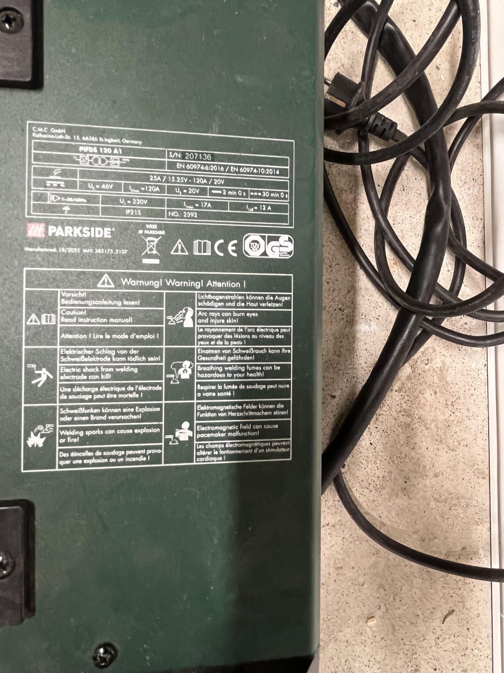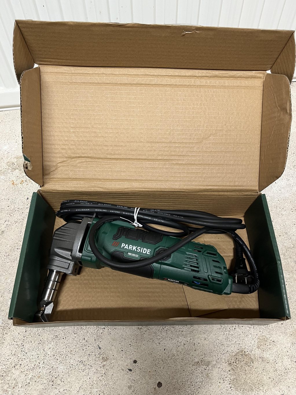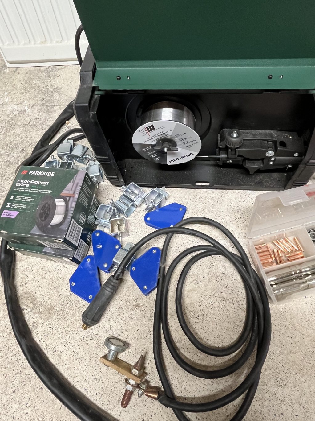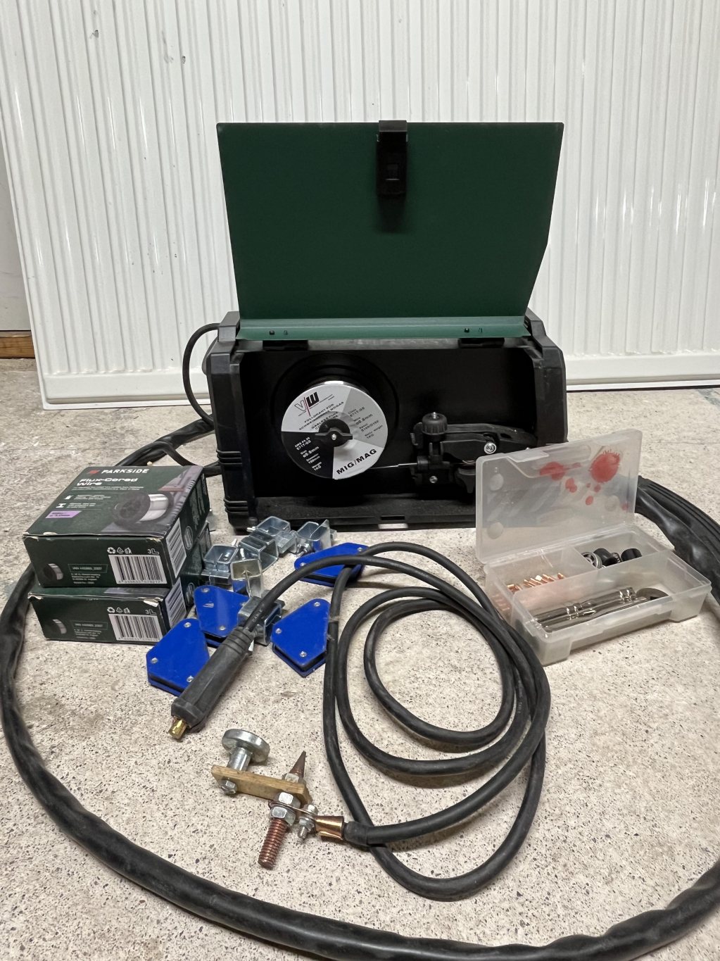1. Parkside Mig-svets. Enkel men förvånansvärt duglig, speciellt med den tråd som sitter i, som sprutar väldigt lite. Tillbehör i form av flera rullar svetstråd, svetsklämmor, svetsmagneter och nya munstycken ingår. 999 kr 2. Svetshjälm 3M speedglass. Riktigt bra hjälm med flera känslighetslägen för att säkerställa pålitlig detektering av svetsbågen och och flera täthetsgrader. 1299 kr 3. Parkside Nibbler, aldrig använd. 299 kr 4. Vevor tumlare. Använd med bra resultat för att rengöra smutsiga och rostiga skruvar och beslag. 399 kr 5. Ryobi vinkelslip utan batteri eller laddare. 349 kr 6. Två tryckluftsverktyg. En vinkelkap från Parkside och en rakslip från Ryobi. 199 kr för Parkside och 249 kr för Ryobi.