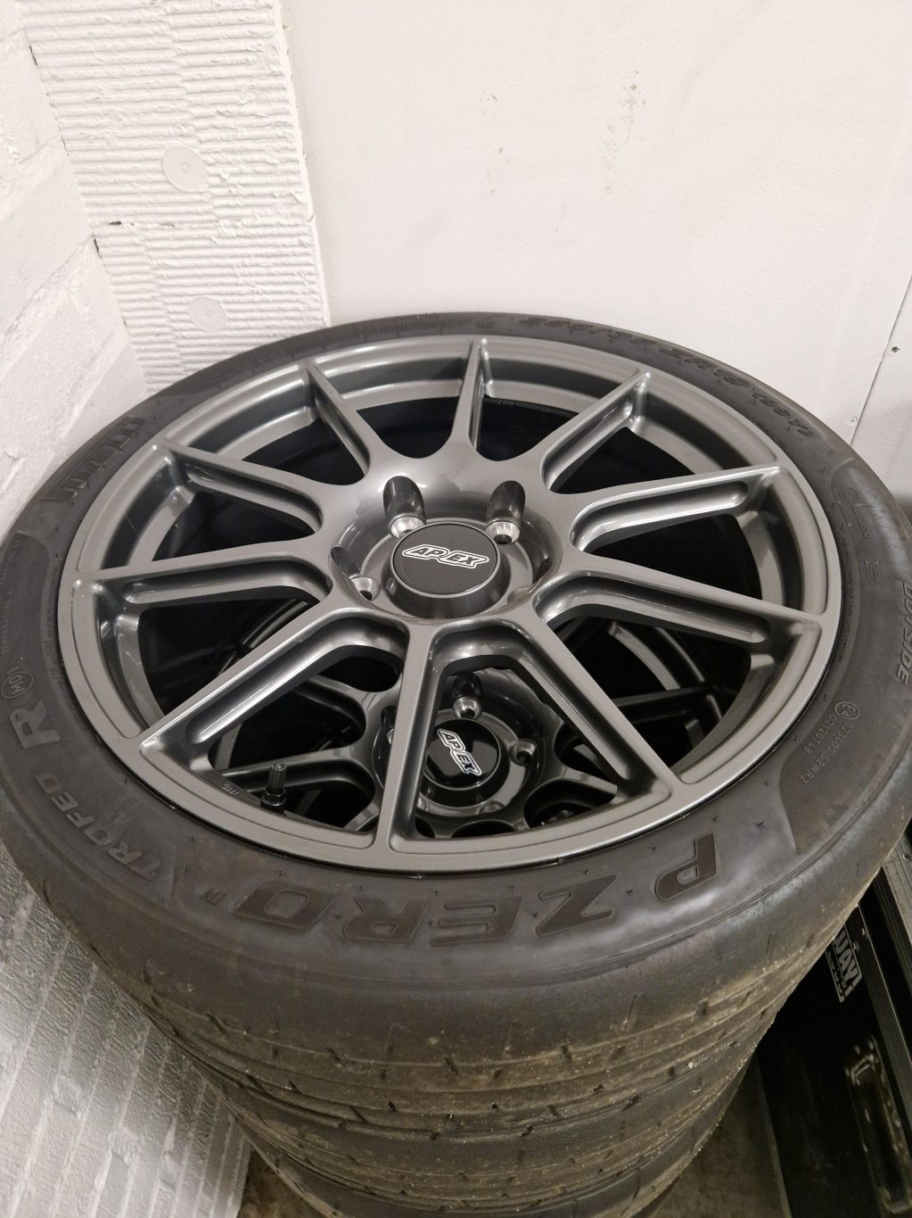 Bakfälgar 19x11 ET45 med helt oanvända Pirelli Trofeo R 285/35 19 (mäter man dessa har de fysiskt samma bredd som deras 295or).