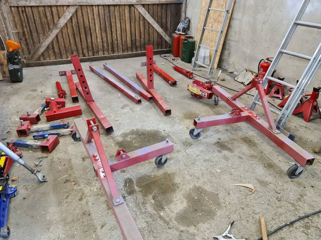 Då jag börjar få platsbrist hade jag tänkt att sälja min karossvagga med snäckväxel. Köpte den här till ett projekt för närmare tio år sedan, men fick aldrig tummen ur att sätta igång med den renoveringen och har således aldrig ens monterat upp en bil i den. Utan den har fått ligga på lagret och vänta på rätt projekt. Den tidigare ägaren byggde custombilar av jänkartyp (dvs, tunga klossar) och ställde ut på Elmia (och hade dessutom vunnit) och han var tvärnöjd med den. Minns att det inte gick att pruta ett öre... Märket är Pela, men karossvaggan har utgått ur sortimentet sedan dess. Den stora finessen med just denna (och vilket är anledningen till att jag köpte den) är att den har en "steglös" snäckväxel som gör att du kan ha bilen i exakt vilket läge som helst (och lätt kan snurra runt den för hand). Har även de vanliga hydraulkolvarna för att lyfta osv. Det verkar var EXTREMT svårt att hitta något liknande idag, så jag vet inte exakt vad de kostar. Om jag inte missminner mig (men tar ej gift på detta) så har jag för mig att nypriset för tio år sedan var runt 19'995:-. Bifogar en bild på delarna när jag hade hämtat hem den (får plats i uppstyckat tillstånd i en Volvo V70!).