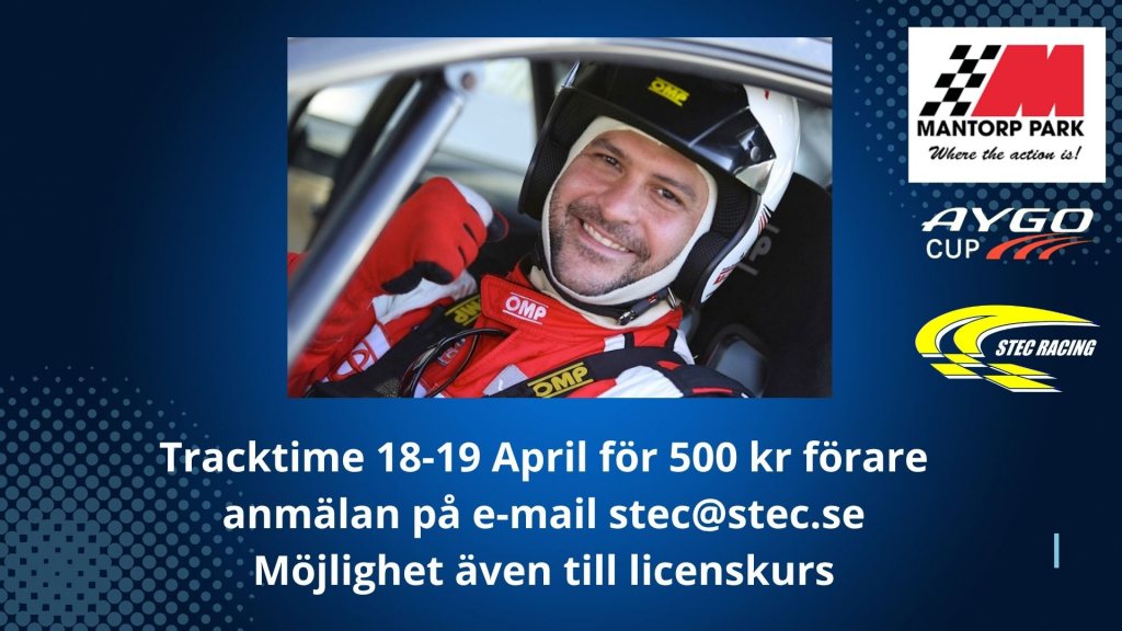 Nu börjar konceptet Tracktime 2026 Vi provar detta för 500 kr per förare och det går ut på att åka till racingbanan. Få köra 60 minuter och sen åka hem som en lycklig förare. Enkelt smidigt lätt med tidtagning på banan osv. 500 kr gäller både 18+19 april som ett första test. anmälan sker på e-mail stec@stec.se Tävla gör vi naturligtvis också med förare som är mellan 16-86 vilket är väldigt kul att kunna presentera "Racing för alla" Alla bilar är välkomna som klarar mantorps 95 db krav.