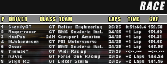 Hade ett rätt intresant race idag och började givetvis med att tjuvstarta och fick mig ett stop and go. Då fick jag börja min upphämtning från 7 plats och kom upp till tredje även om jag putta av kavic som fick komma upp och om igen. Sen kom micke som skjuten ur en kanon och körde om när min uppeldade pirrelidäck inte hade mycket grepp kvar. Sen snurra han och jag kom om igen. En varvning av en lister höll på att ställa till det och då var micke där igen och nosa. Sen på slutet tog jag in väldigt på roger racer och ett varv till och jag skulle kommit om men jaja. _________________ Thomas Tegbäck |