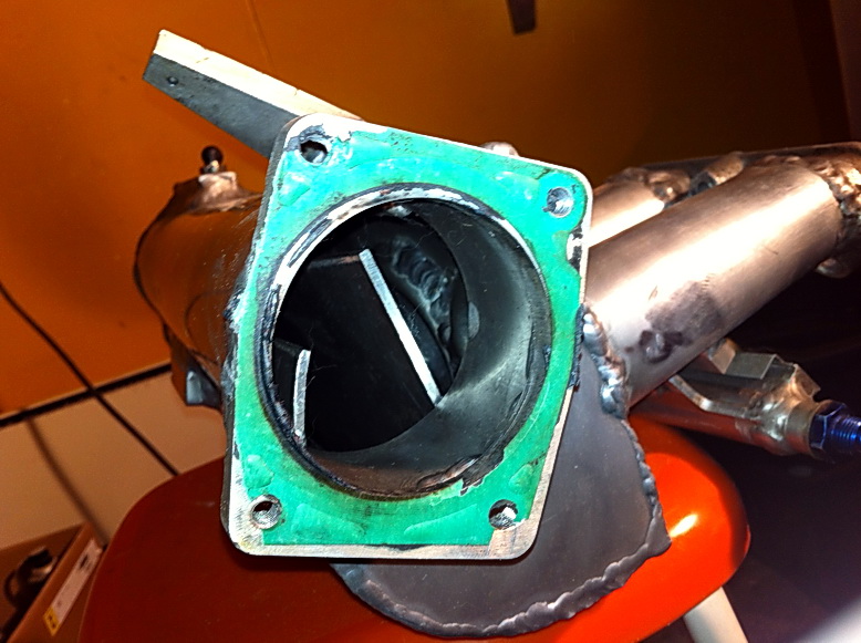 Troligen främst därför att luften tas in från sidan av tratten. Kan också vara för att få en jämn fördelning av luft mellen de fyra, annars brukar ofta det flöda bäst längst bort. Tredje anledning kan vara att dra fördel av reflektionspulsen så går rakt ut - plattan är nära tratten, mindre än trattens diameter.