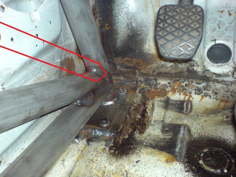 Tänkte bygga ut buren lite då jag sett att det är ganska glest med skydd för knäna sett från sidan, men eftersom bilen även ska klara SBP, vill jag att toyotastagen ska vara demonterbara. Har ingen riktigt bra bild, men nere vid fötterna vill jag ju ansluta typ som jag ritat, dels för att krafterna ska fördelas vidare rätt och för att få bra längd på svetsfogen.