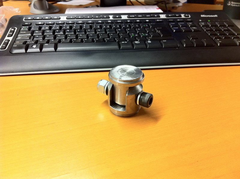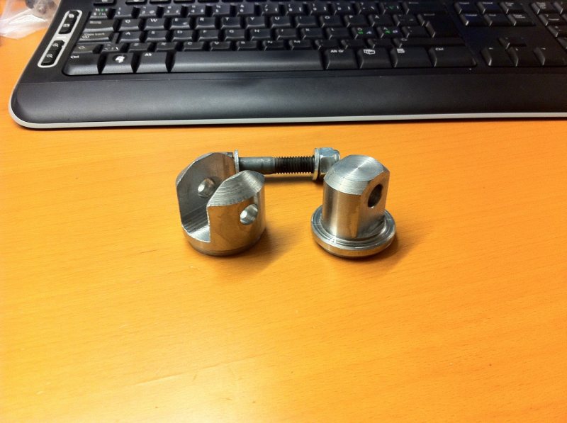 Alltså måste jag ha en permanent monterad rörstump nere vid golvet (och förmodligen uppe vid taket också). Tycker det är döfult med skarvrör med skruvar igenom, så jag ställde mig vid svarven o fräsen lite efter jobbet och fick ihop ett par sånna här... (behöver jag nämna att det tog gaaanska långt tid med en manuell fräs från -58 utan kylvätska...?)