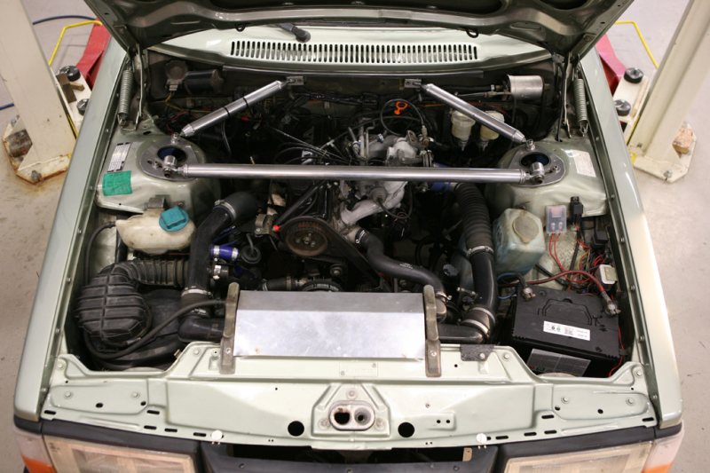 spridare. Laddluftkylare från 740 turbo. Avgassystem 3" hela vägen med en ljuddämpare i rostfritt. Laddar idag ca 1,4 bar och ger uppskattningsvis 300hk med bra register och respons.